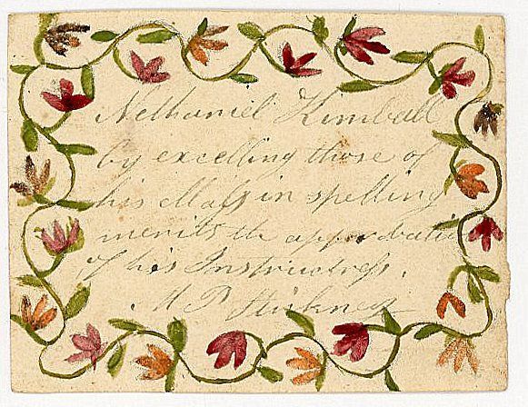 1850. A 2" x 2 1/4" record of merit that reads "Nethaniel Kimball by excelling those of his class in spelling merits the approbation of his Instructor - M. P. Stickney. Delicate watercolor border decoration with eternal vine and purple and pink flowers.