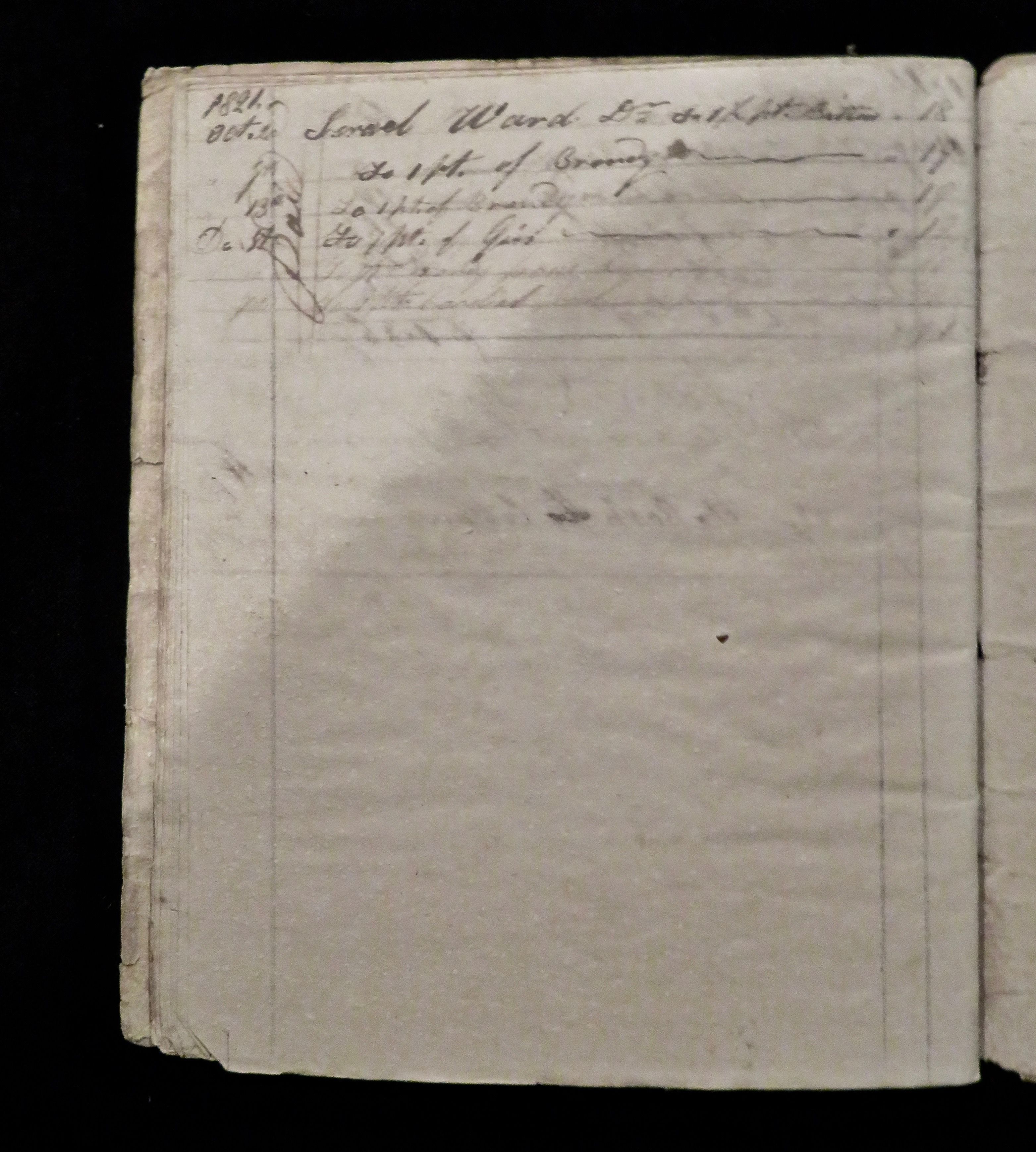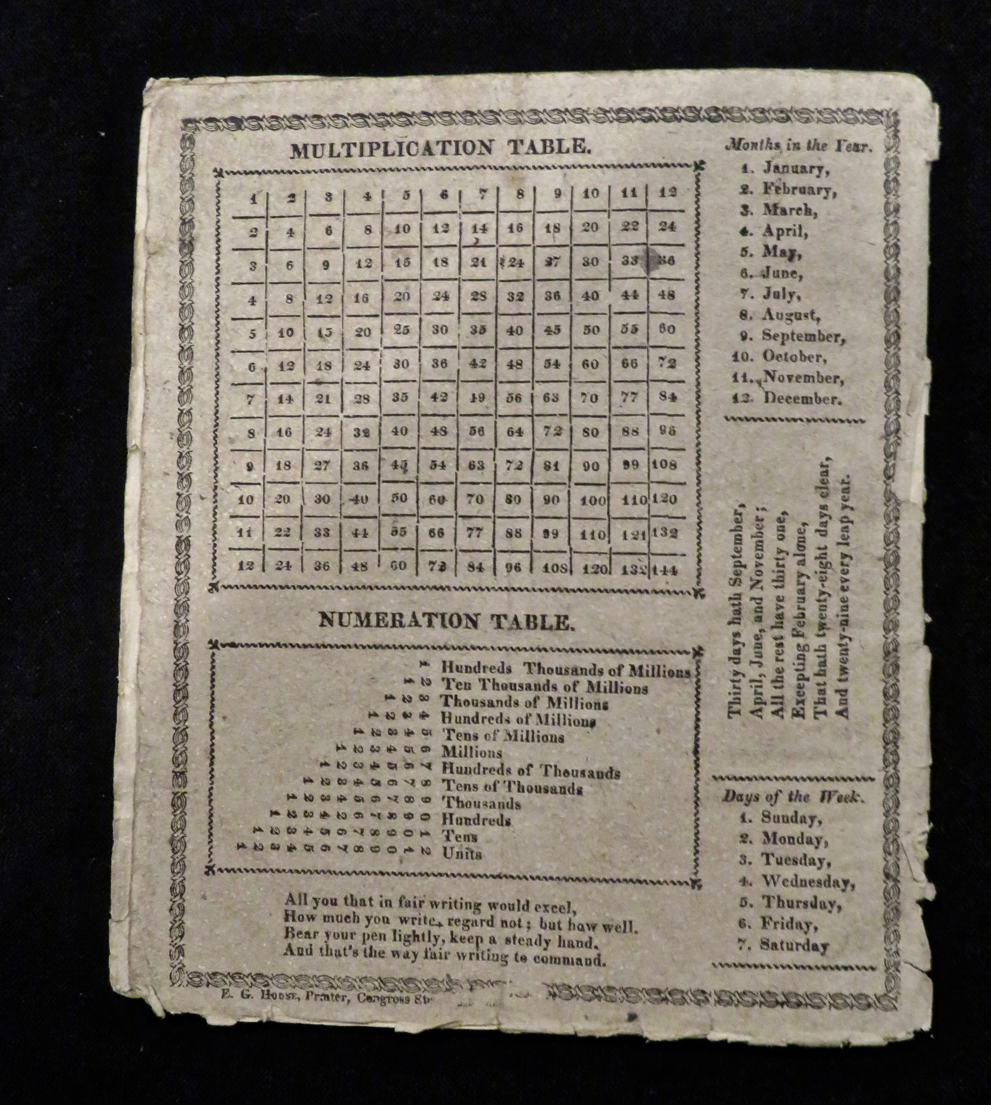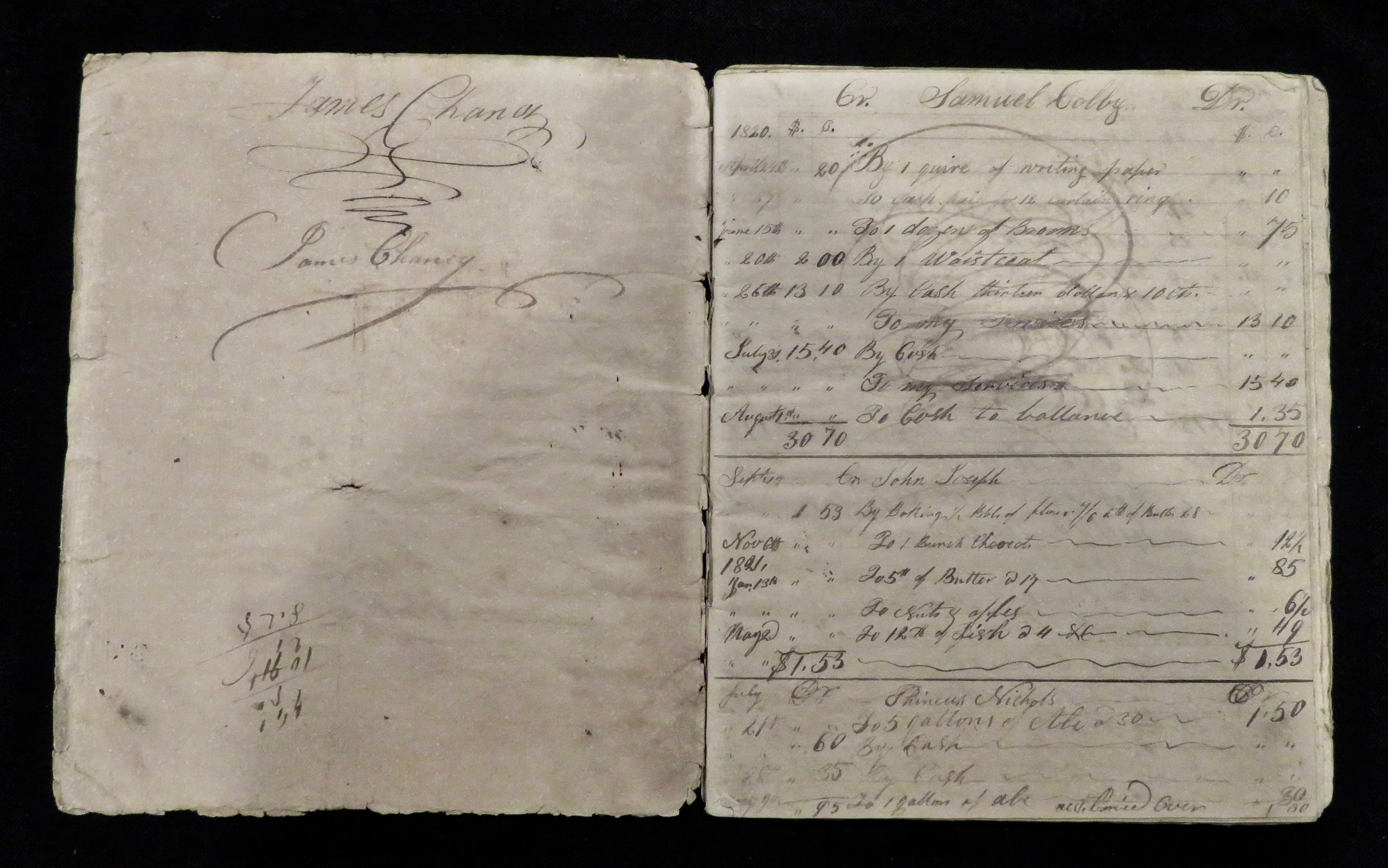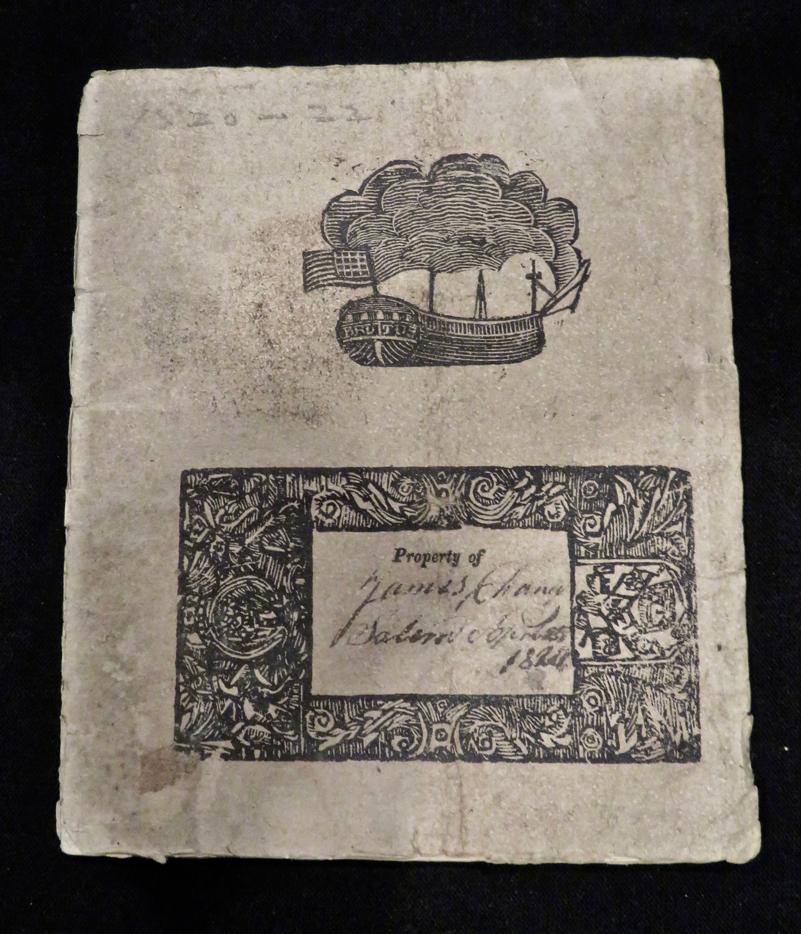 Salem, MA: E. G. Hoose, 1820-1823. James Chancy was a grocer in Salem who used this copy book to keep an accounting of his customer's purchases between 1820-1823. For each entry Chancy lists the name of the customer, under which lists the date and items purchased. Sometimes it also records when he was paid, normally in cash. Sometimes the pages have been crossed out with an X, the reason for this is unknown, but perhaps it meant the account was closed. The front cover has two woodcut engravings. The first is a ship with clouds. The second is an intricate decorative device surround the bookplate. - The back cover has a multiplication and numeration table on it. As well as a list of the days in a week, and months in year. Additionally is the saying:"All you that in fair writing would excel,How much you write, regard not, but how well.Bear your pen lightly, keep a steady hand,And that's the way fair writing to command."Brown covers, 46 pages. Printed by E. G. Hoose. Half-filled. No OCLC, Feb 2019. Measures 7 1/2" x 6 1/4"