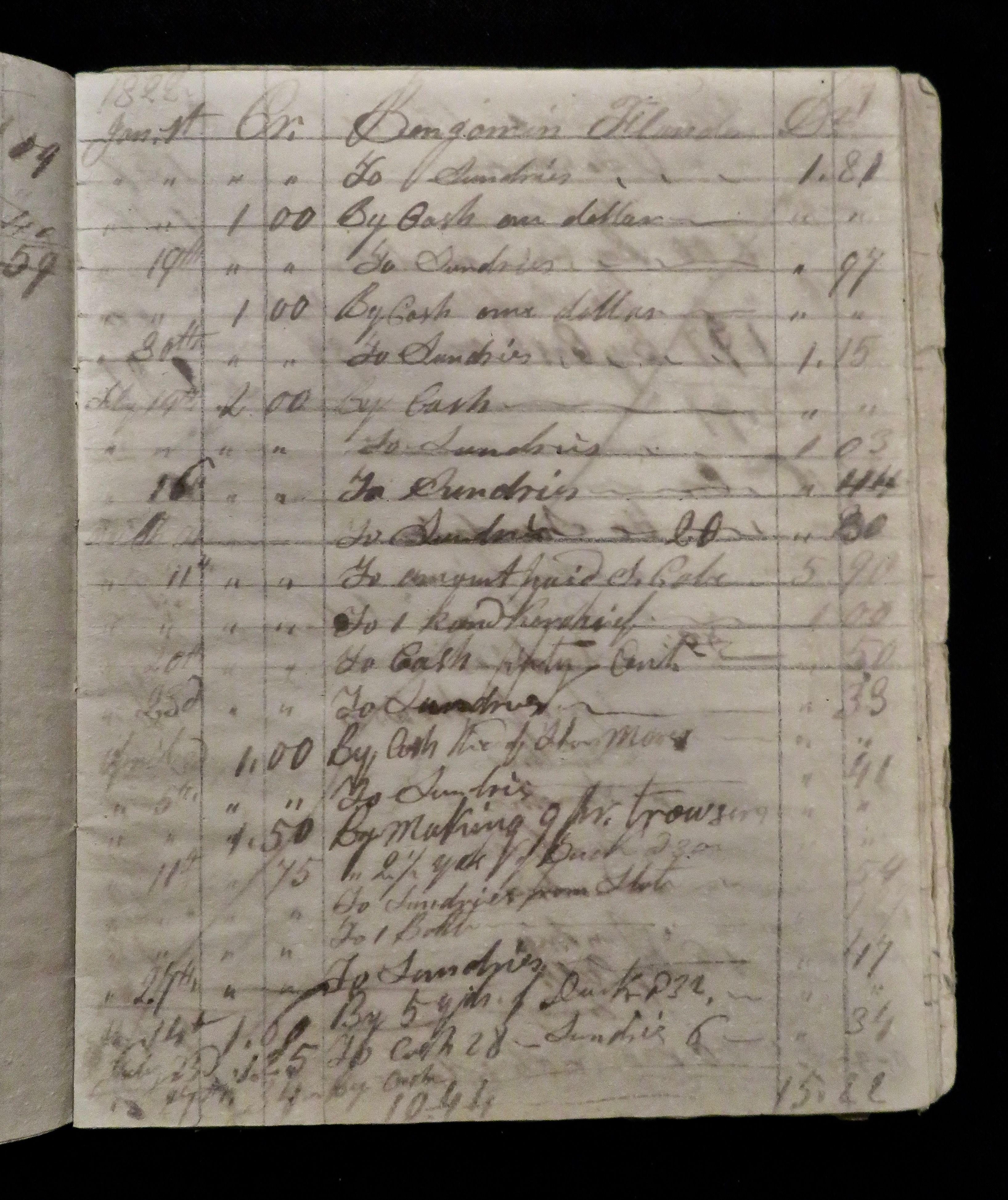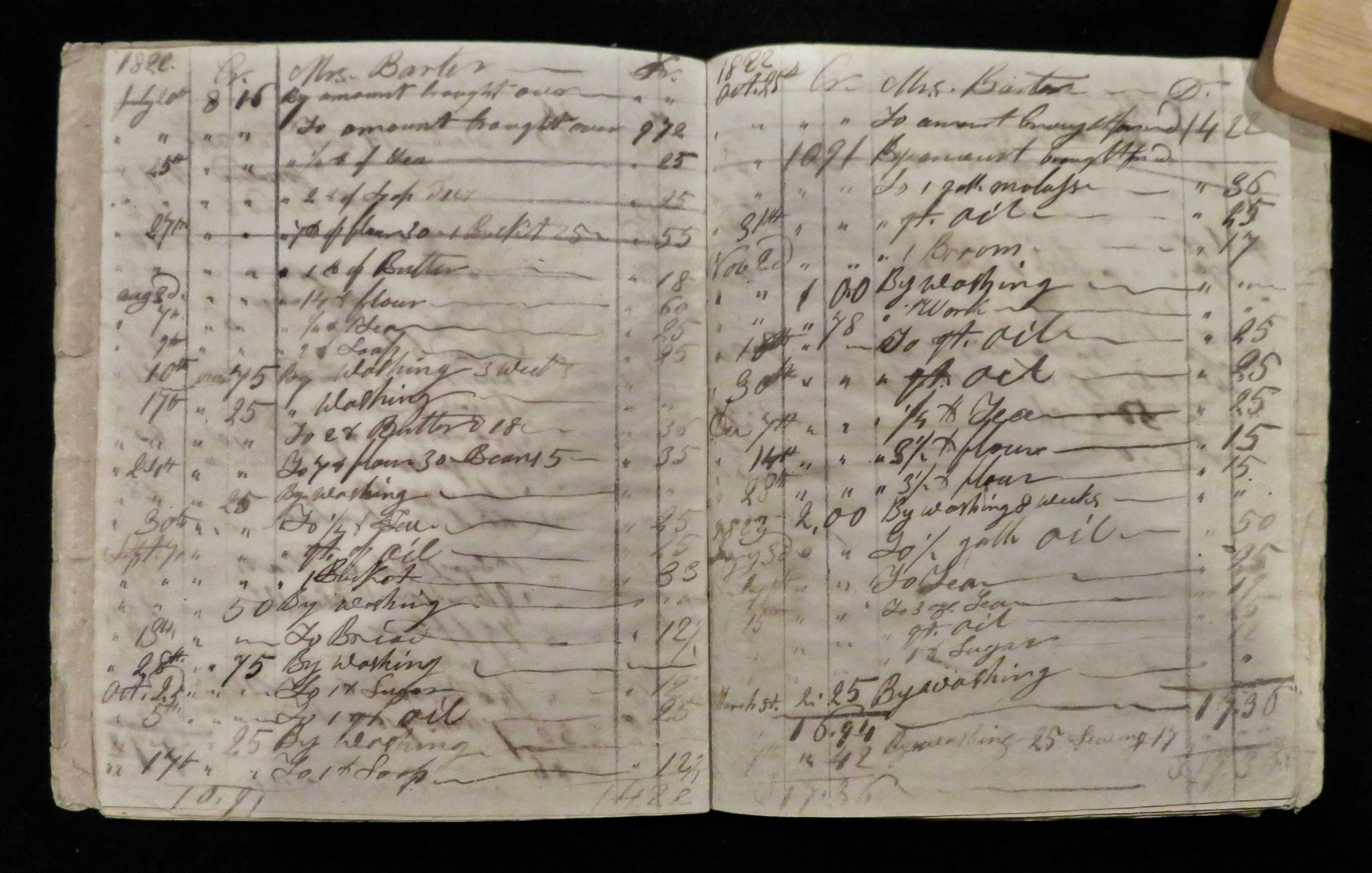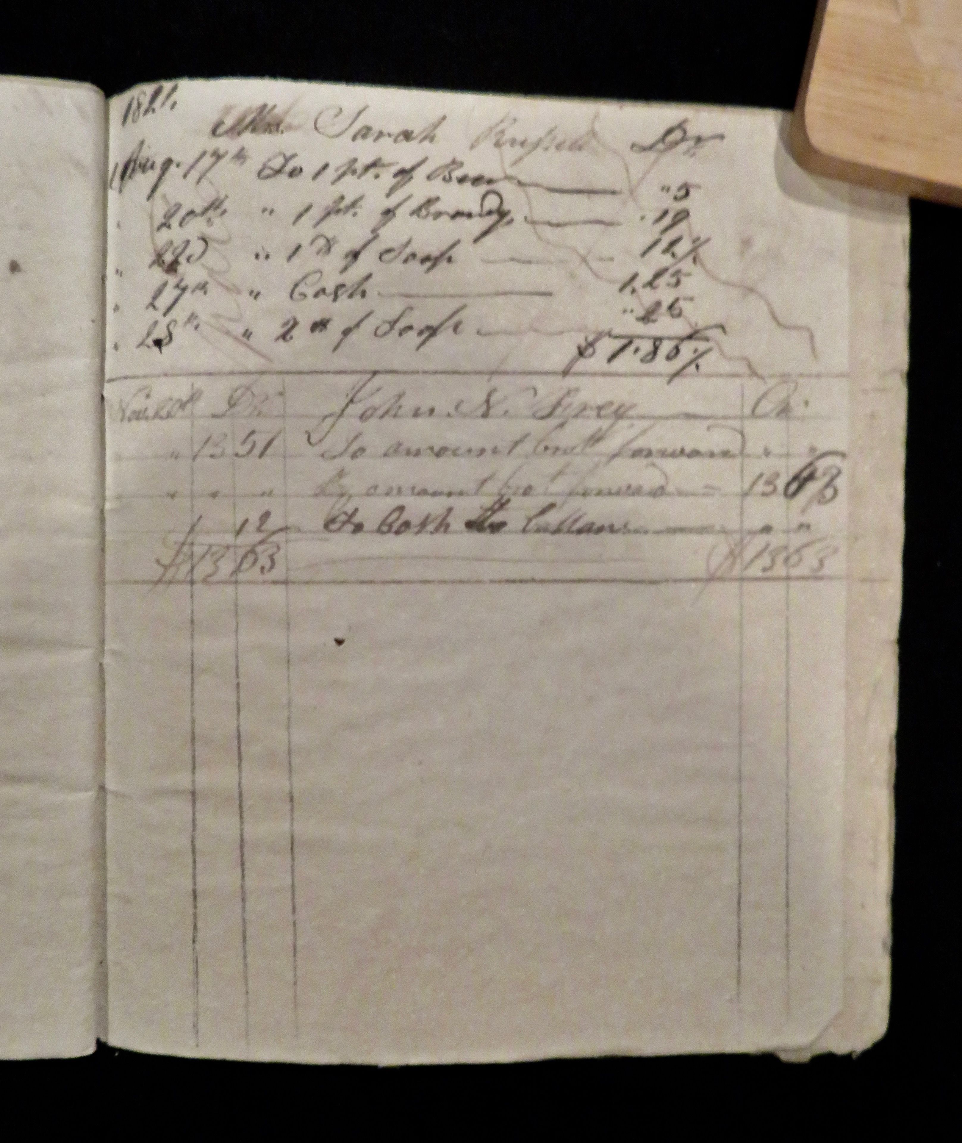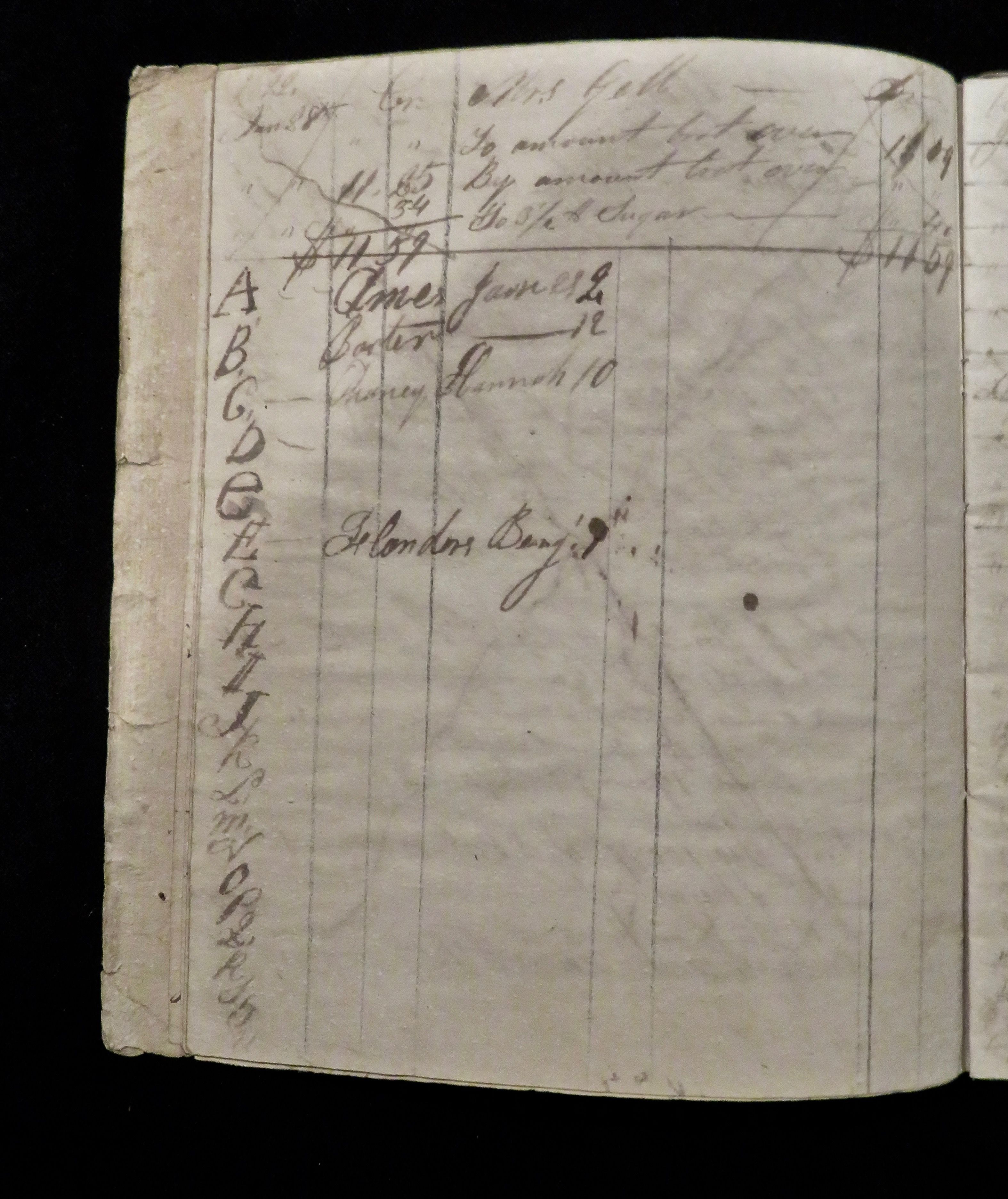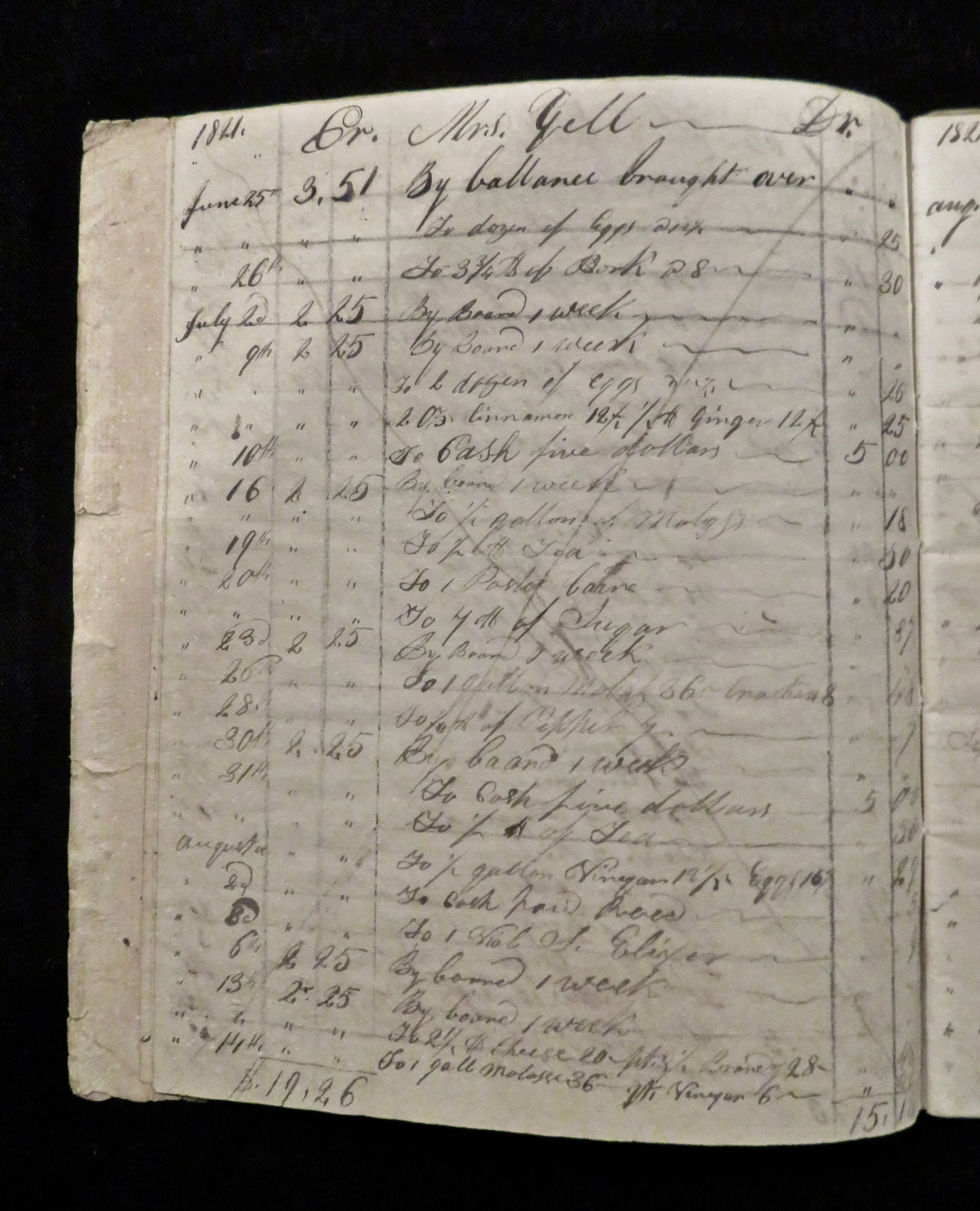 Salem, MA: E. G. Hoose, 1820-1823. James Chancy was a grocer in Salem who used this copy book to keep an accounting of his customer's purchases between 1820-1823. For each entry Chancy lists the name of the customer, under which lists the date and items purchased. Sometimes it also records when he was paid, normally in cash. Sometimes the pages have been crossed out with an X, the reason for this is unknown, but perhaps it meant the account was closed. The front cover has two woodcut engravings. The first is a ship with clouds. The second is an intricate decorative device surround the bookplate. - The back cover has a multiplication and numeration table on it. As well as a list of the days in a week, and months in year. Additionally is the saying:"All you that in fair writing would excel,How much you write, regard not, but how well.Bear your pen lightly, keep a steady hand,And that's the way fair writing to command."Brown covers, 46 pages. Printed by E. G. Hoose. Half-filled. No OCLC, Feb 2019. Measures 7 1/2" x 6 1/4"
