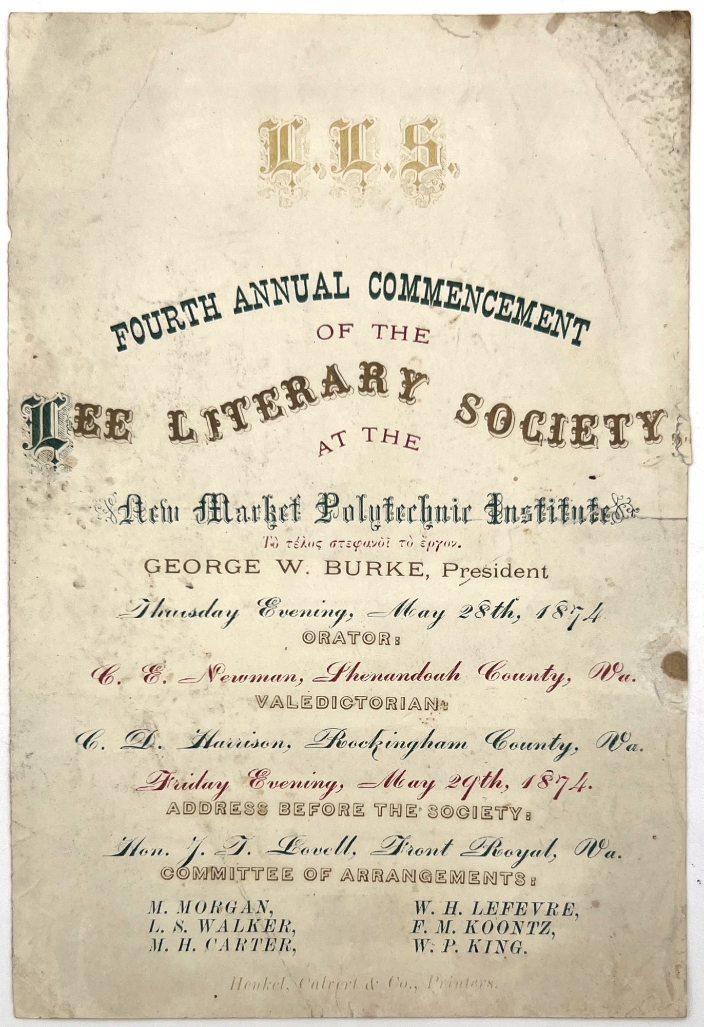 Virginia: Lee Literary Society, 1874. This was a ticket to the annual commencement of the Lee Literary Society, an organization at th New Market Polytechnic Institute in Virginia.