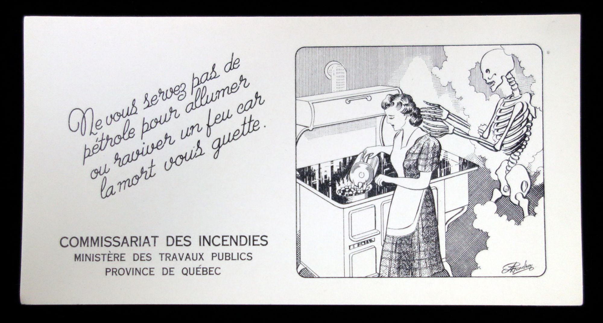 Quebec, Canada: Ministry of Public Works, 1940. Very Good.. A fire-safety postcard distributed by the Ministry of Public Works in Quebec. The blotter is specifically warning against cooking fires. On the right side of the postcard is a black and white illustration of a woman cooking on the stove as she appears to be pouring something into the pan. Behind her, surrounded by smoke, is death (a skeleton) reaching out towards her. On the left side of the card is the phrase "De vous servez pas de petrole pour allumer ou raviver un feu car la mort vous guette", which roughly translates to "Do not use oil to light or rekindle a fire because death is waiting for you." Artist printed signature illegible.