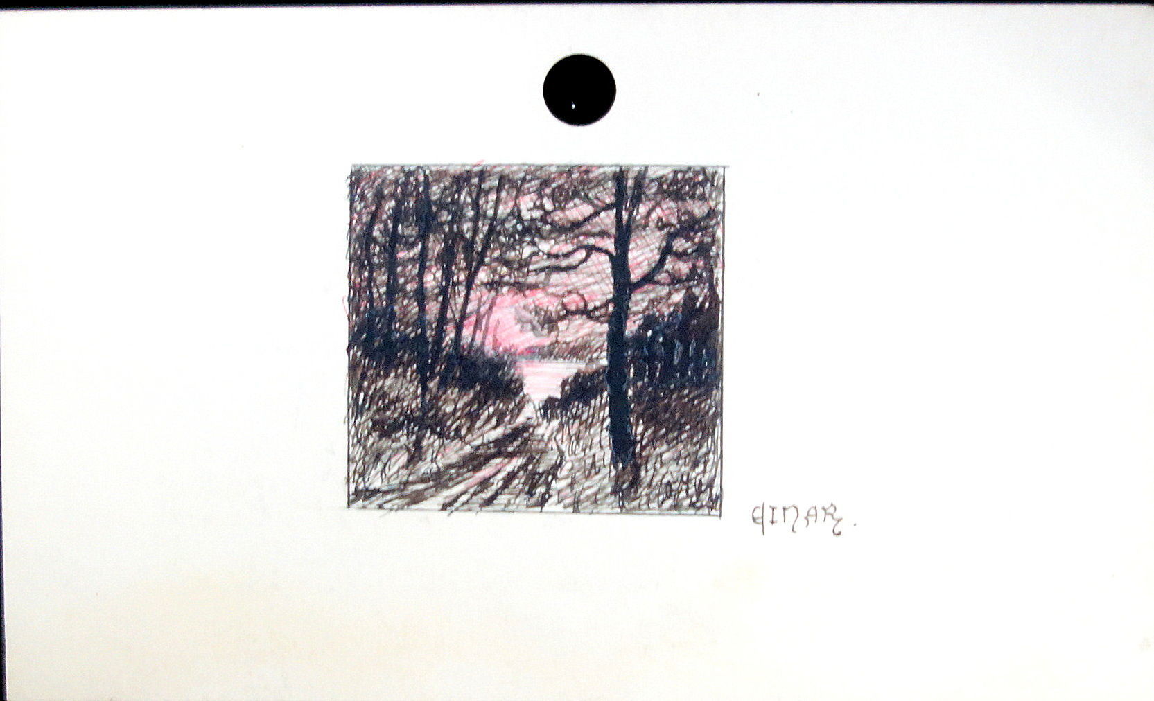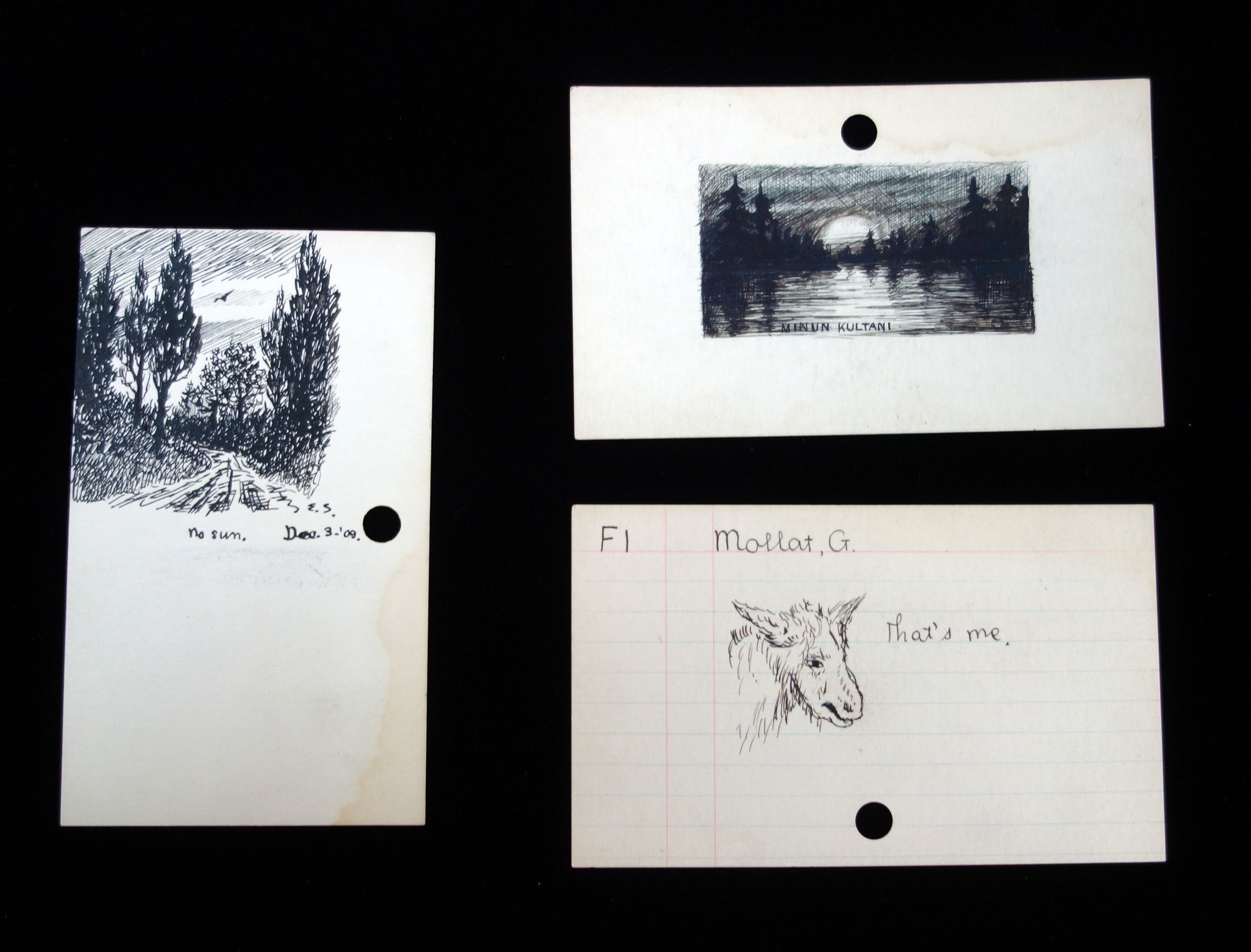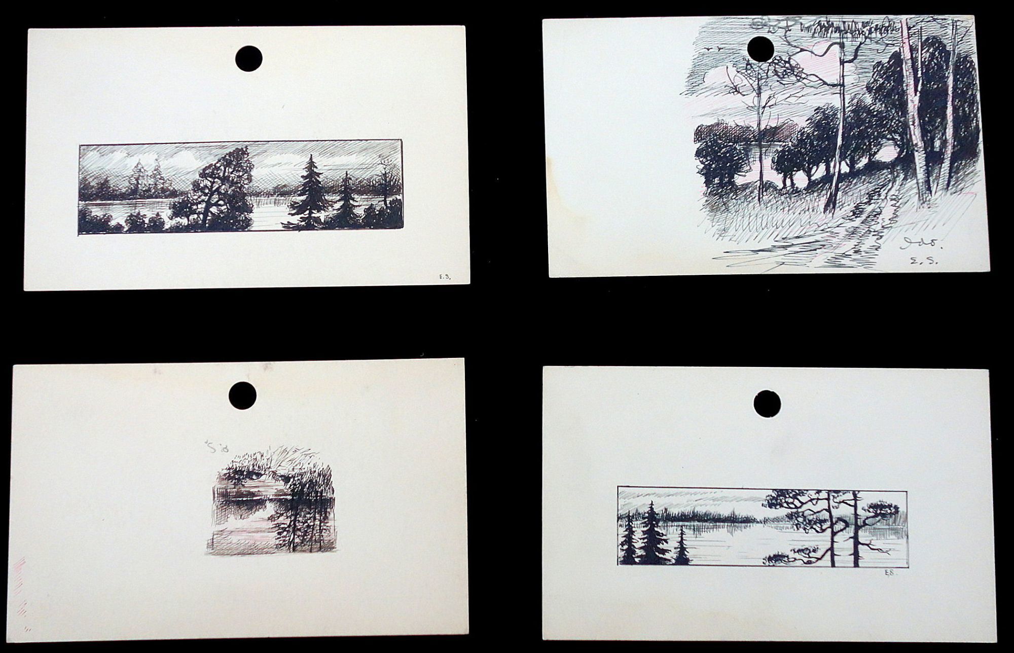 Each illustration in done in black ink, on the blank side of a note card. The majority of the images are of landscape scenes featuring forests, mountains, or lakes. Three of the illustrations have accents of red ink as well. One unique card in this collection depicts on the lined side of the note card, a head of a donkey with the caption, "That's me." Several of the note cards have "Minum Kultani" on them, which is Finnish for "my love". One card features the below quote: