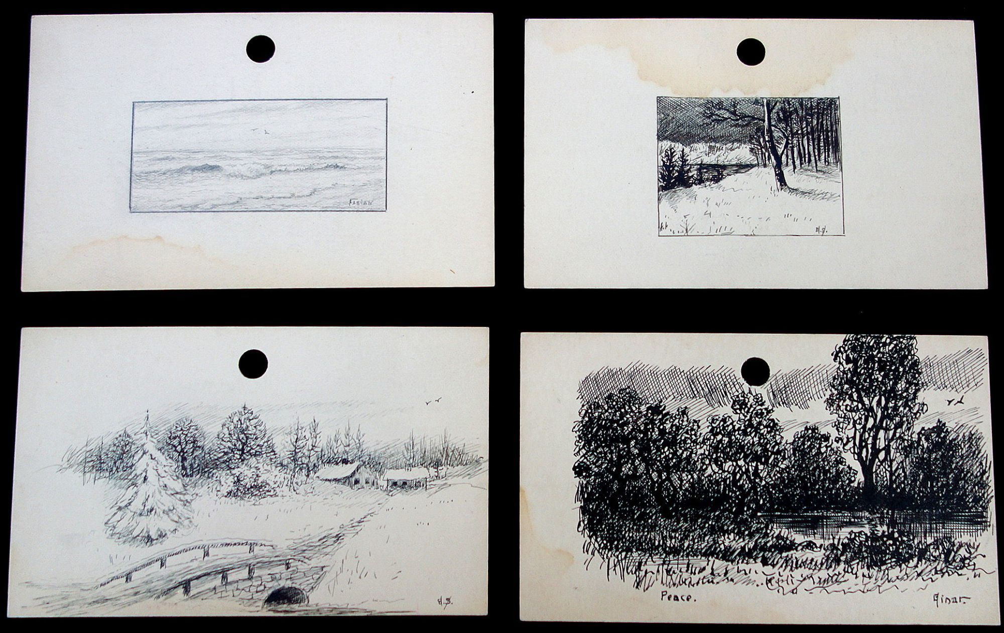 This quote is signed with the name Einar, a Scandinavian boy's name meaning warrior or leader. The illustrated note cards in the collection often have either Einar or the initials E. S. on them. Additionally a few times the illustrations are dated. It is clear that some of these note cards were originally used for study purposes as on the back of some cards are some notes, such as exogamy (a scientific term) or Schweizerisches Rechtslexikon by K. Brodtbeck (Swedish Legal Dictionary). Previously used as note cards and repurposed for drawing. The note cards themselves are 5" x 3" with a single hole punch at the bottom. Four of the cards in the collection have been done on smaller trimmed note cards, the smallest of which is 3 1/2" x 2". One of these smaller cards has been done in pencil rather than pen.
