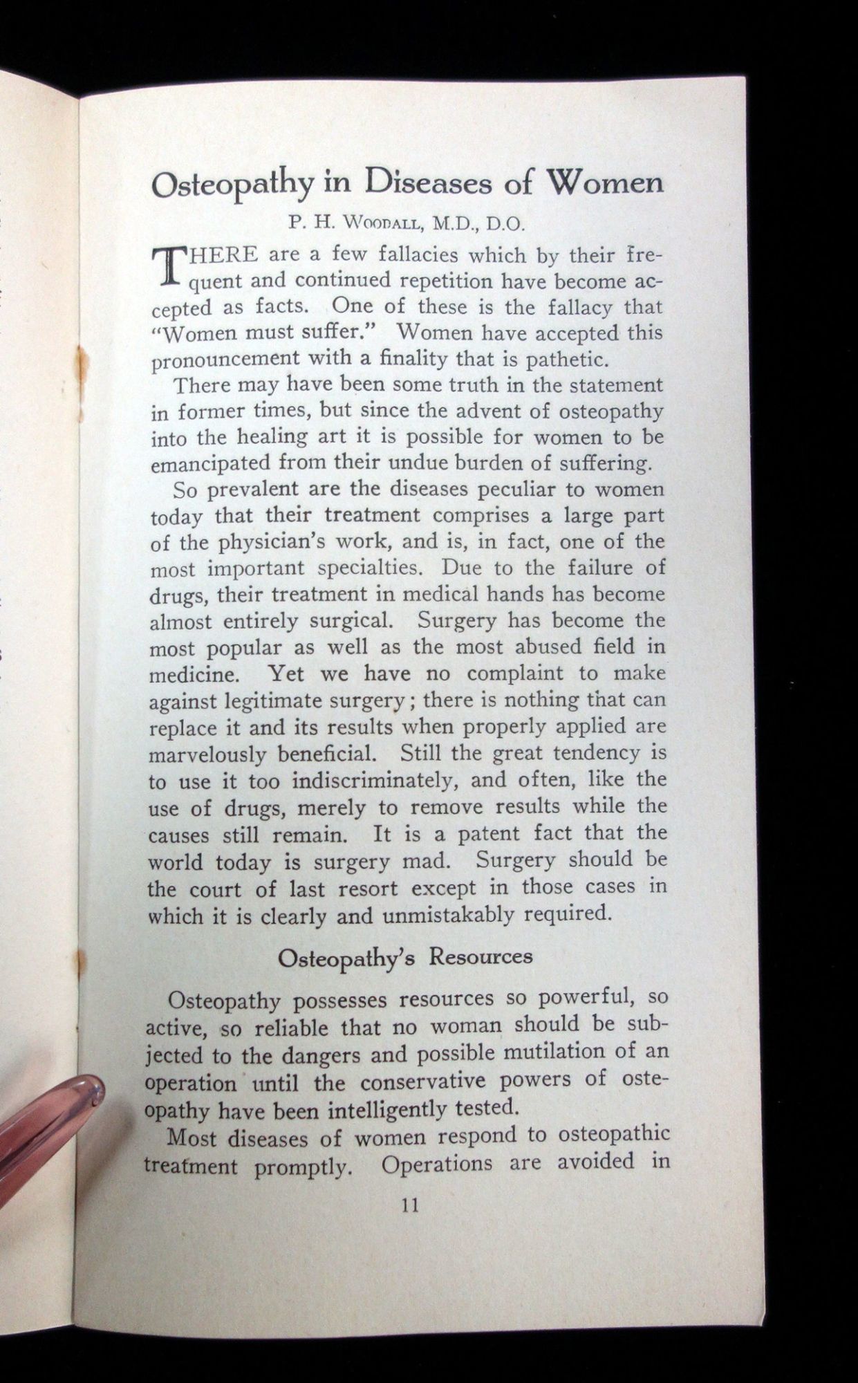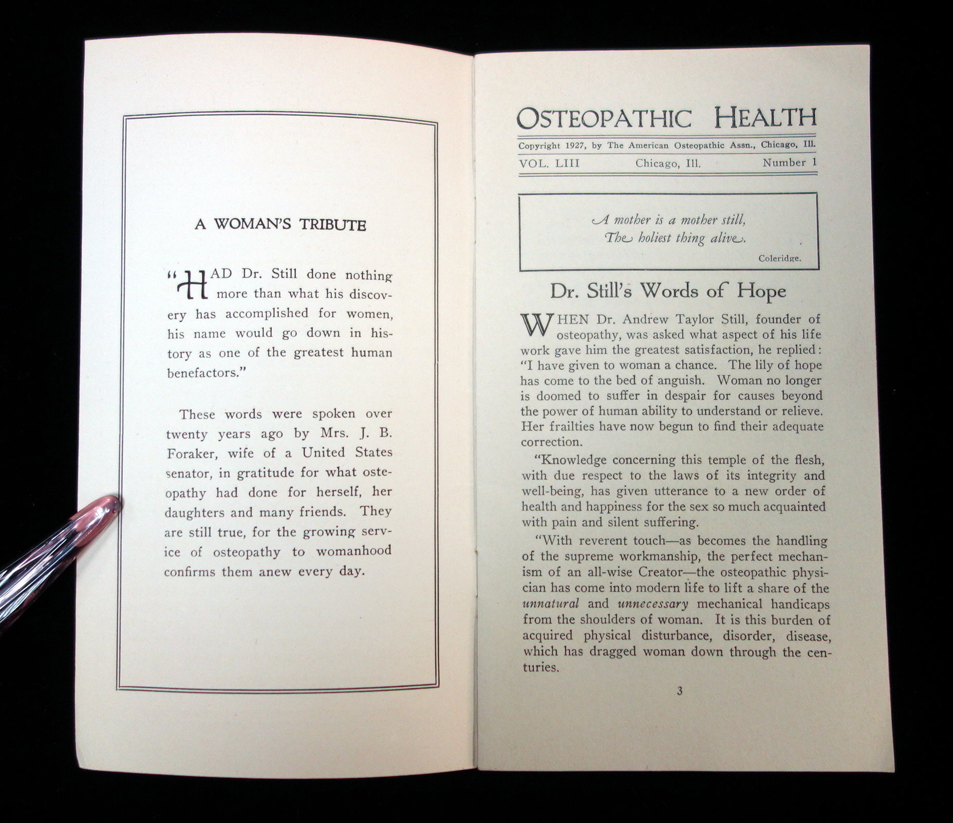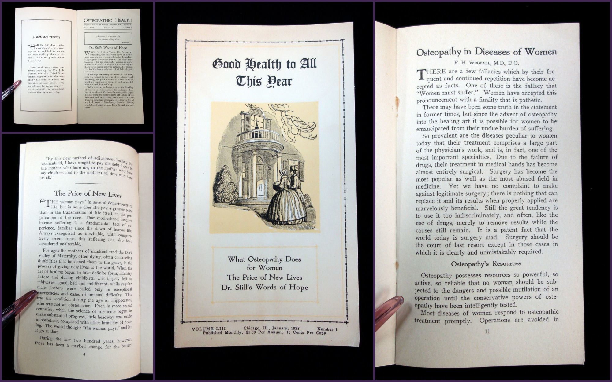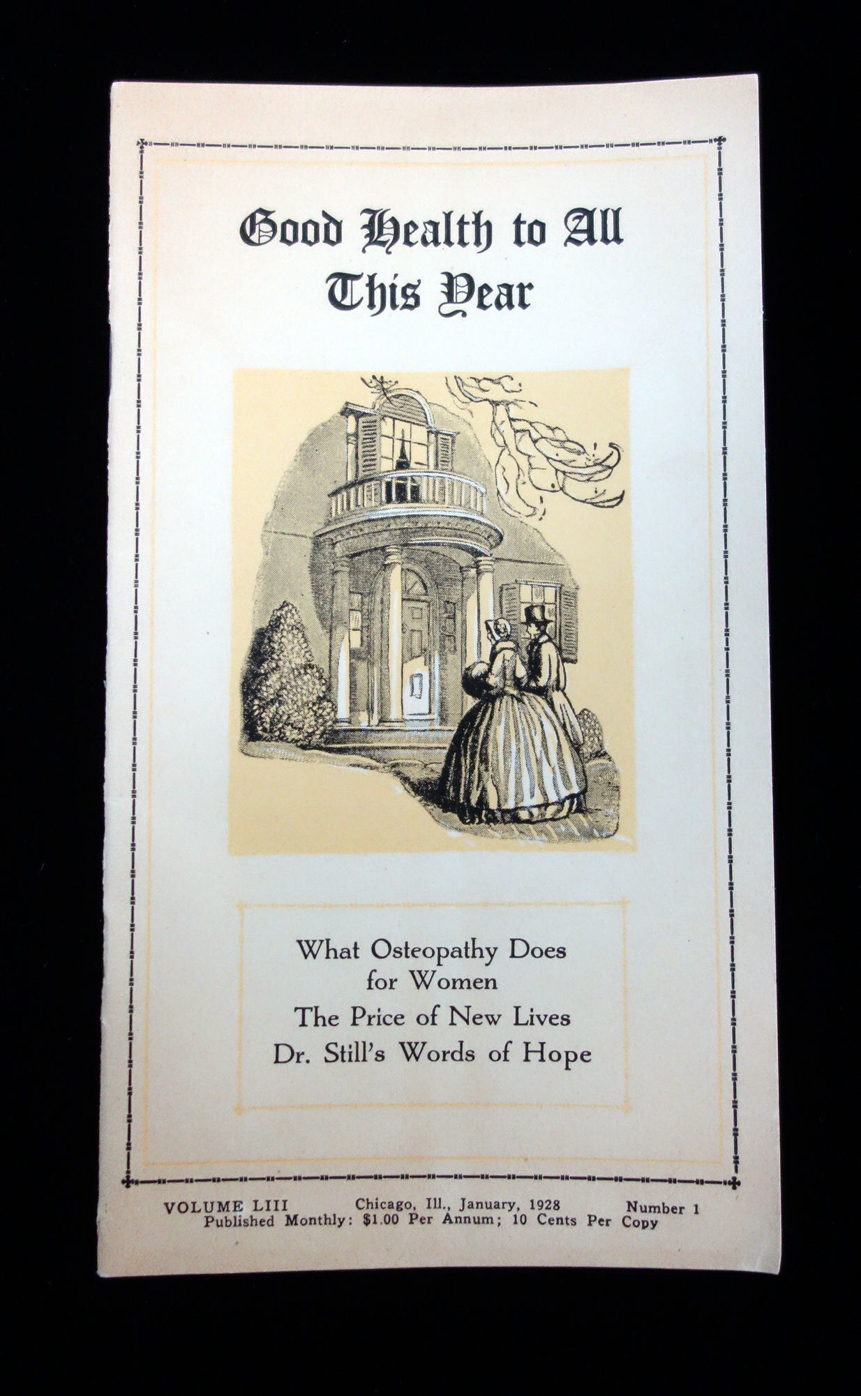 Chicago, IL: American Osteopathic Assn, Jan-28. Covers are toned due to age. Staples are rusted. Otherwise fine.. A volume of the journal of Osteopathic Health that focuses on women's health and how osteopathy can help. Osteopathy is a system of medical practice based on the theory that diseases are mostly due to loss of structural integrity of the body which can be restored by careful manipulation. There are six articles in this volume entitled: Dr. [Andrew] Still's Words of Hope, The Price of New Lives,Osteopathy and Obstetrics, Osteopathy in Diseases of Women, Mechanical Causes of Woman's Ills, and What Osteopathy Does for Women. The front cover depicts and image of a man and a woman walking up the front stoop of a building.