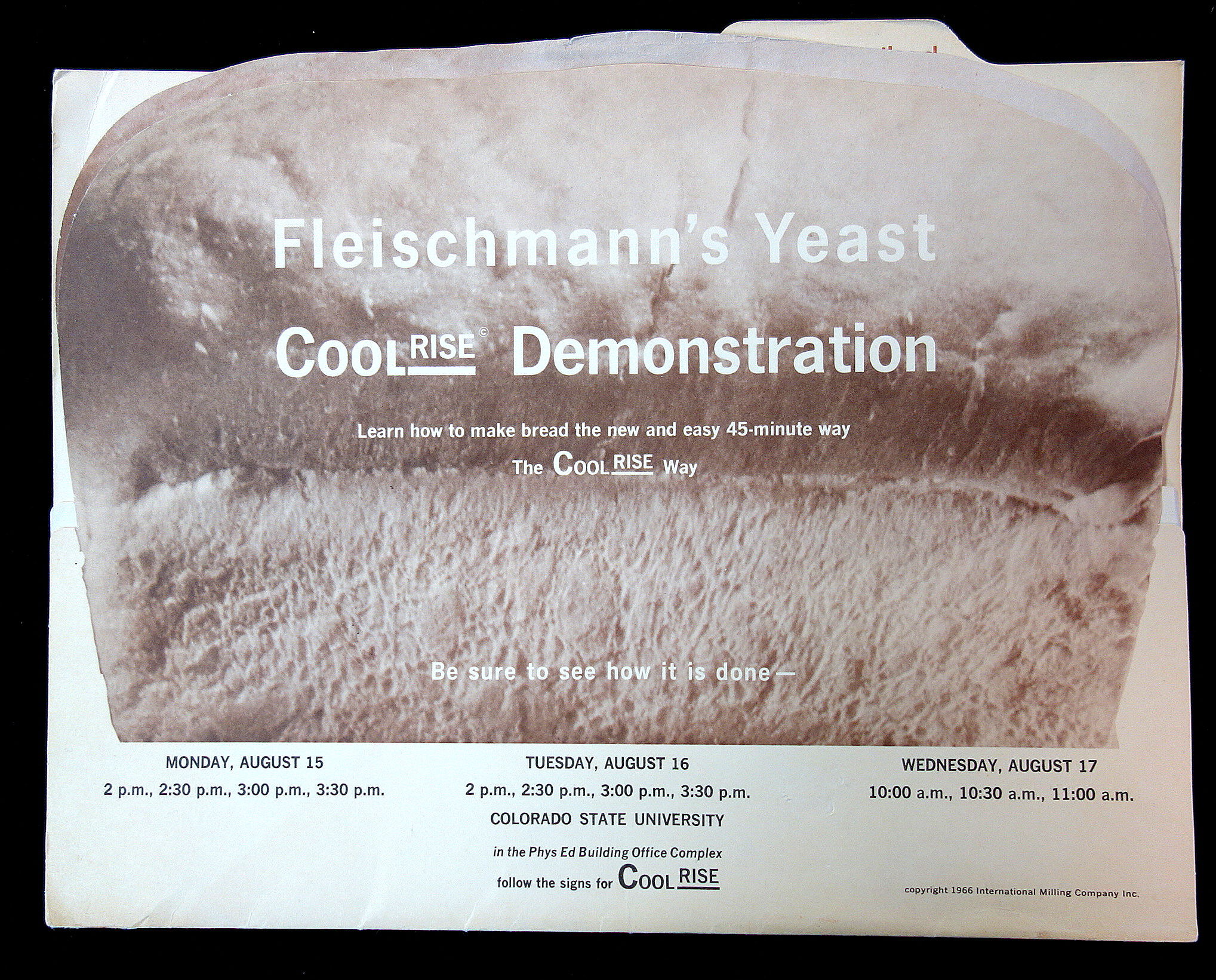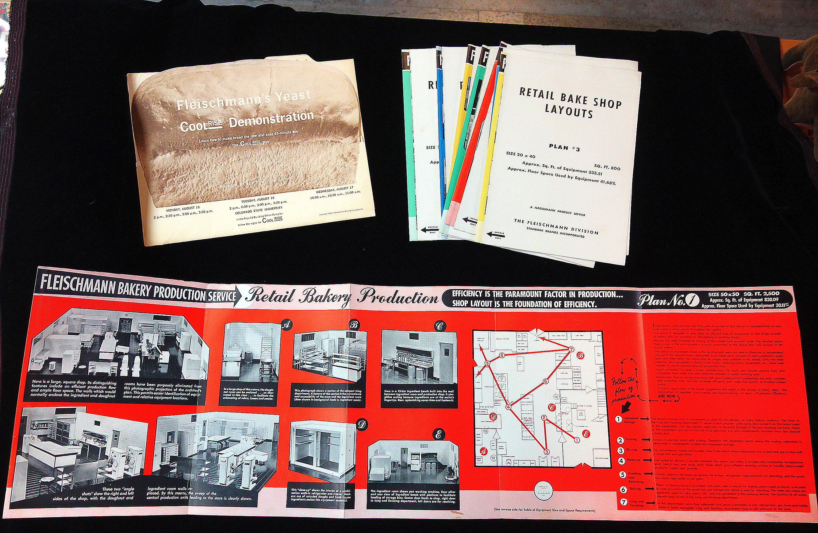 International Milling Company Inc, 1966. etc.. A set of eight retail bake shop layouts provided by the International Milling Company. The set was distributed during a 'Cool Rise' Demonstration of Fleischmann's yeast at the Colorado State University in August 1966. The eight plans come in a folder that depicts an image of a wheat field along with the dates of the demonstration listed at the bottom. The front flap of the folder has also been die cut into the shape of a bread loaf. Each layout within the folder has a layout done in one of four colors: red, green, yellow or blue. Each layout fold out into 5 sections and depicts the floor plan of a shop, and images of all the equipment needed as well as several paragraphs discussing the 'flow of production' in each layout. Folder Measures: 11 3/4" x 9 1/2" Plans Measures: 11" x 7 3/4" (folded) 37" x 11" (unfolded)