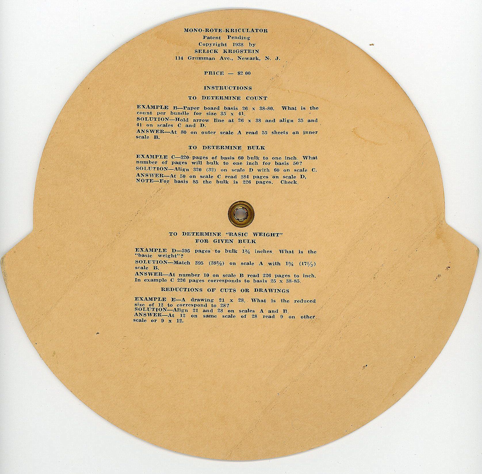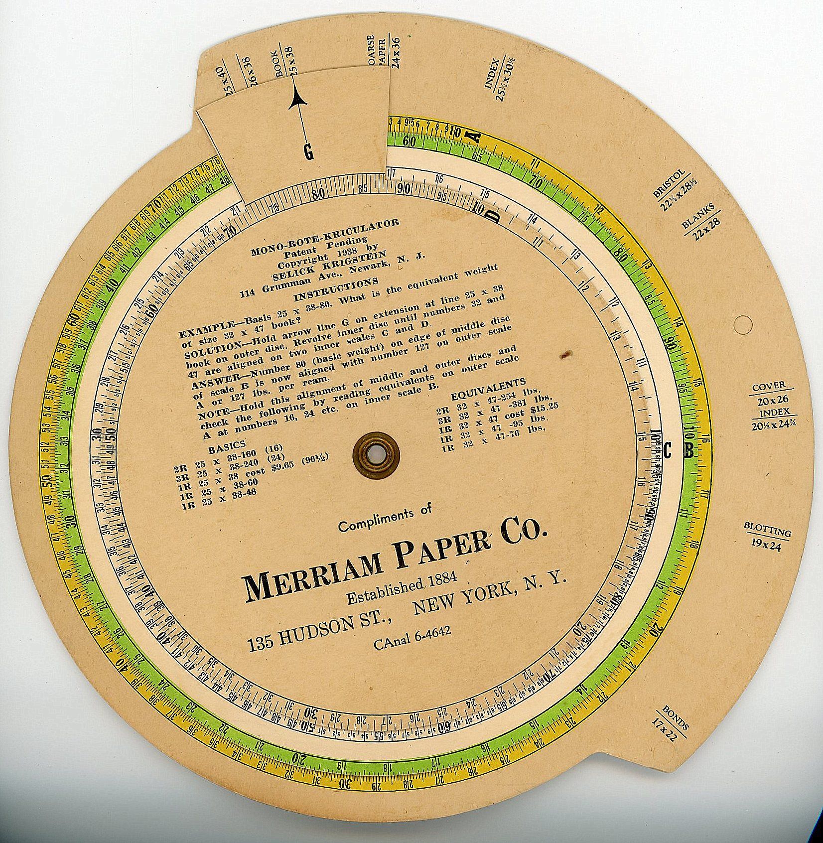 New York: Merriam Paper Co, 1938. Minor toning and soiling due to age, otherwise fine.. A three-layer volvelle made by the Merriam Paper Co. meant to help determine the equivalent weight, count or bulk between two different sizes of paper bundles. The wheels have four different color-coded sections: yellow, green, white, and tan. On the front of the volvelle, in the center there is an example given to show one how to use the wheel. On the back there are four different sets of instructions on how to use the wheel to determine count, bulk, weight, and reductions. Diameter 8