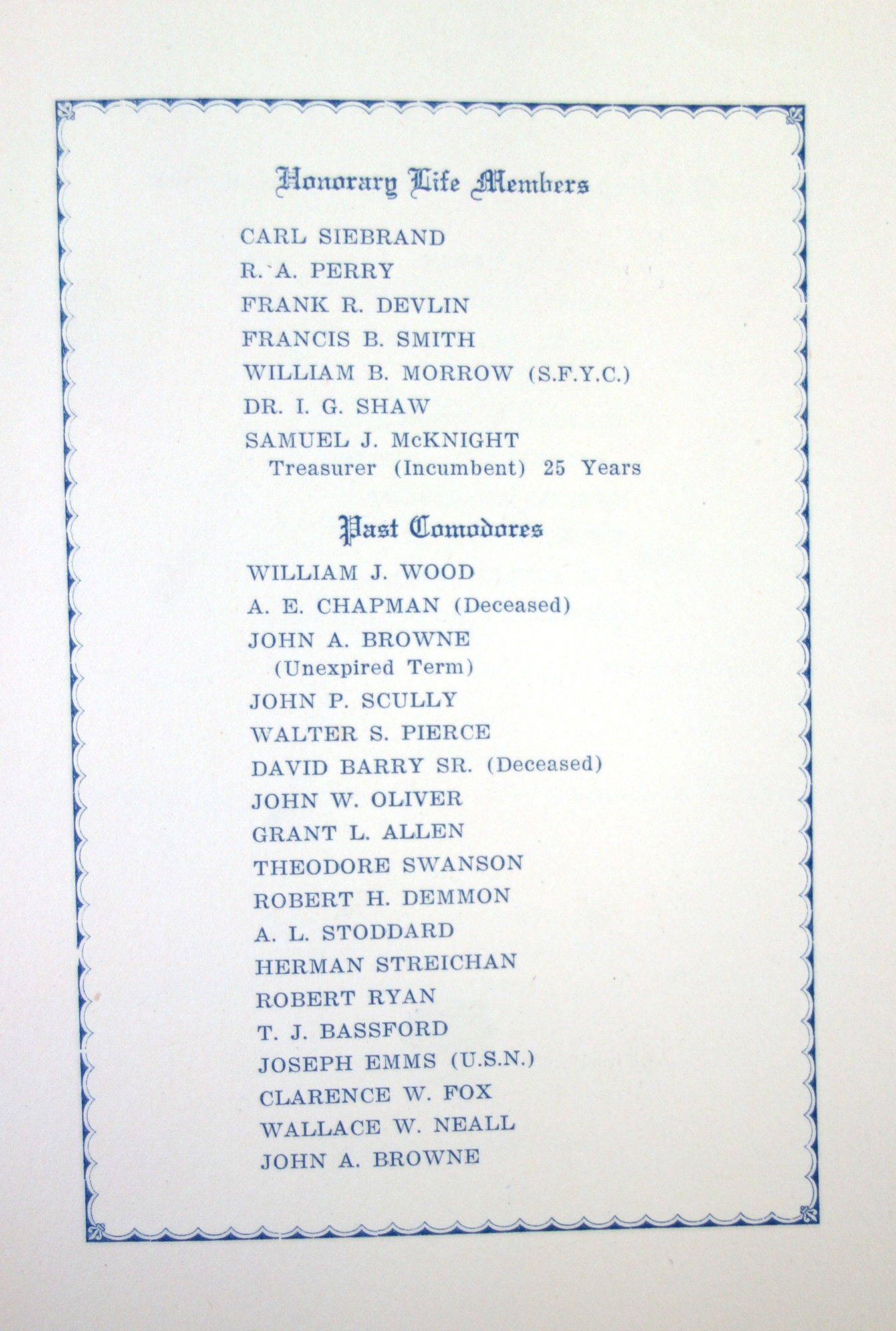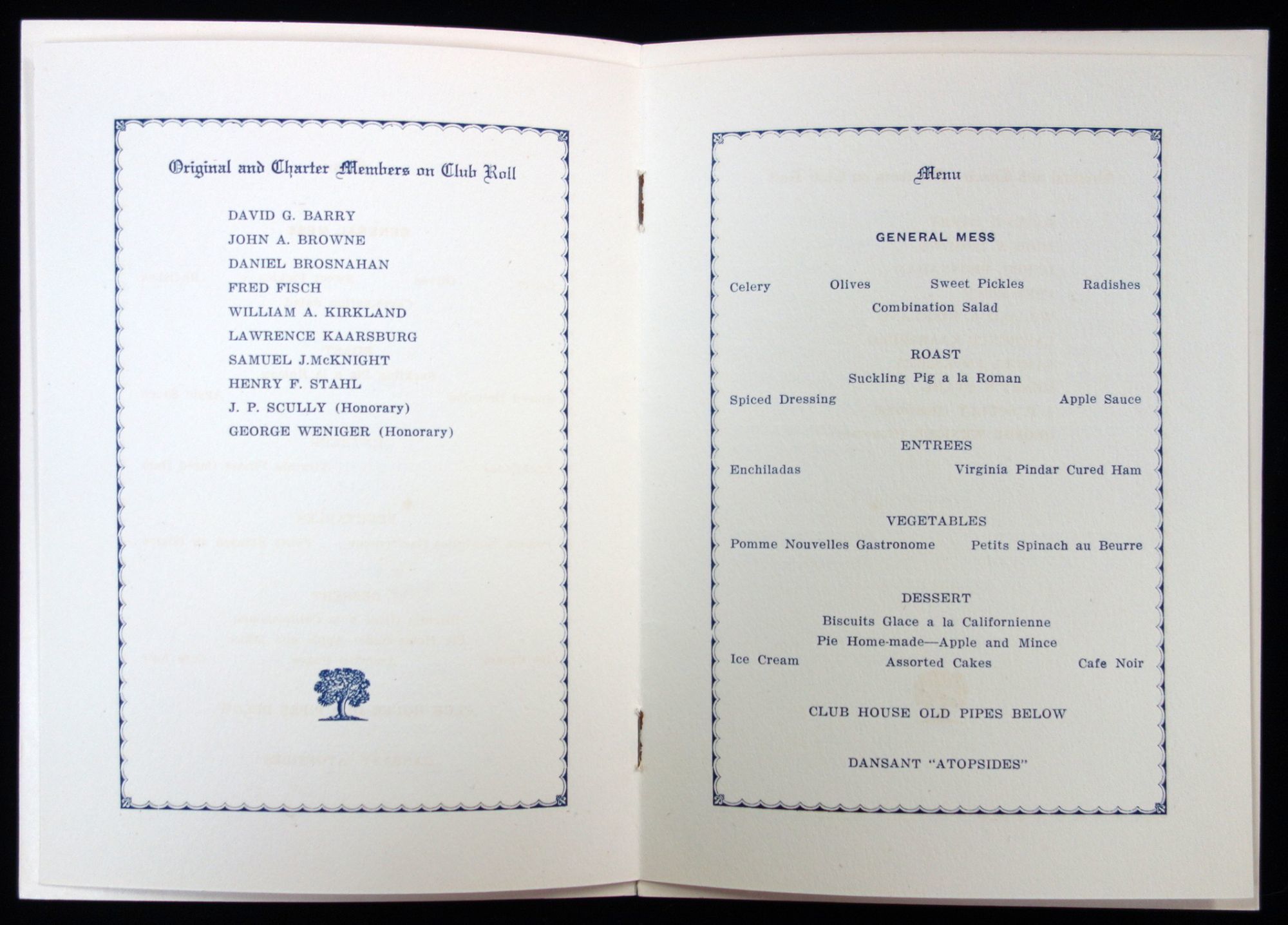 Printed folded menu and list of members and officers for the Vallejo Yachting and Rowing Club, Vallejo, California-organized May 1, 1900. The twenty-fifth Anniversary Club House Dinner includes general mess of celery, olives, sweet pickles, radishes, and combination salad; roast of suckling pig a la Roman with spiced dressing and apple sauce; entrees of enchiladas and Virginia pindar cured ham; vegetables of pomme nouvelles gastronome and petits spinach au Beurre; desserts are biscuits Glace a la Californienne, homemade apple and mince pies, ice cream, assorted cakes, and cafe noir; and Club House Old Pipes Dansant "Atopsides". A listing of Honorary Life Members, Past Comodores, Officers, Directors, and Original and Charter Members are included as well as picture of Club House on back cover.