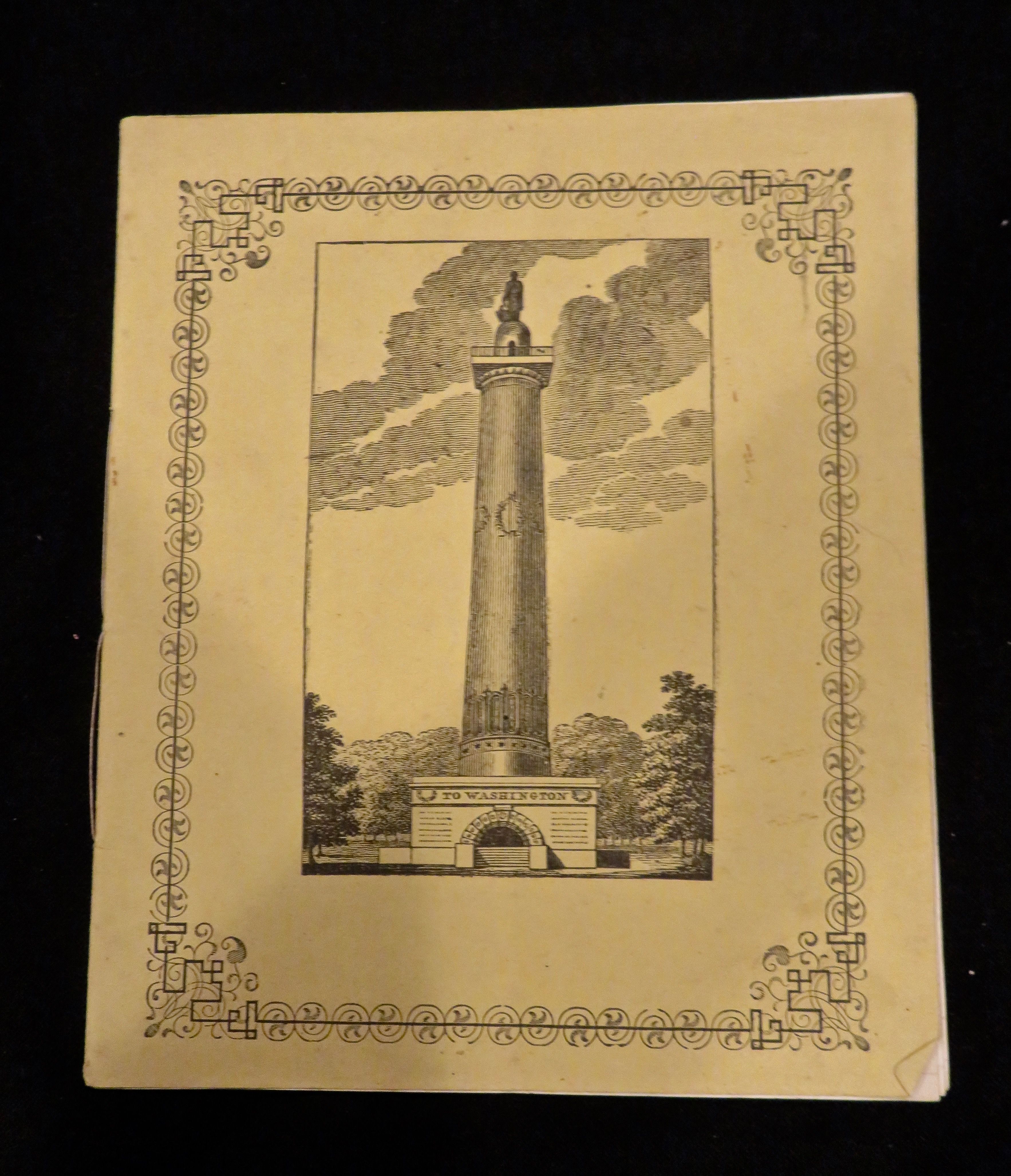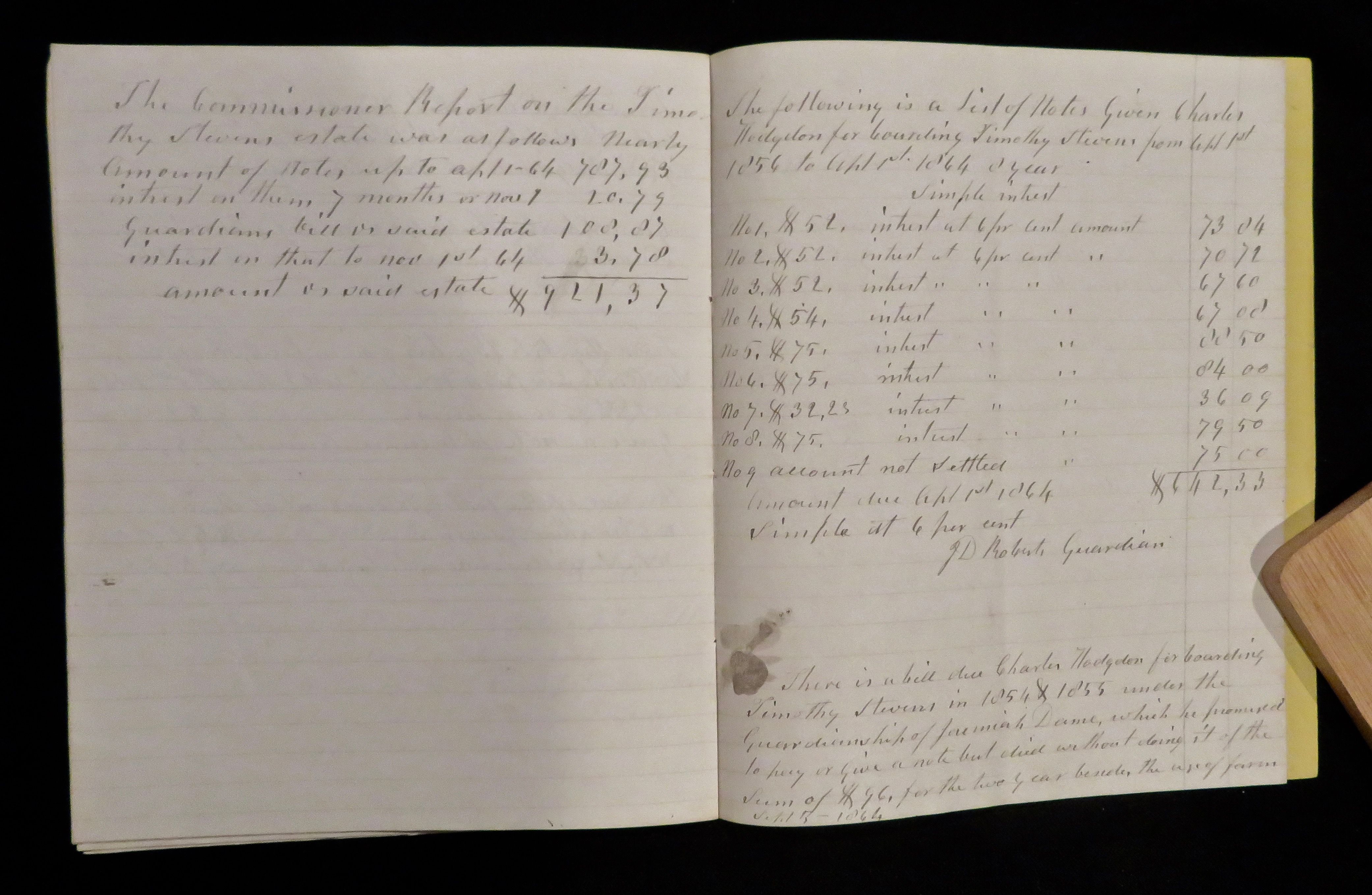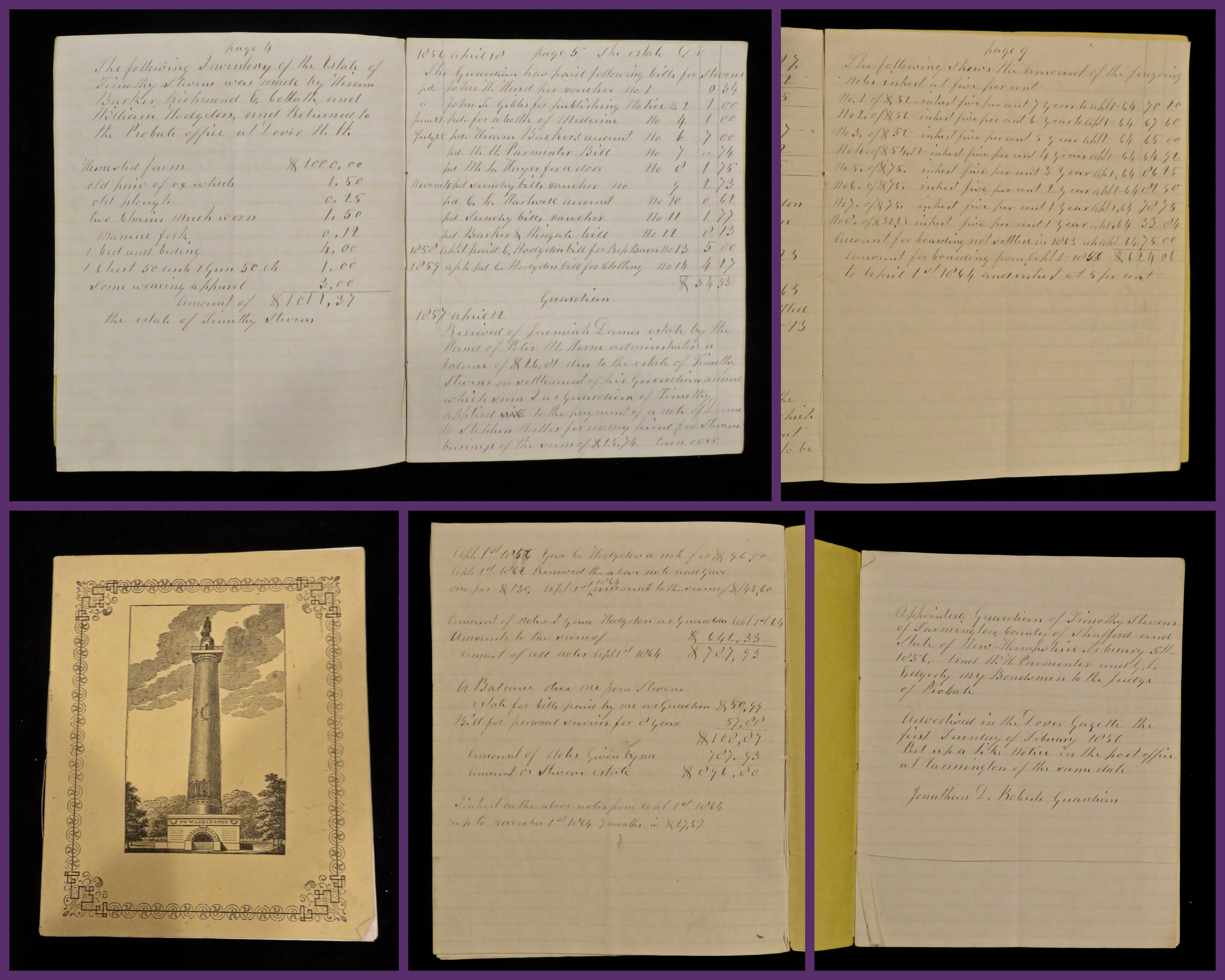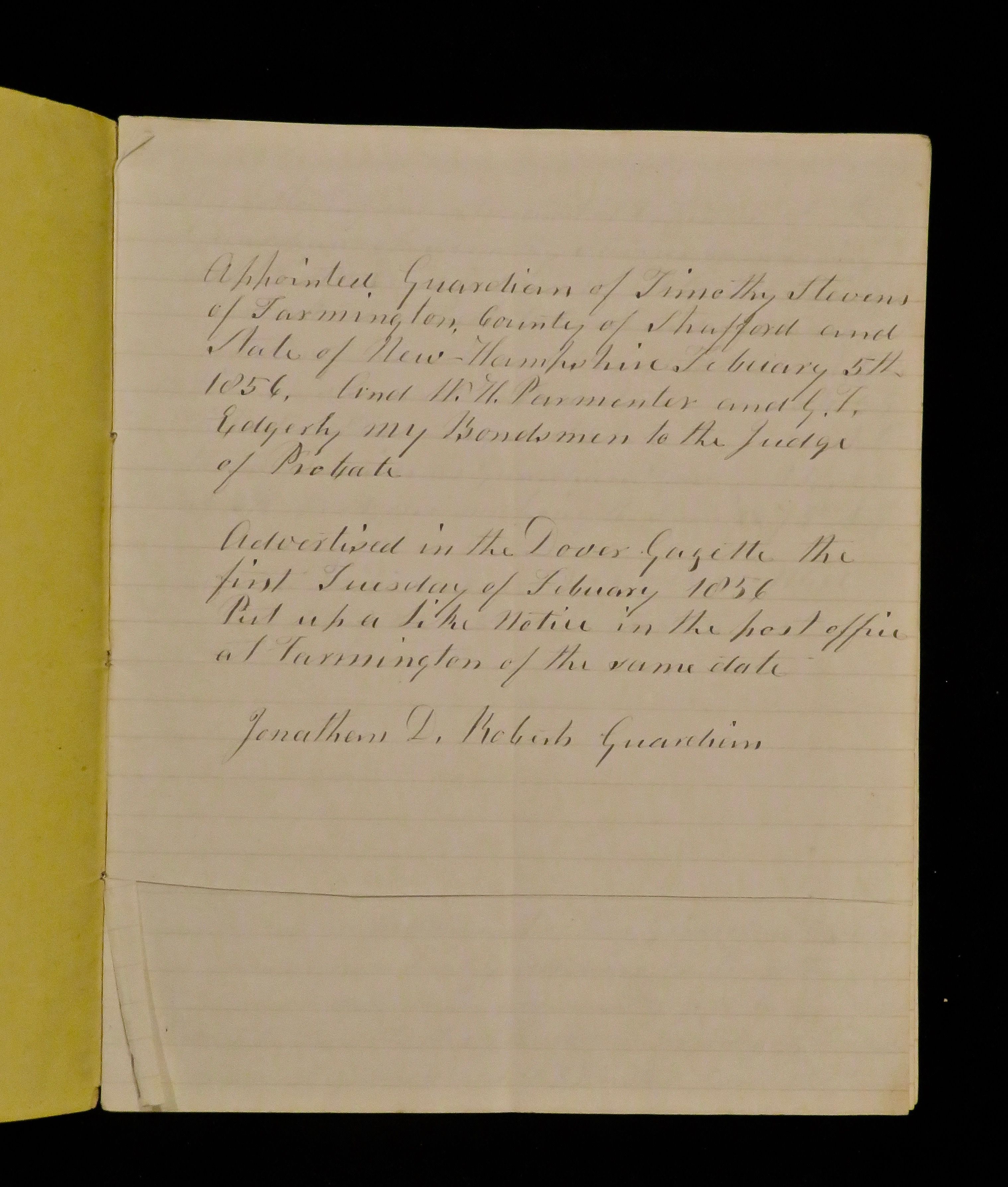 Farmington, NH, 1856 - 1864. A copy book used to by Jonathan D. Roberts to keep an accounting of his guardianship of Timothy Stevens from 1856 - 1864. On the first page is a note that states Roberts was appointed Stevens guardian on February 5, 1856 and that this fact was advertised in the Dover Gazette on the first Tuesday in February. Next is an inventory of the Estate of Timonth Stevens valued at $1,011.37. What follows is a list of expenses incurred by Roberts, such as the cost of board, travel to the probate court, the cost of his services and a list of different bills paid out. The front cover has an engraving of a monument that states "To Washington". The back cover has a multiplication table on it as well as the note "Always for sale, a general assortment of Blank, School, and Miscellaneous Books..." There is no mention of a publisher. No OCLC, Feb 2019.Yellow covers, 16 pages. Completely filled. Measures 8" x 6 1/2"