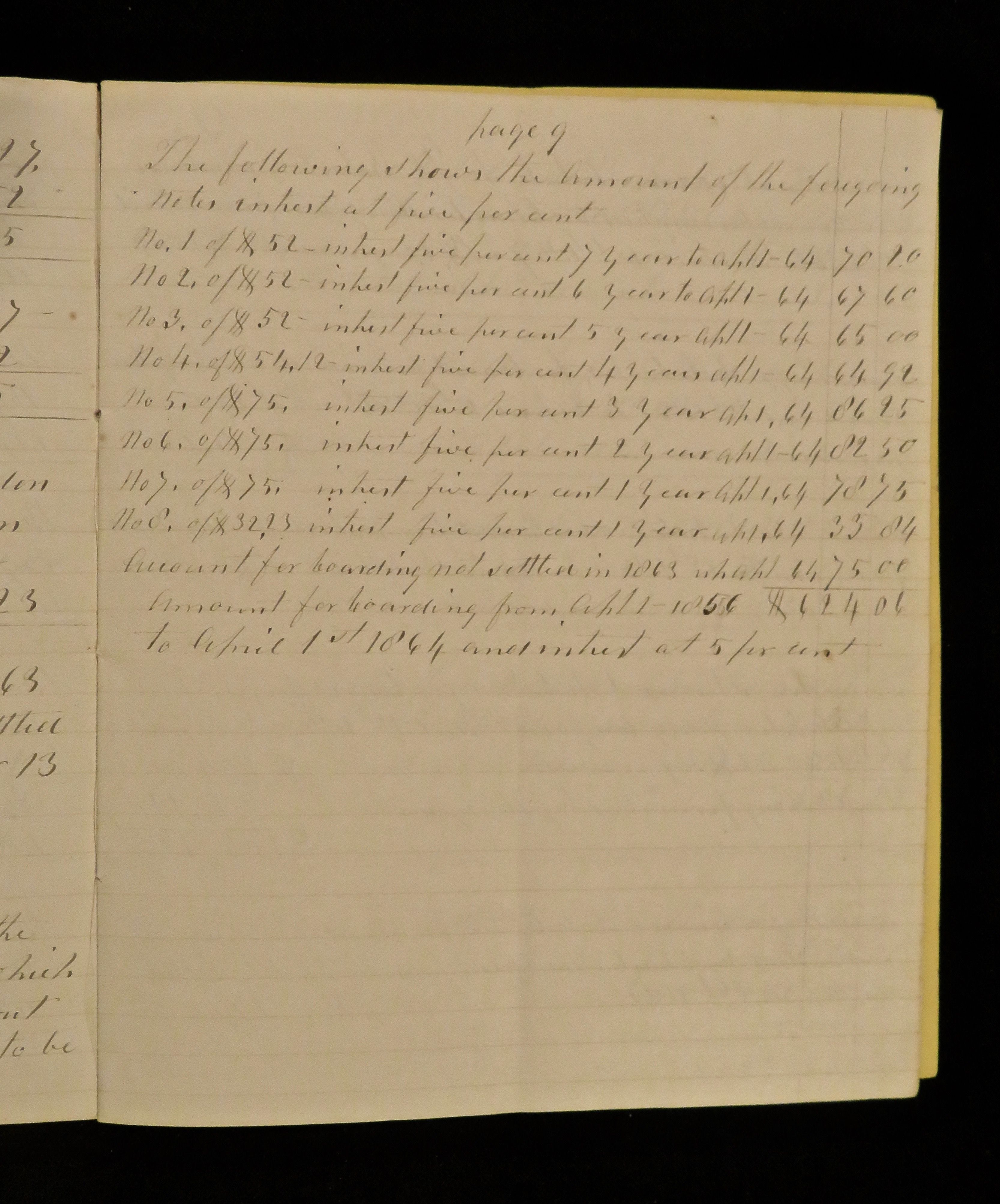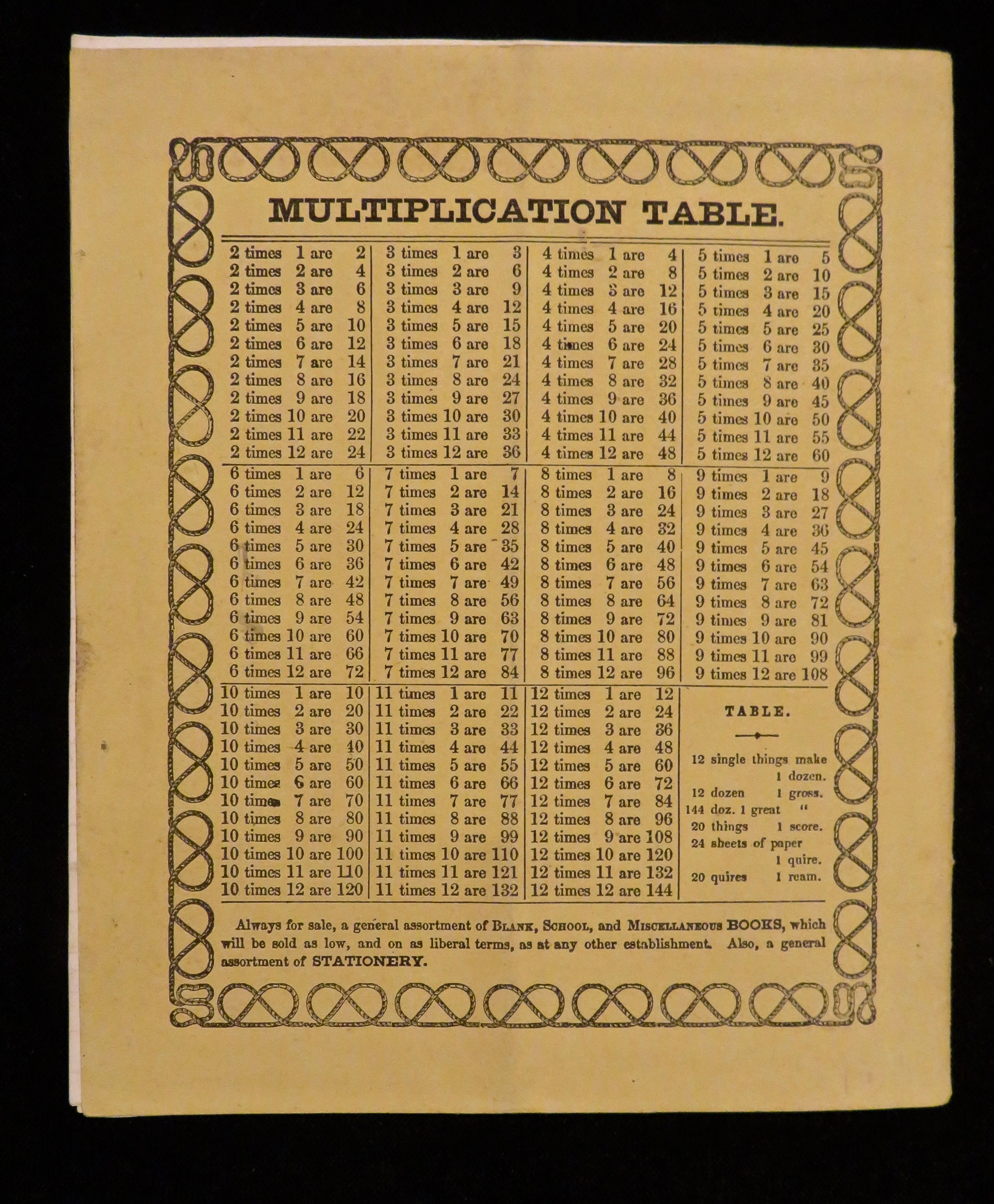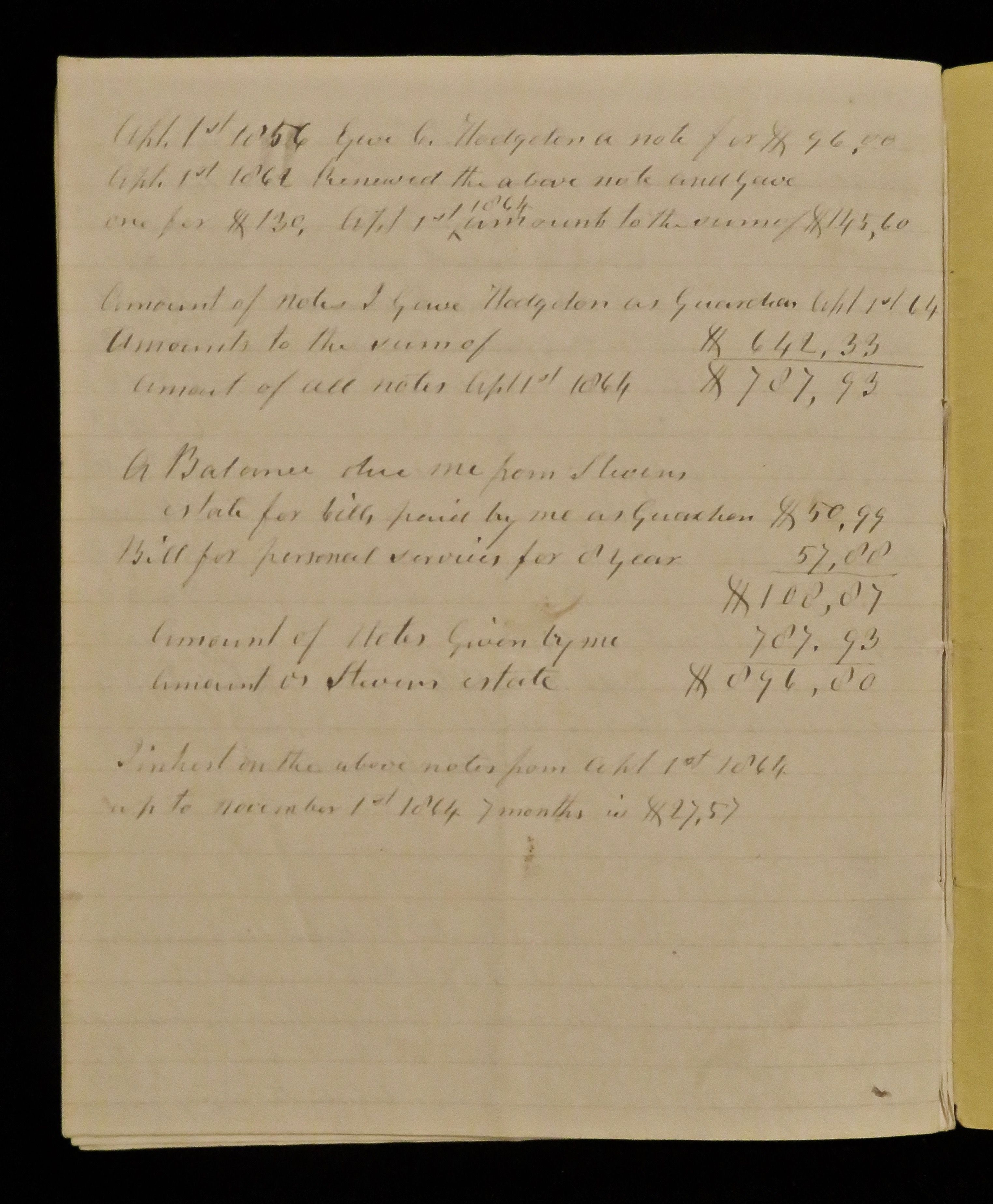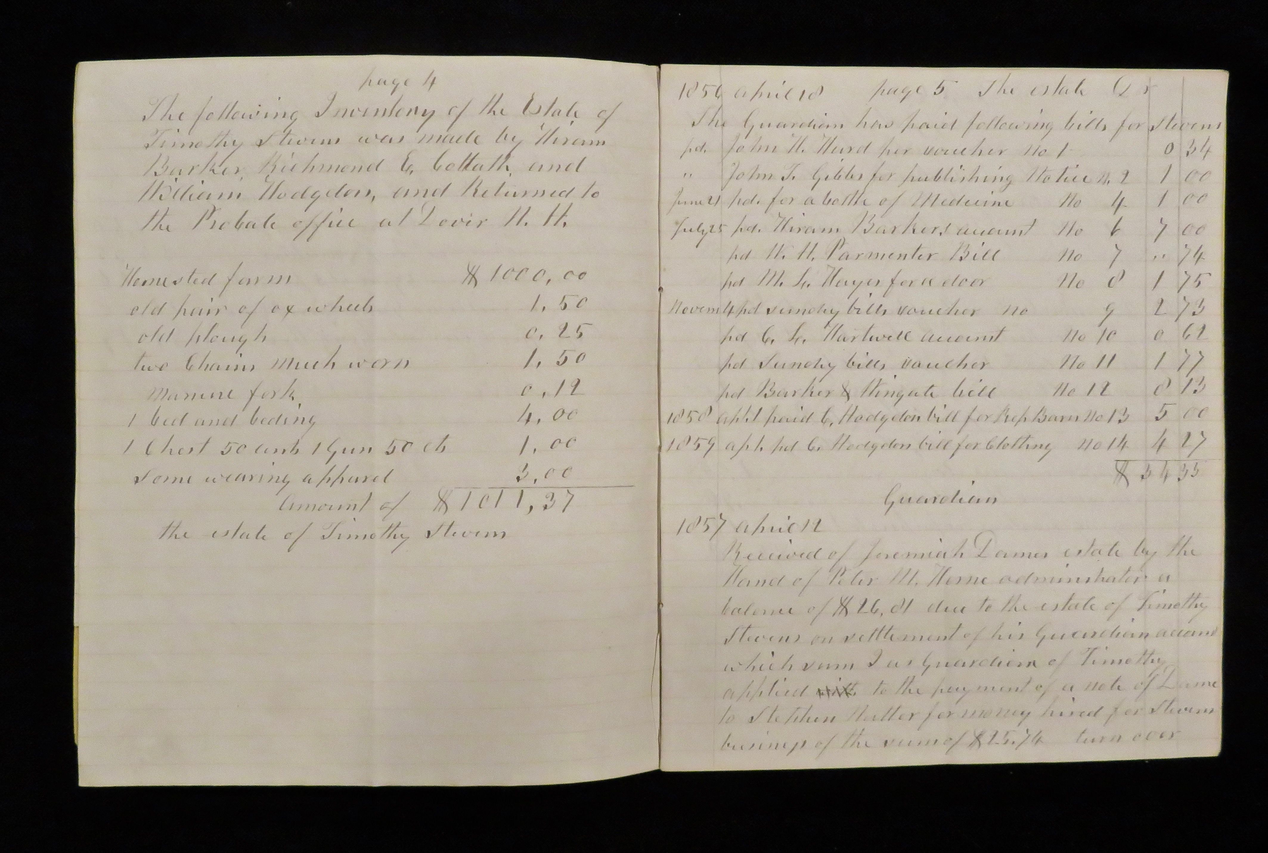 Farmington, NH, 1856 - 1864. A copy book used to by Jonathan D. Roberts to keep an accounting of his guardianship of Timothy Stevens from 1856 - 1864. On the first page is a note that states Roberts was appointed Stevens guardian on February 5, 1856 and that this fact was advertised in the Dover Gazette on the first Tuesday in February. Next is an inventory of the Estate of Timonth Stevens valued at $1,011.37. What follows is a list of expenses incurred by Roberts, such as the cost of board, travel to the probate court, the cost of his services and a list of different bills paid out. The front cover has an engraving of a monument that states "To Washington". The back cover has a multiplication table on it as well as the note "Always for sale, a general assortment of Blank, School, and Miscellaneous Books..." There is no mention of a publisher. No OCLC, Feb 2019.Yellow covers, 16 pages. Completely filled. Measures 8" x 6 1/2"