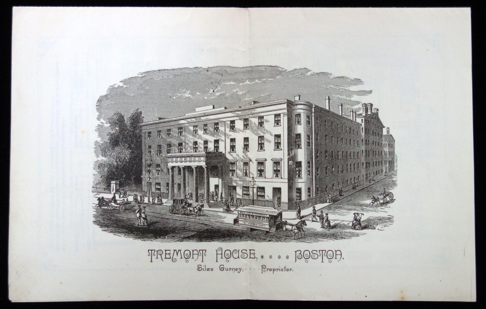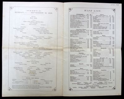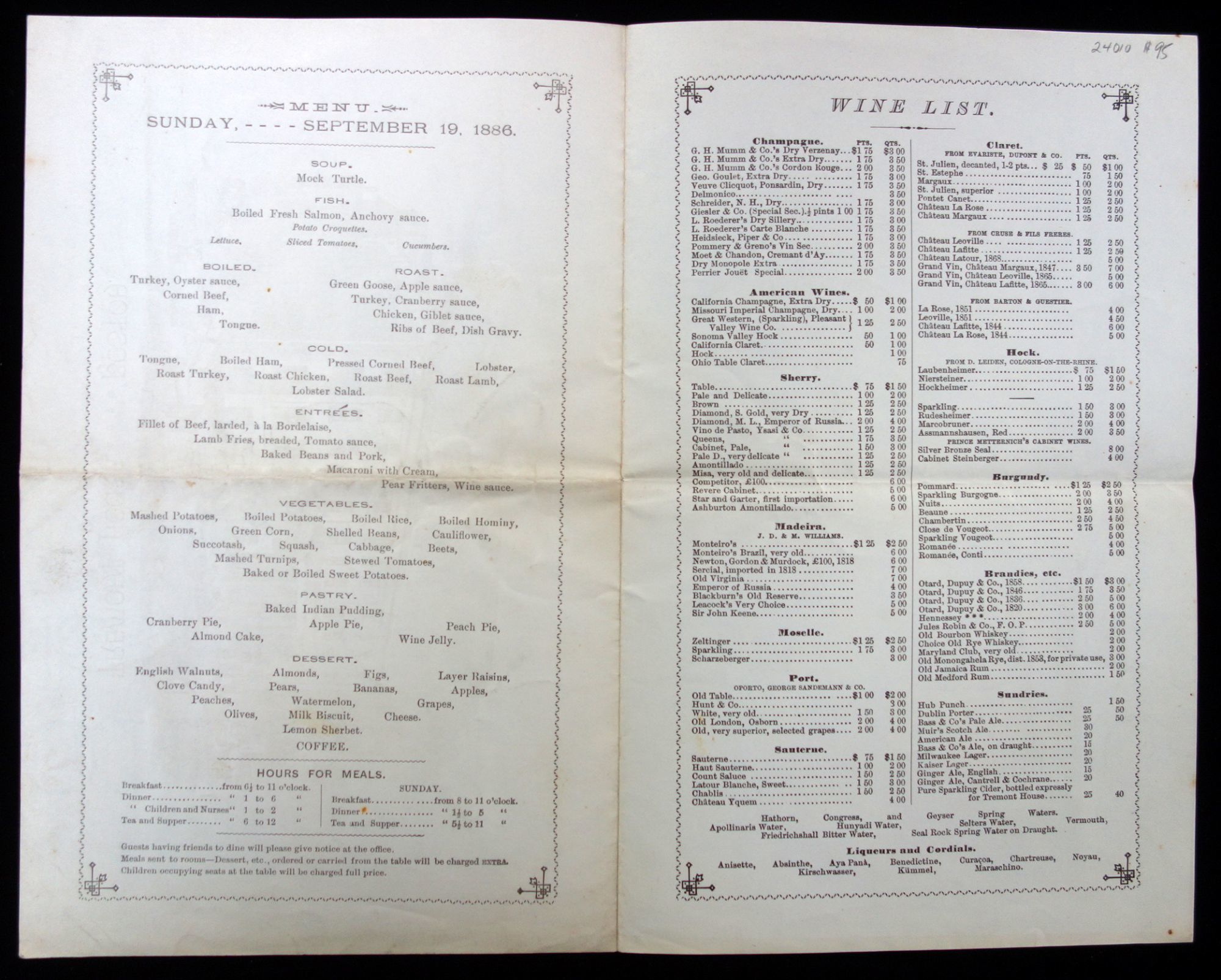 Single-fold menu with illustration of the exterior of the establishment and surrounding street scenes on front cover. The menu is for September 19, 1886 and features a wide array including various Soup, Fish, Cold, Entrees, Vegetables, Pastry and Dessert. Also includes a comprehensive wine list. Reverse is blank. Measures 5 ¾" x 9". horizontal centerfold.