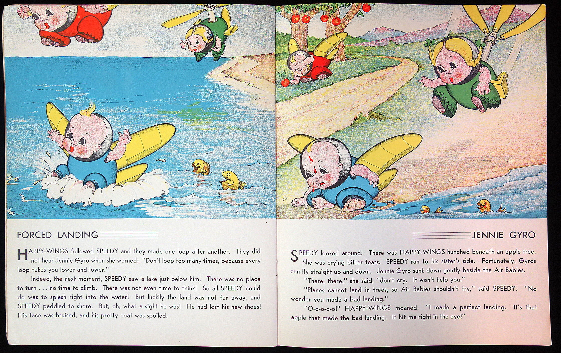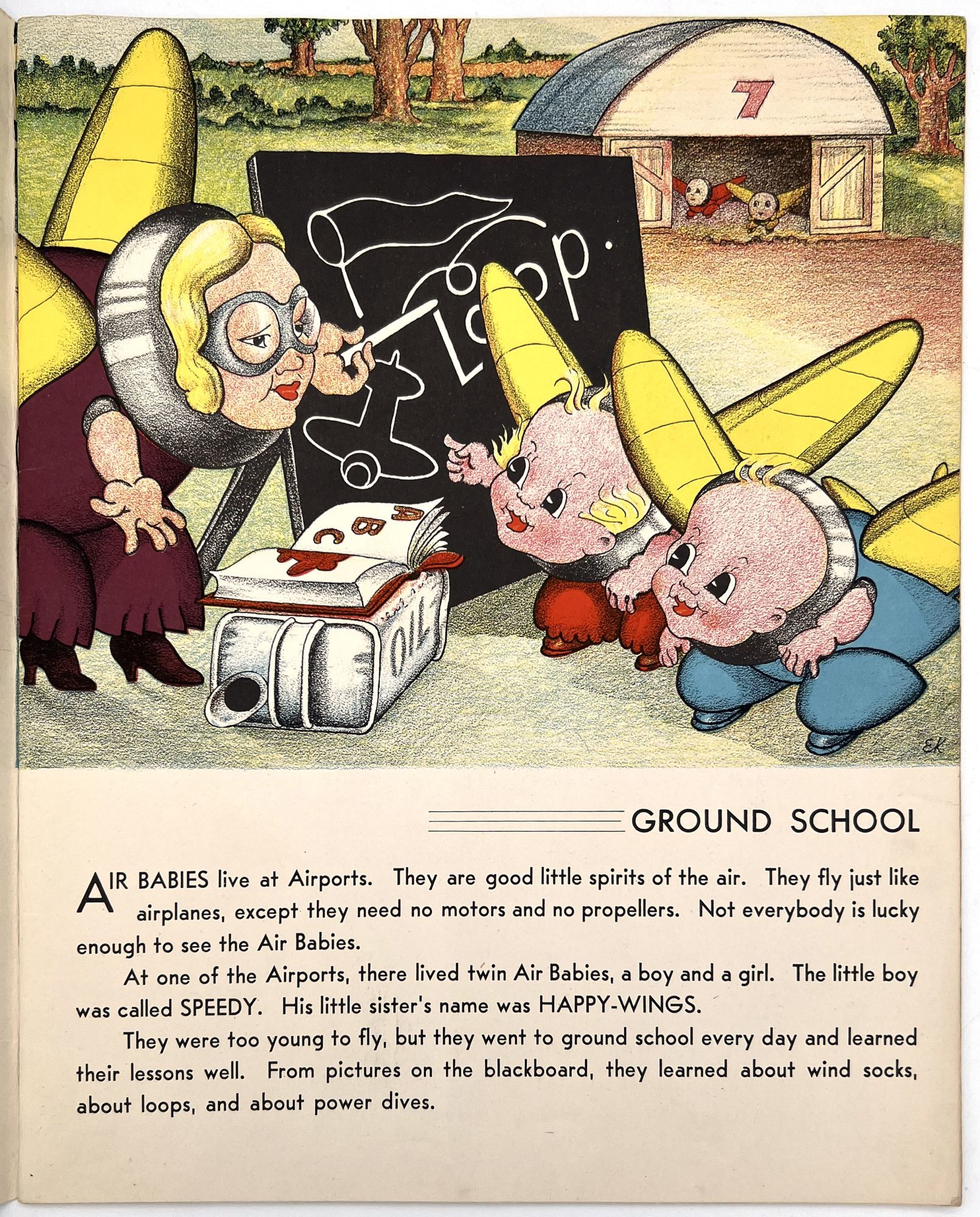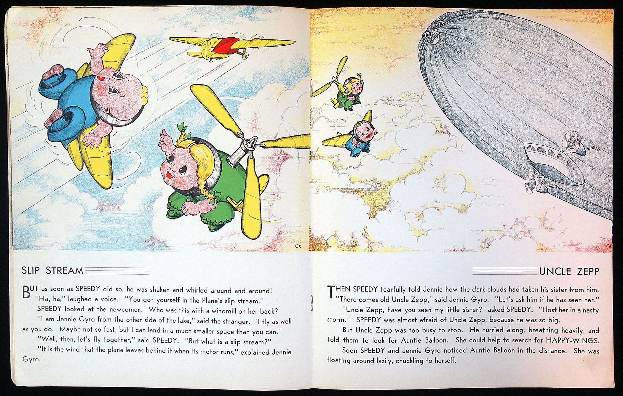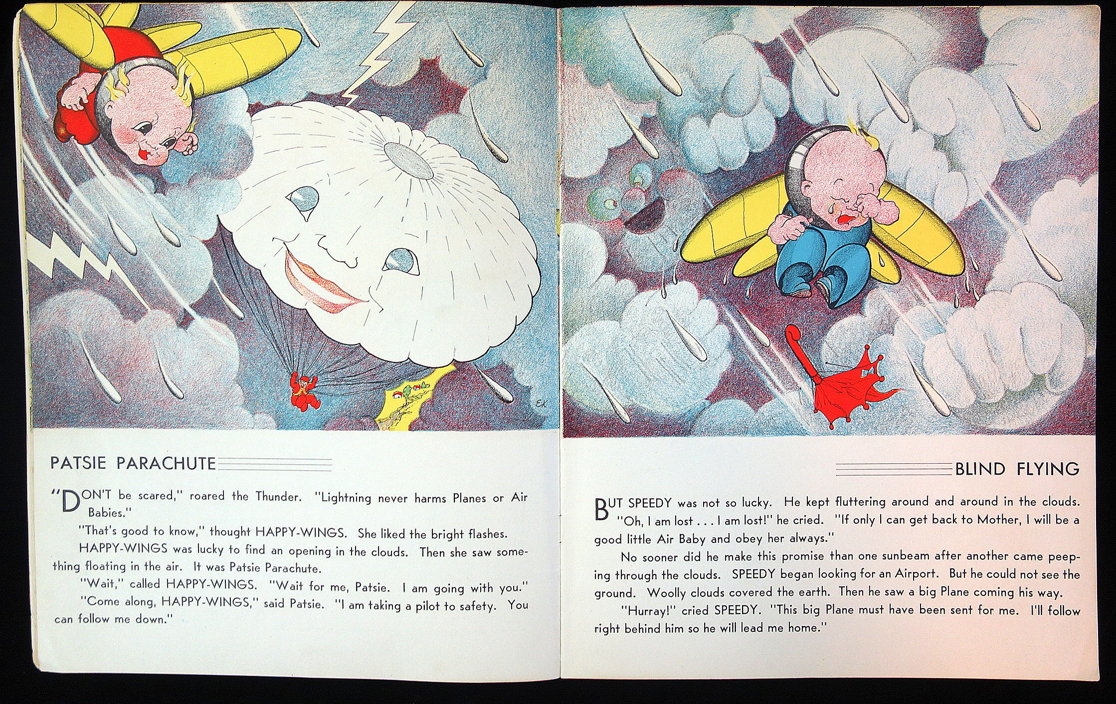 Akron: Saalfield Publishing Co, 1938. Large format unpaginated soft cover picturebook. No. 2207. Anthropomorphic baby airplanes named Speedy and Happy-Wings. Charming color illustrations each page with a title for each page covering one activity of the baby planes. Some of the titles are Ground School, Willie Kite, Nasty Storm, Slip Stream, Uncle Zepp, Auntie Balloon, Mountain Currents, First Aid, Formation Flying and much more. The last page depicts the happy bandaged new flyers pleasantly sleeping in their rocking airplane bed. This page is titled Happy Dreams. Measures 12 1/2" x 10