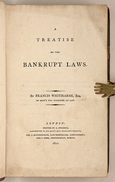 1811. London: Printed by A. Strahan, 1811. 1st ed.. London: Printed by A. Strahan, 1811. 1st ed. The State of English Bankruptcy Law in 1811 Whitmarsh, Francis [1777-1857]. A Treatise on the Bankrupt Laws. London: Printed by A. Strahan, 1811. xi, 83, 330 pp. Octavo (9" x 5-1/2"). Contemporary calf, rebacked in period style, blind rules to boards, blind fillets and lettering piece to spine, hinges mended. Light rubbing to boards, rubbing to extremities with some wear to corners. Light toning to text, light offsetting to margins of preliminaries and rear endleaves, finger smudges and creases to a few leaves, early owner signature to front free endpaper. $1,500. * First edition. Whitmarsh's treatise is an excellent survey of English bankruptcy law as it stood in 1811. Topics include the act of bankruptcy, petitioning a creditor's debt, assignment by commissioners, imprisonment and proof of debts. Whitmarsh was a barrister of Gray's Inn. A second edition was published in 1817. Both are rare. OCLC locates 6 copies of the first edition (Georgetown Law School, Library of Congress, McGill University Law School, National Library of Scotland, University of Minnesota). Sweet & Maxwell, A Legal Bibliography of the British Commonwealth 1:379.