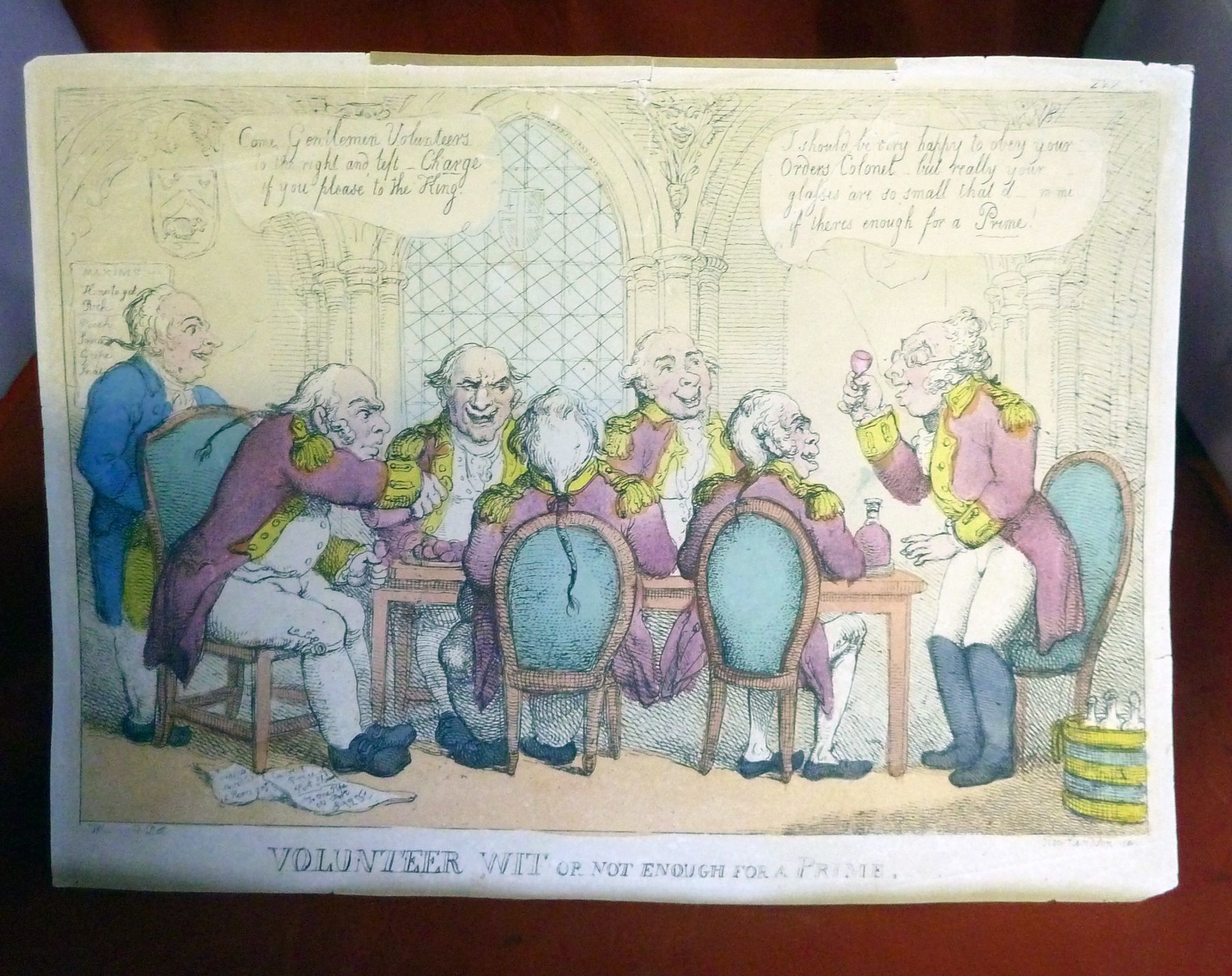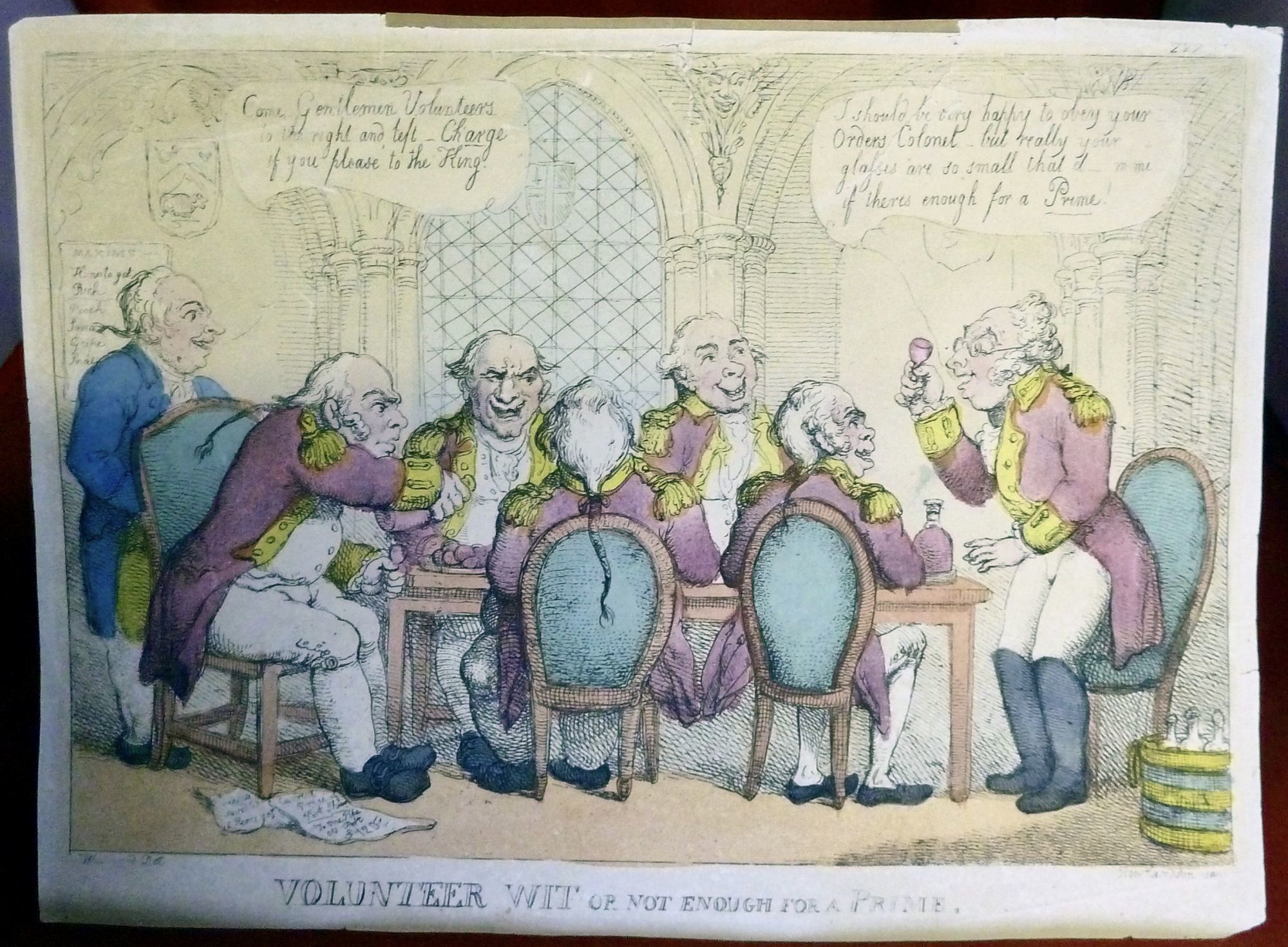 Np: Np, Nd. Original Wraps. Orig. wrappers. Very good. 25 x 34 cm. Color etching with standing man at right replying, "I should be very happy to obey your orders Colonel but really your glasses are so small that d__m me if there is enough for a Prime." a few tiny nicks, with reinforcement at head.