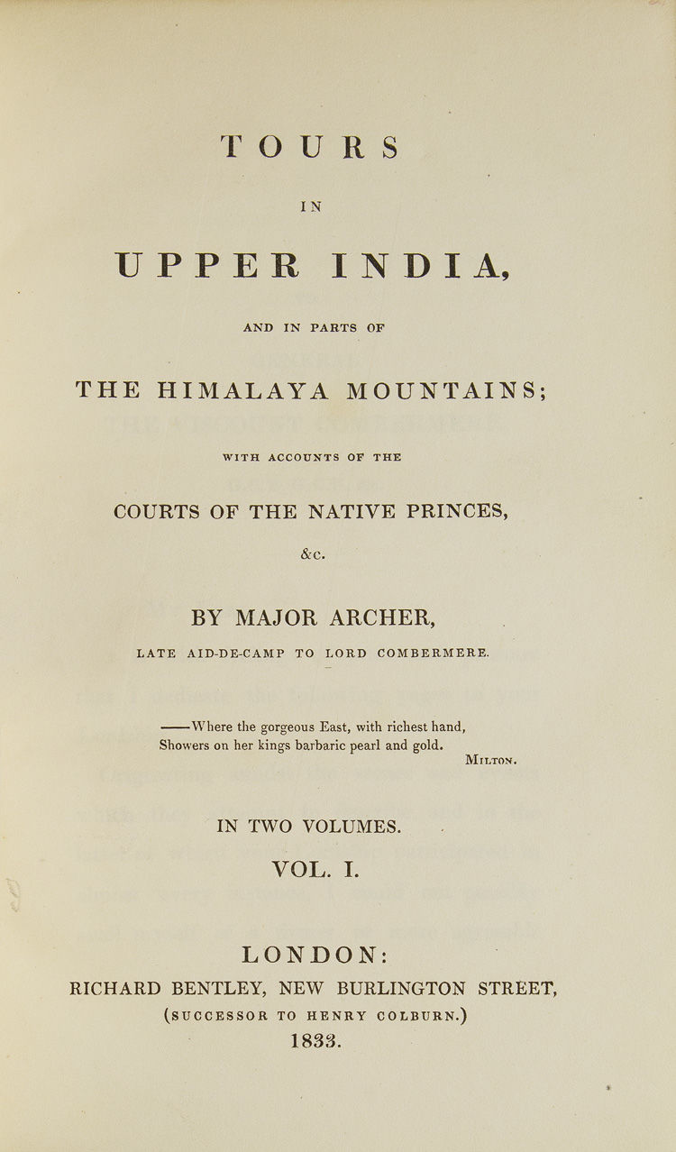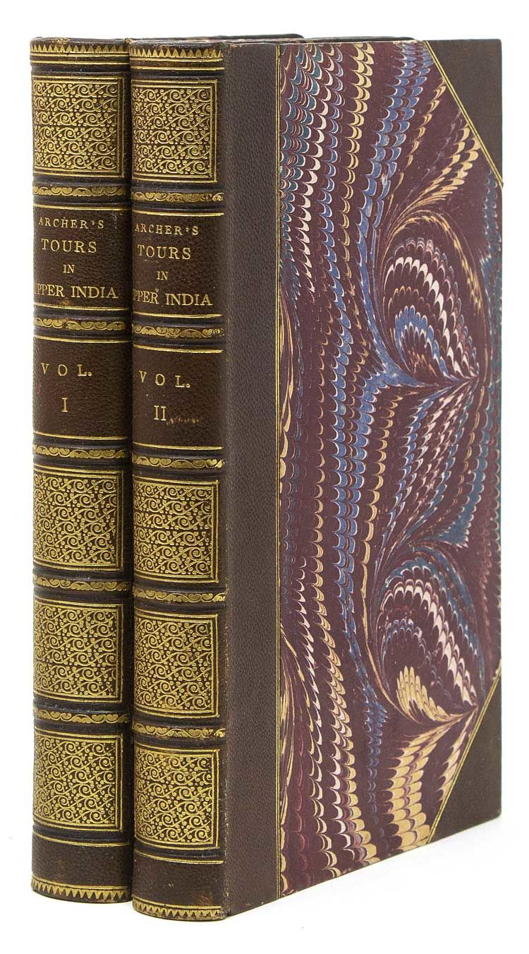 London: Richard Bentley, 1833. First edition. xviii, 387 pp. Half-titles present. 2 vols. 4to. Contemporary three quarter brown morocco over marbled boards, gilt spine. First edition. xviii, 387 pp. Half-titles present. 2 vols. 4to. Describes official visits to the King of Oudh, the Rajah of Bharatpur and the King of Delhi. Includes descriptions of troops and fortifications but also stories of local history, descriptions of Mughal architecture, and commentary on the local landscape. "Archer's narrative offers an important view of the state of Upper India at the close of the 1820s" (Riddick). Riddick, Glimpses 68; Yakushi A83