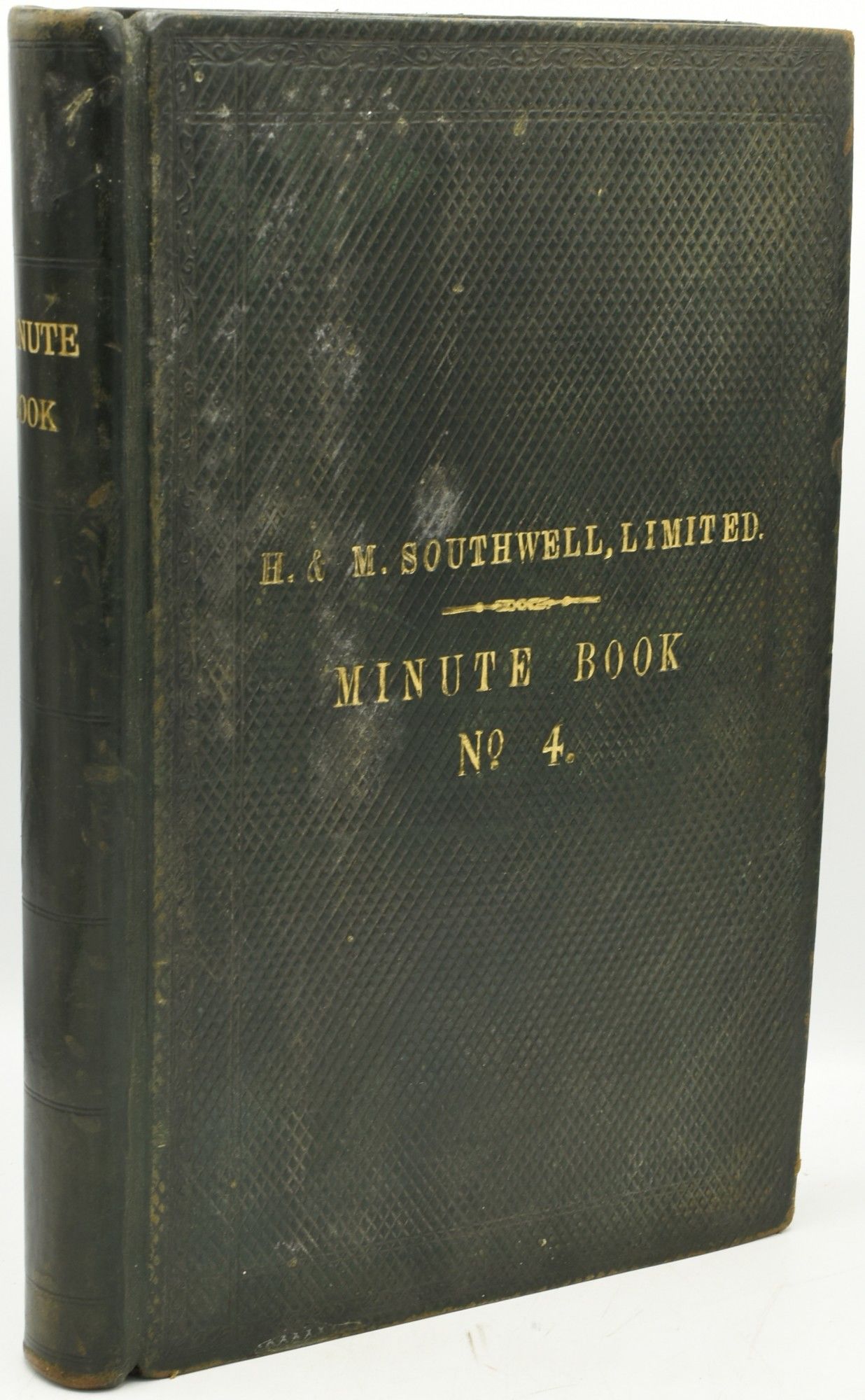 London: H. M. Southwell, 1936. Full Leather. Very Good binding. The board minutes of the H. & M. Southwell company, carpet manufacturers, from July 15, 1933 through October 2, 1936. With 192 pages filled in, of holographic minutes, typewritten minutes and official correspondence pasted in. With a blank alphabetically tabulated section at the front. Bound by Jordan & Sons with their bookplate on the front pastedown. Green leather with gilt lettering, embossed with a diced pattern on the boards. All edges marbled. Very Good binding.
