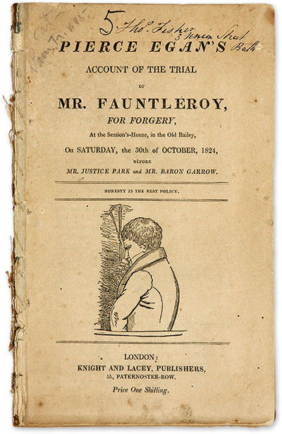 1824. London: Knight and Lacey, Publishers, [1824]. London: Knight and Lacey, Publishers, [1824]. One of the Last People Executed for Forgery in Great Britain [Trial] Fauntleroy, Henry [1785-1824], Defendant. Egan, Pierce [1772-1849], Reporter. Pierce Egan's Account of the Trial of Mr.Fauntleroy, For Forgery, At the Session's-House, In the Old Bailey, On Saturday, The 30th of October, 1824, Before Mr.Justice Park and Mr.Baron Garrow. London: Knight and Lacey, Publishers, [1824]. 67 pp. Octavo (8-1/4" x 5-1/4"). Disbound stab-stitched pamphlet. Light soiling and edgewear, moderate toning to text, minor chips and tears to a few leaves, early owner signature and "5" to head of title page. $750. * Only edition. Fauntleroy was an English banker convicted of forgery. He admitted his guilt, but pleaded that he forged documents in order to access funds to pay his firm's debts. Several bankers and merchants stepped forward to defend his integrity during the trial, but he was sentenced to death. He appealed his case twice without success. Appeals for clemency followed, but they were not successful. He was hanged in November 1824, one of the last people executed for forgery before it ceased to be a capital crime in 1836. British Museum Catalogue (Compact Edition) 9:70.