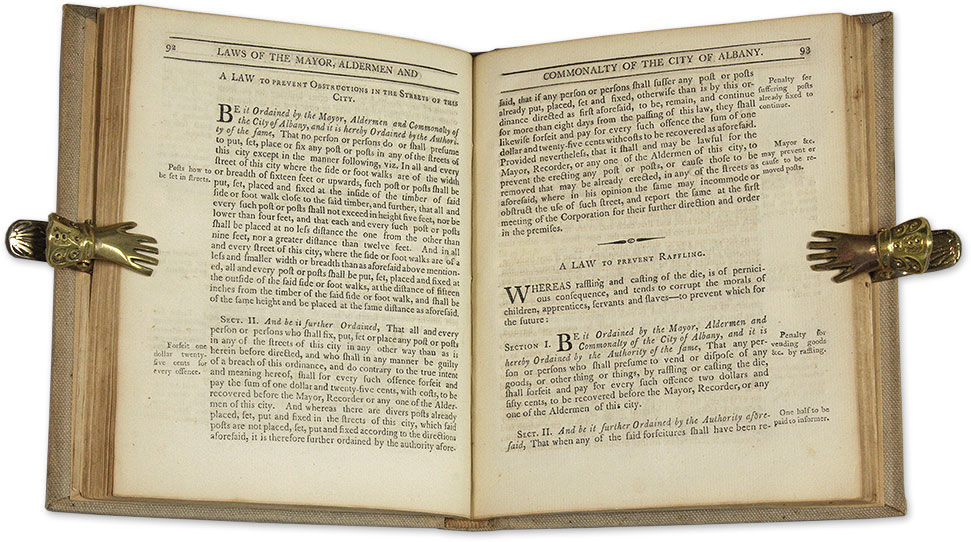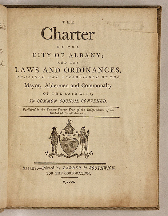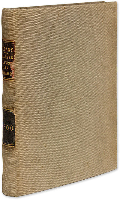 1800. Albany, 1800.. Albany, 1800. Albany, New York in 1800 [Albany]. [New York]. The Charter of the City of Albany; And the Laws and Ordinances, Ordained and Established by the Mayor, Aldermen and Commonalty of the Said City, In Common Council Convened. Albany: Printed by Barber & Southwick, For the Corporation, 1800. 158, [2] pp. Folding table. [4] pp. manuscript list in contemporary hand titled "Mayors and Recorders of the City of Albany from the Commencement of the Charter" bound before title page. Quarto (7-1/2" x 6-1/4"). Later library cloth, red and black lettering pieces to spine. Light soiling and shelfwear, a few minor stains to boards, chipping to edges of lettering pieces. Moderate toning to text, minor tear to folding table, lower corner lacking from foot of Leaf Q1 (pp. 121-122) and upper corner lacking from title page, both with no loss to text, library stamp to head of manuscript list, which is just beginning to detach, library mark to verso of title page. $500. * Only edition. This volume contains the text of Albany's 1686 Dongan Charter, which remained in force until 1998, and later laws and ordinances. It offers an interesting perspective on New York's second-oldest city. Not in Cohen.