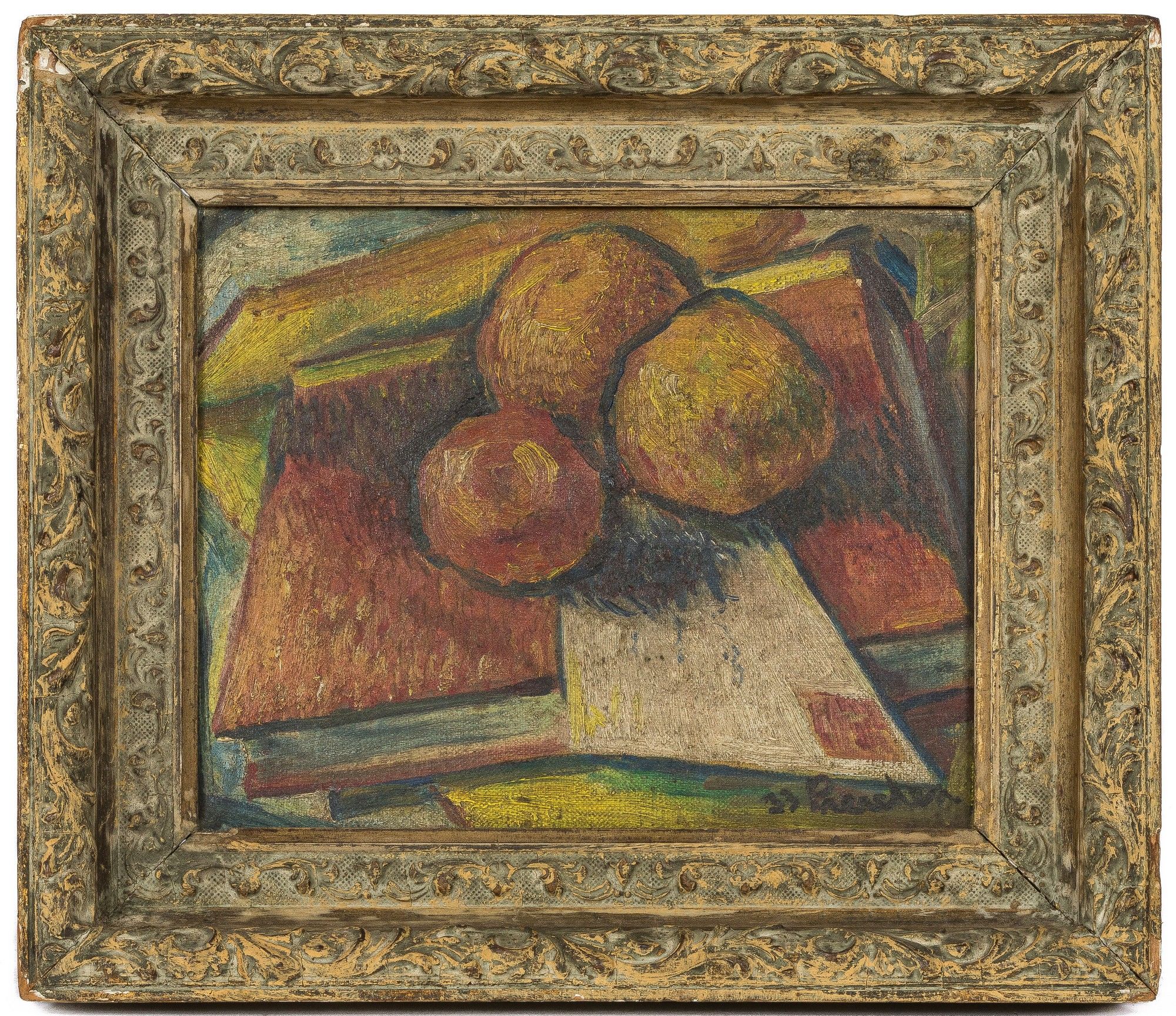 1933. Very Good. Color acrylic painting on canvas. Stretched over a wood frame (10” x 8”) and loosely mounted inside an ornate wood frame (14” x 12”). Signed and dated by the artist: “33 Preston [?]” at the bottom right corner and on the back of the canvas. Some dust soiling and wear to the edges of the wood frame, about very good. An attractive early 20th century cubist still life painting of fruit on top of a book, in a handsome wood frame.