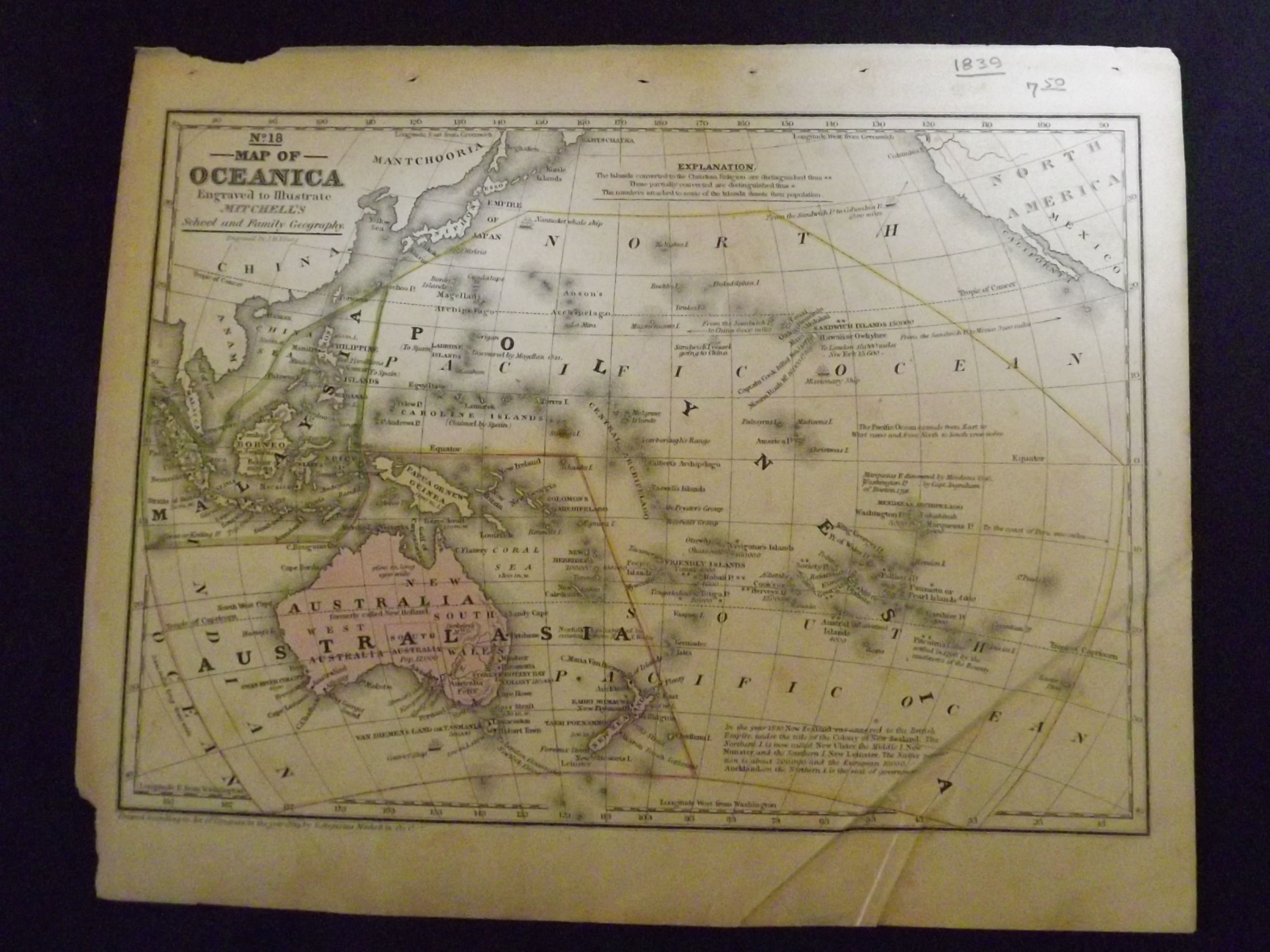 Engraved colored map, 9" x12", Box like cartouche with map information. Some light aging and browning, a couple of small holes in top margin where it was bound, not affecting image, a couple of margin chips, creasing in the lower right portion of the map, affecting the lettering more than image; otherwise good. Pricing will reflect creasing. Interesting and early small map of Oceanica. From a school and family geography.