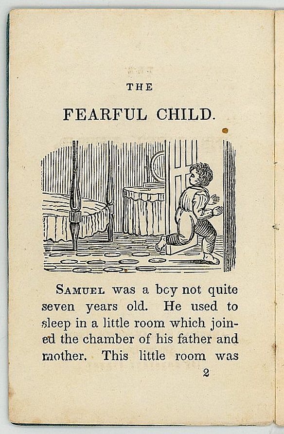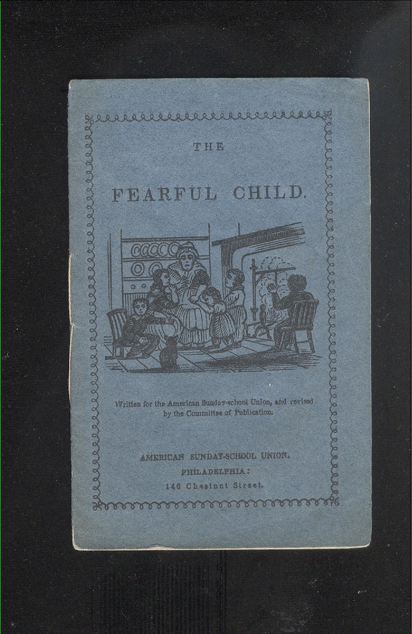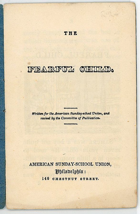 Philadelphia: American Sunday School Union, 1859. 8 pp. wrapper, with 3 woodcuts. Written for the American Sunday School Union, and revised by the Committee of Publication. Apart of a series published by the American Sunday School Union, called Child's Home Library. It tells the story of a little boy over coming his fear of the dark. Some wear, cover is tearing at edge, slight toning. Measures 4 1/4" x 2 1/2