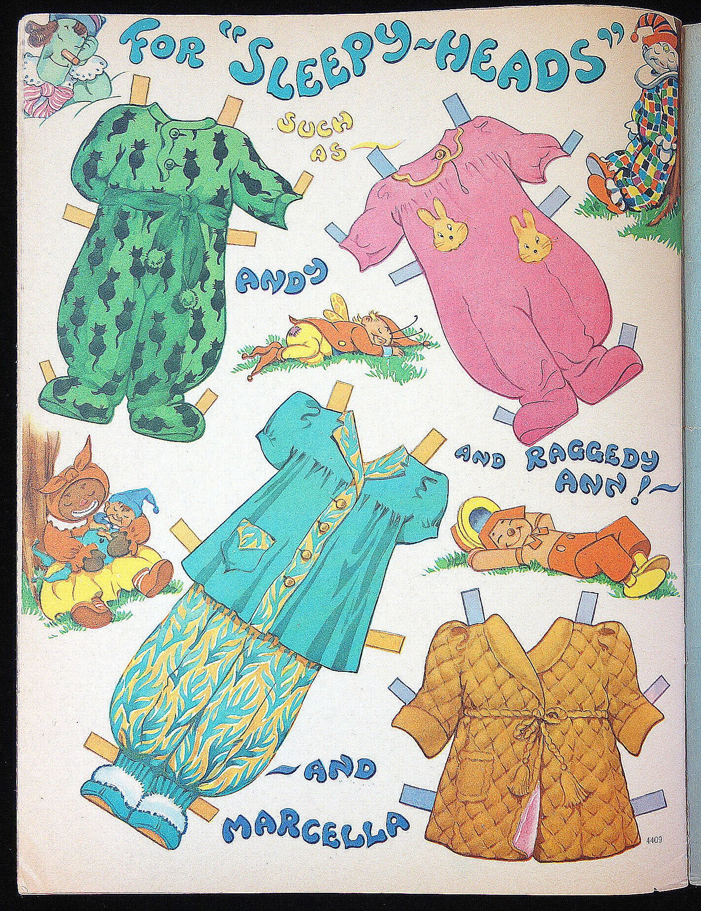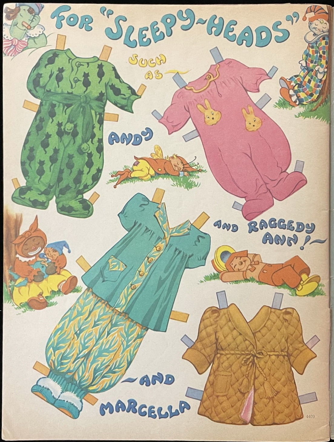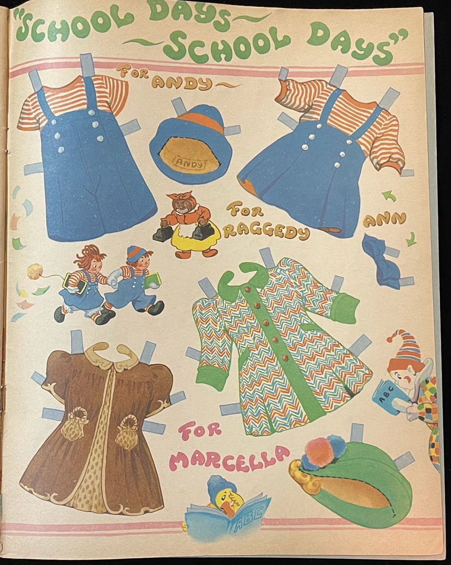 Saalfield, 1944. Minor edge wear on cover. A large format book with heavy stock litho covers. Includes four (4) pages of paper doll clothes for Marcella, Raggedy Ann and Andy. There are three (3) paper dolls plus toys to be punched out on back cover. The remainder of the book is an unused captioned coloring book of scenes of adventures with the two dolls and the young girl. Measures 14" x 11