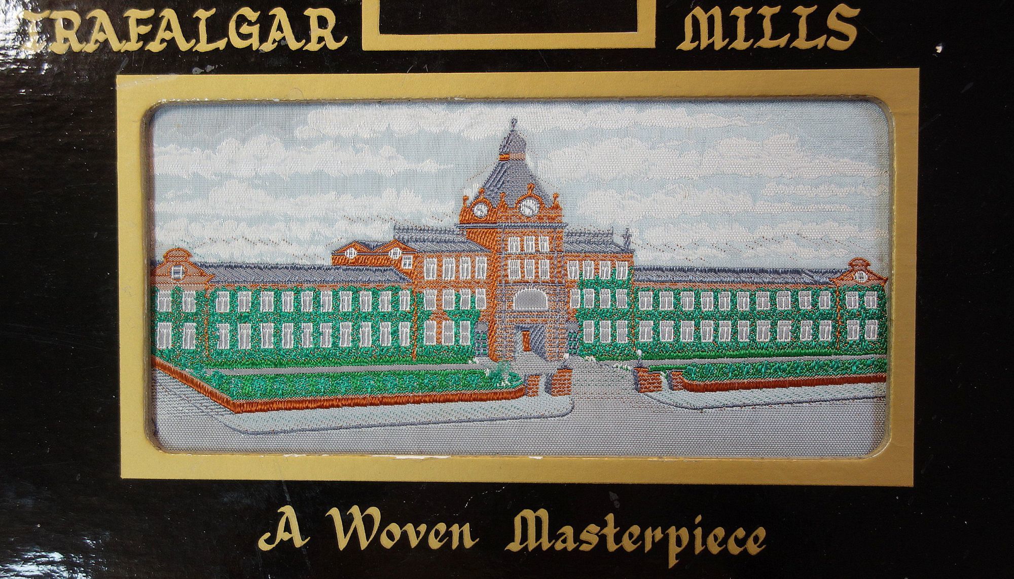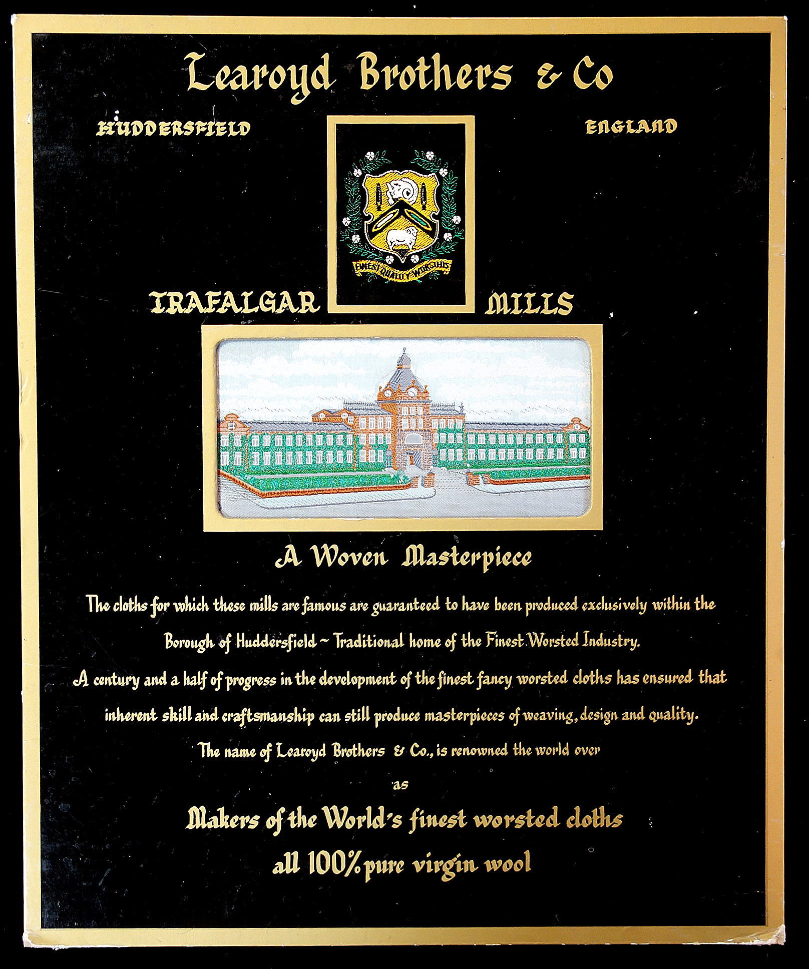 Huddersfield, England. light edge wear.. A 14.25" by x 11.75" easel back heavy stock show card with diecut and woven silk inset of the companies factory in Huddersfield, England, known as Trafalgar Mills. The fine silk weaving measures 3" by 6" and is referred to in the advertisement as "A Woven Masterpiece". Learoyd Brothers & Co., is renowned the world over as Makers of the World's finest worsted cloths all 100% pure virgin wool. Trafalgar Mills in Huddersfield were built in 1896. The building was designed by the founder of the firm, Mr A E Learoyd, and its basic layout was so modern in concept that, apart from the introduction of new types of machinery, no changes were necessary to maintain its reputation as one of the best planned mills in the industry.