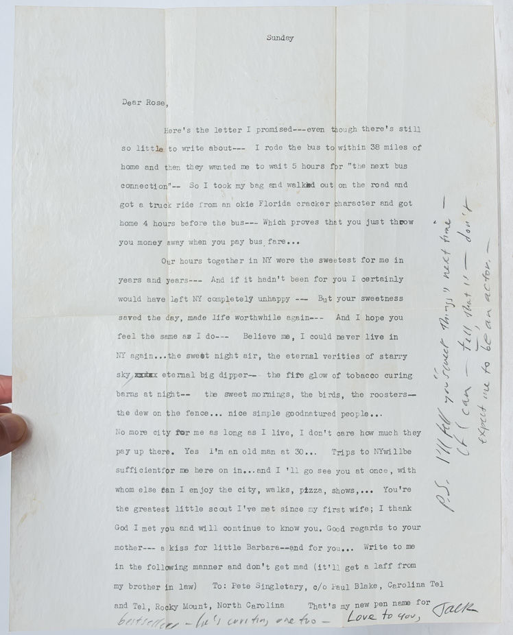 Rocky Mount, NC, 1952. One page Typed Letter Signed "Jack" in pencil with an additional 4 lines added in his hand. On 8.5 x 11" onionskin paper, with original fold lines. Near Fine condition. Neither the letter or its recipient Rose Enoch Rotberg appear in Jack Kerouac: The Selected Letters or in Jack Kerouac: A Biography. The content places this letter at the time of Kerouac's return home from his trip to Mexico City, as he entered into one of the most productive periods of writing in his life.