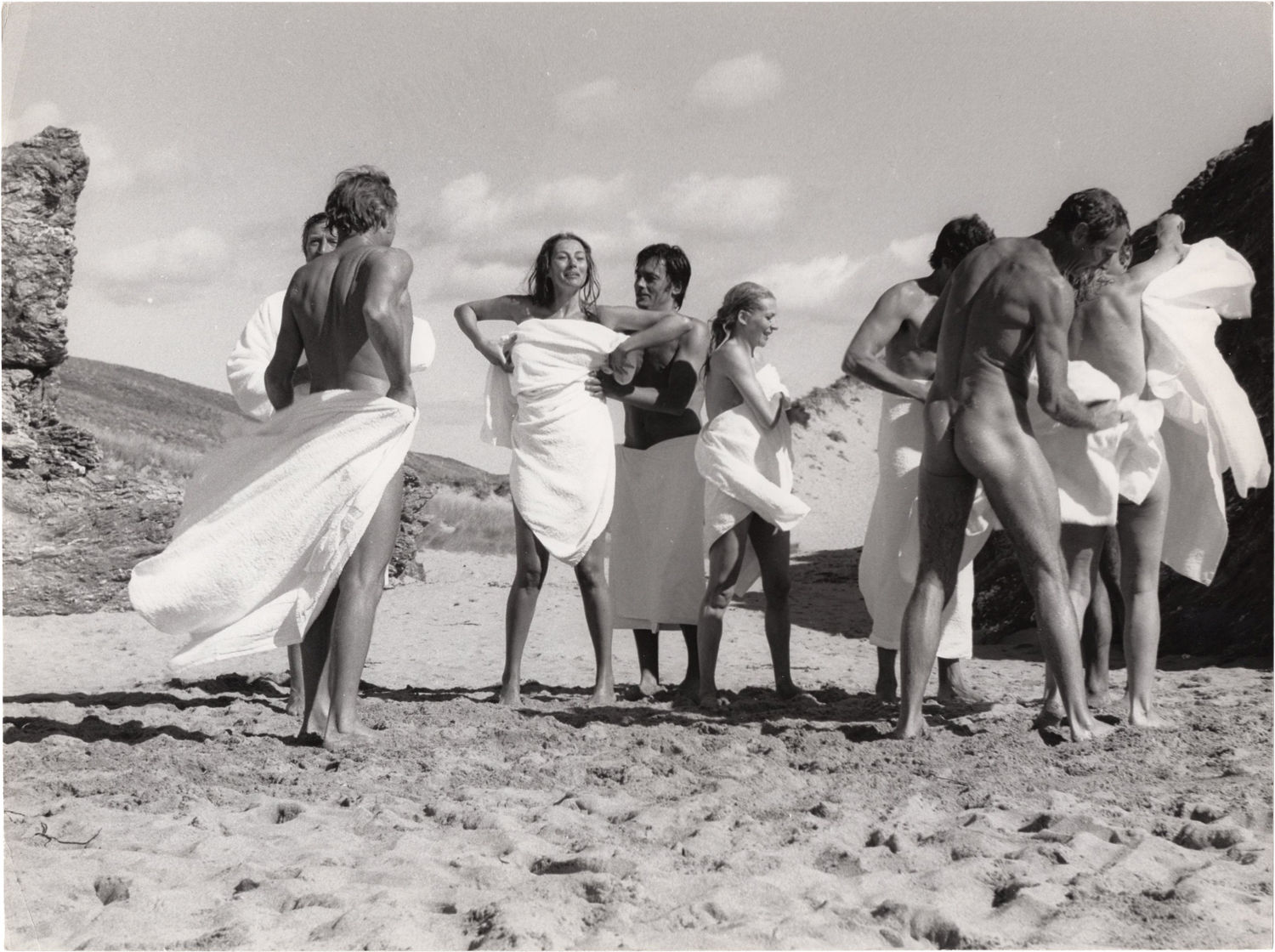 Burbank, CA: A.J. Films, 1973. Vintage borderless photograph of actor Alain Delon, nude along with various members of the cast on a beach location during shooting of the 1973 film. With manuscript annotations on the verso.