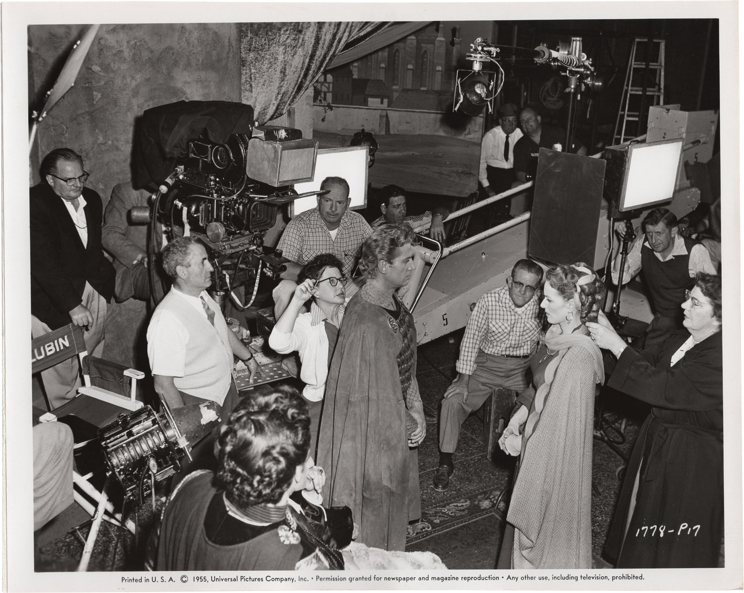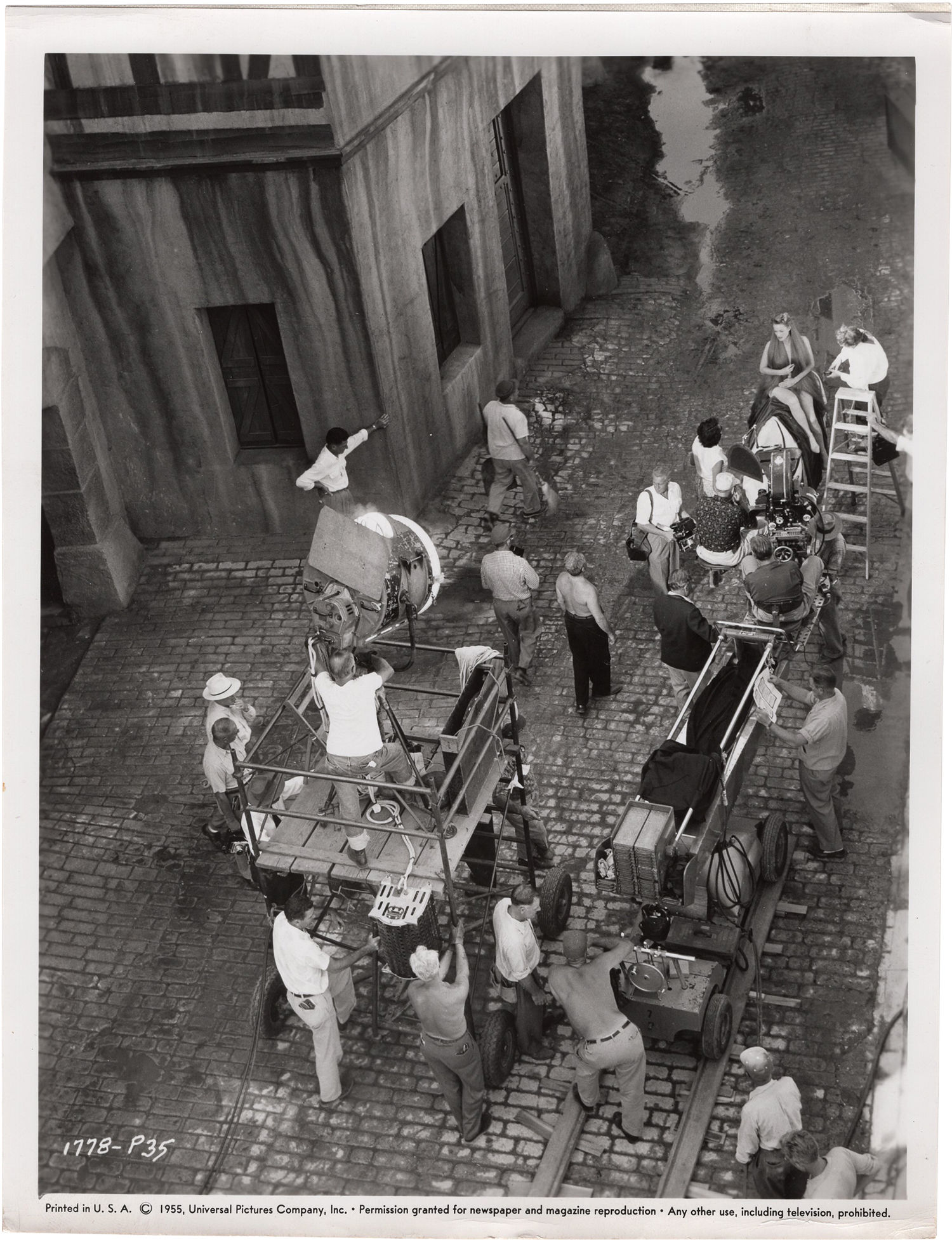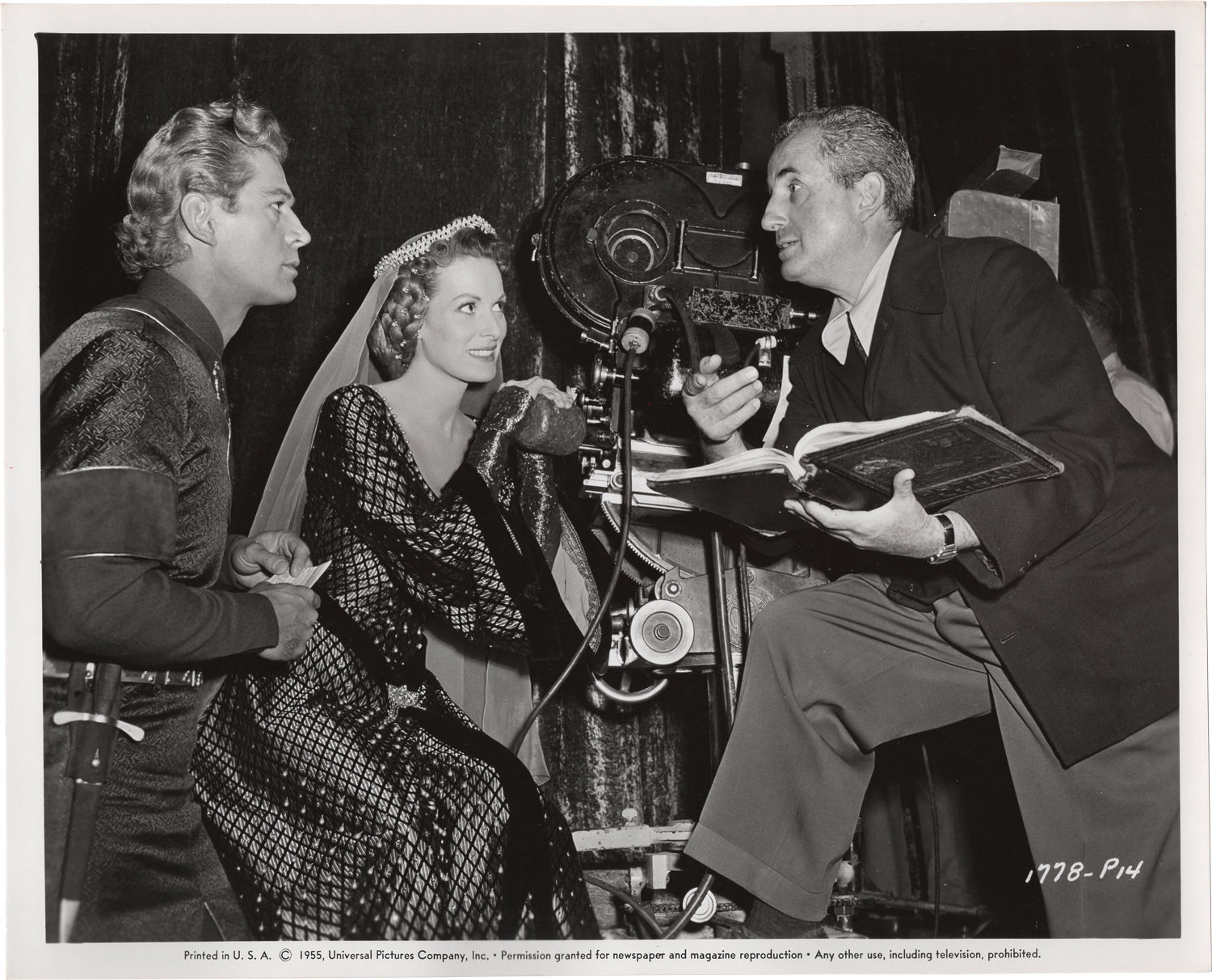 Universal City: Universal International Pictures, 1955. Three vintage linen backed photograph from the set of the 1955 film. Mimeo snipe affixed to the verso.