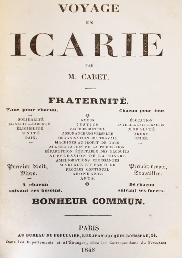 Paris: Au Bureau du Populaire, 1848. Cinquième Édition. 12mo (18cm.); contemporary plum morocco-backed marbled boards, spine in five compartments, green morocco spine label, marbled endpapers; [4],viii,600pp. Spine sunned, boards a hint scuffed, else a Very Good to Near Fine copy. First published in 1840, "Voyage en Icarie" presented in novelistic form the theories of Cabet's Icarian movement in which "society...placed all economic activity under the guidance and control of elected officials and made the family the only other politically influential unit" (Richard C.S. Trahair, "Utopias and Utopians" (1999), p. 199). By the year of the Revolution of 1848 (and the publication of this edition) there were some 400,000 Icarians in France, a handful of whom established a community in Denton County, Texas, Cabet joining them shortly after, in 1850. The Icarians suffered in Texas, their numbers far fewer than they had hoped for after the fall of Louis Philippe and the rise of the Second Republic. Furthermore, most members chose to reside in New Orleans, and the land alloted them was not the million acres they had been promised, but two disparate tracts totallying only 10,000 acres (see Robert S. Fogarty, "Dictionary of American Communal and Utopian History" (1980), p. 147). Upon Cabet's arrival in the United States the group, now totalling only 200, migrated to Nauvoo, Illinois, which had recently been evacuated by the Mormons. After a short period of prosperity, schisms errupted and by 1856 Cabet and his followers had formed a splinter group, moving on to Cheltenham, Missouri, where Cabet died shortly thereafter. ADAMS, p. 45 (citing this edition, though with variant title page); NEGLEY 175; SABIN 9787 also cites the fifth edition, though with a different imprint and subtitle.