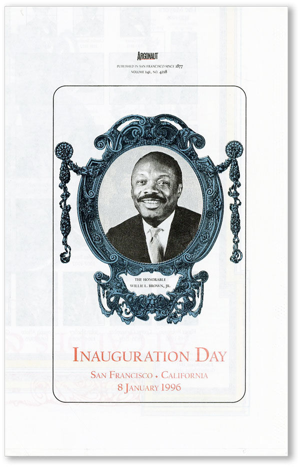 San Francisco: Argonaut, 1996. First Edition. Single leaf folded into 8-panelled brochure; illus. Fine condition. Supplemental issue of the local San Francisco newspaper featuring special events on the occasion of the inauguration of the city's first African-American mayor, Willie L. Brown, Jr., who was in office from 1996 to 2004. Brochure opens up into color poster displaying portraits of all past alcaldes and mayors of the city, with Brown prominently displayed at the center.