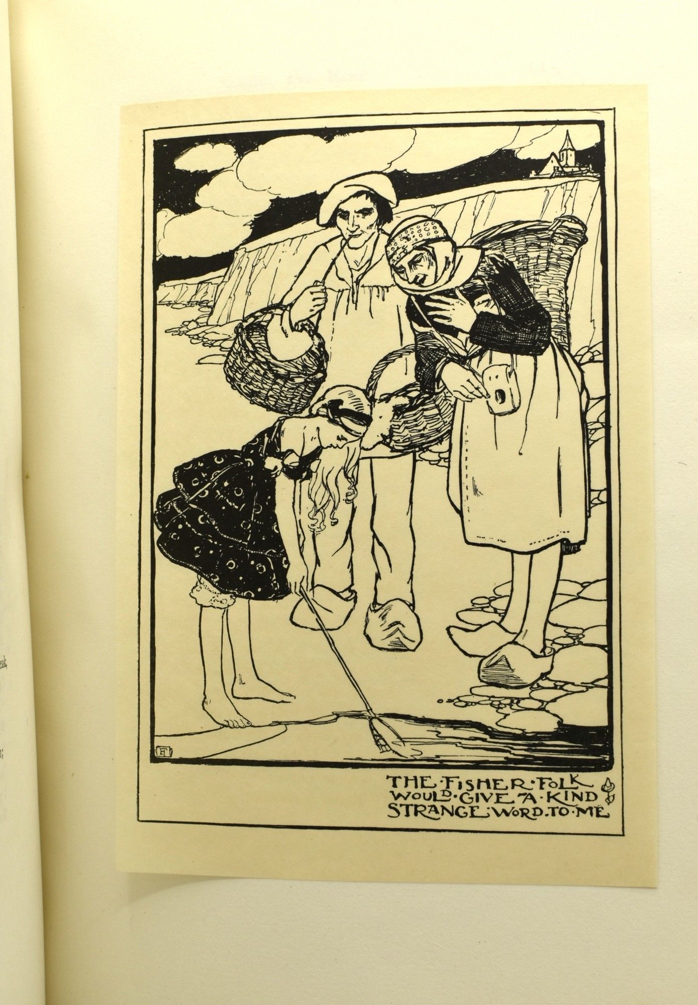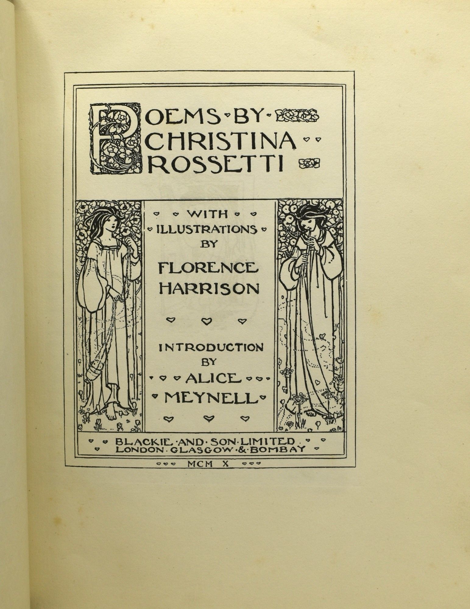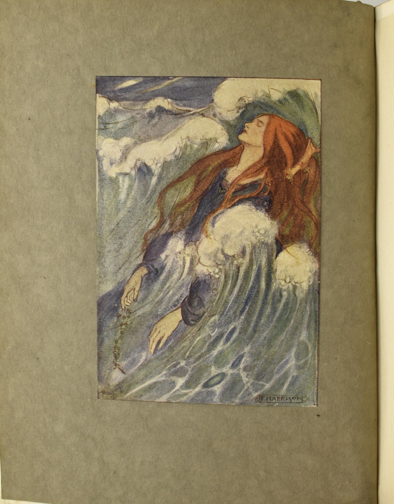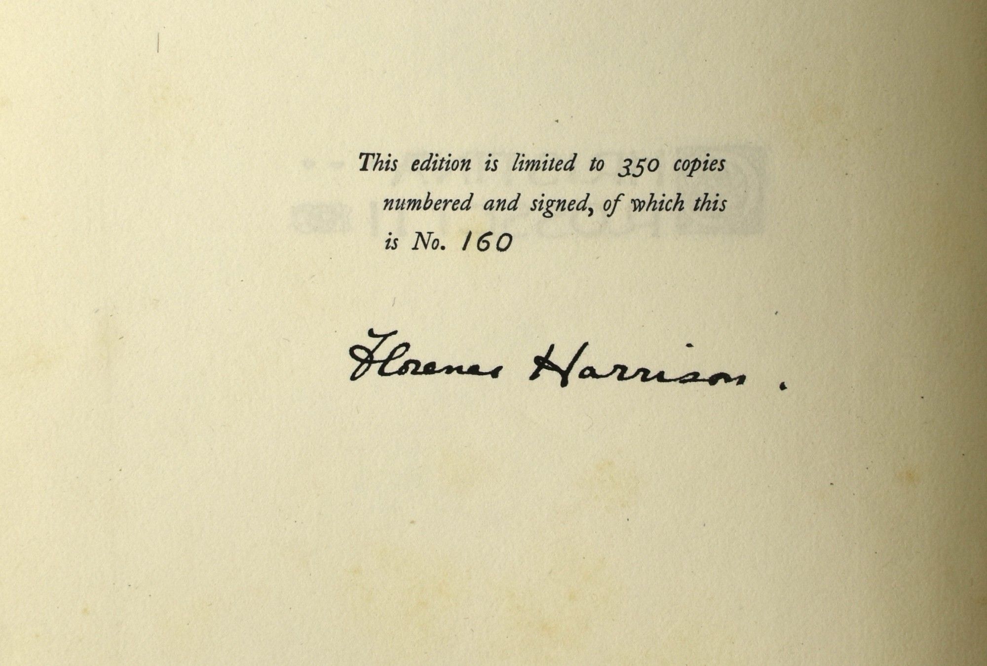 London: Blackie & Son, Ltd, 1910. De Luxe Limited Edition. Full Leather. Very Good binding. Number 160 in the De Luxe Edition, limited to 350 copies. Signed by Florence Harrison, the illustrator. With 36 tipped in color plates on grey mounts, and 34 black and white plates on white mounts; as well, there are splendid drawings throughout. The plates are all fine, as are the captioned tissue guards which protect the color plates. The vellum binding has darkened and has soiling and spotting. The ribbon ties are lacking. Laid in is a prospectus from Blackie with "Some Press Opinions" for the book, and on the verso the same for Florence Harrison's Guenivere. Previous owner bookplate on the pastedown. There is very light and scattered foxing to the preliminary leaves. Very Good binding.