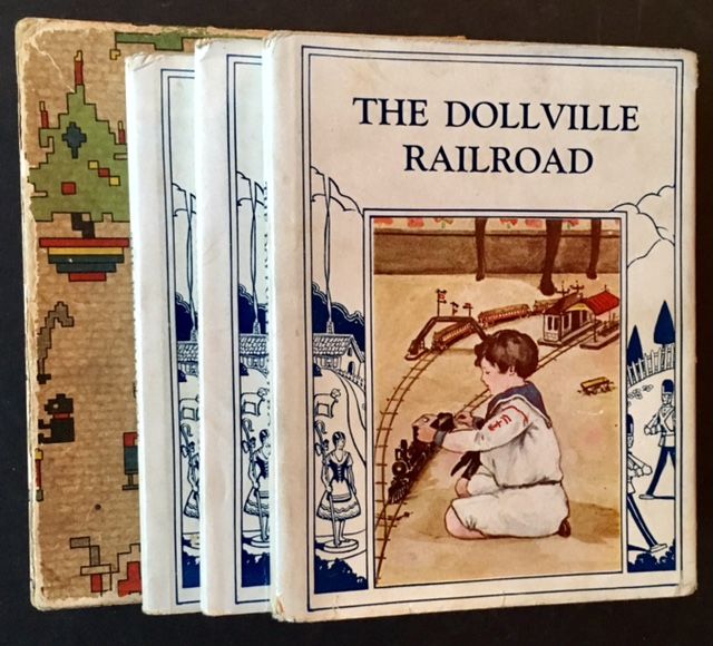 New York: Barse & Co, 1928. Boards. Near Fine/Near Fine. Joseph C. Claghorn. The 1st 3 volumes in this wonderful 1928 "Toyland" series, which consists all told of 3 separate sets of 3 books (making up 9 separate books in the series). This 1st set (representing the 1st 3 titles in the series) consists of "The Unhappy Paper Doll", "The Policeman Cat" and "The Dollville Railroad". All 3 books are in very sharp condition and each is clean and Near Fine to Fine in crisp, VG+ to Near Fine dustjackets. Very light staining at The Dollville Railroad's rear jacket panel and one very small closed tear to The Unhappy Paper Doll's front jacket panel, otherwise all 3 books are clean as could be and present remarkably well. Uniform 64mos (miniatures), lovely color illustrations thruout by Joseph C. Claghorn. The set of 3 also includes the very uncommon original pictorial box, which shows light wear and creasing along the edges but undoubtedly accounts for the superb condition of the 3 books it houses.
