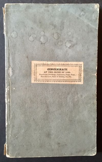 Cincinnati: Morgan, Lodge, and Fisher, 1827. Original wraps. Very Good -. The February 1827 1st edition, in its original slate-gray wrappers. Includes both of the engraved tipped-in plates ( The Branch Bank {U.S. Cincinnati} and The Medical College of Ohio) AND the mounted title-label to the front panel ("Cincinnati at the Close of 1826. Population, Buildings, Commerce, Steam Boats, Manufactures, State of Society, &c. &c."). Solid and VG-, with light spotting to the panels and light chipping along the spine ends (with minor loss at the crown). A light level of forgiveable foxing --with most concentrated at the rear pastedown and endsheet-- otherwise the pages and crisp and well-preserved. 12mo, written by 2 of Cincinnati's "Attorneys and Counsellors at Law", B. Drake and E.D. Mansfield.