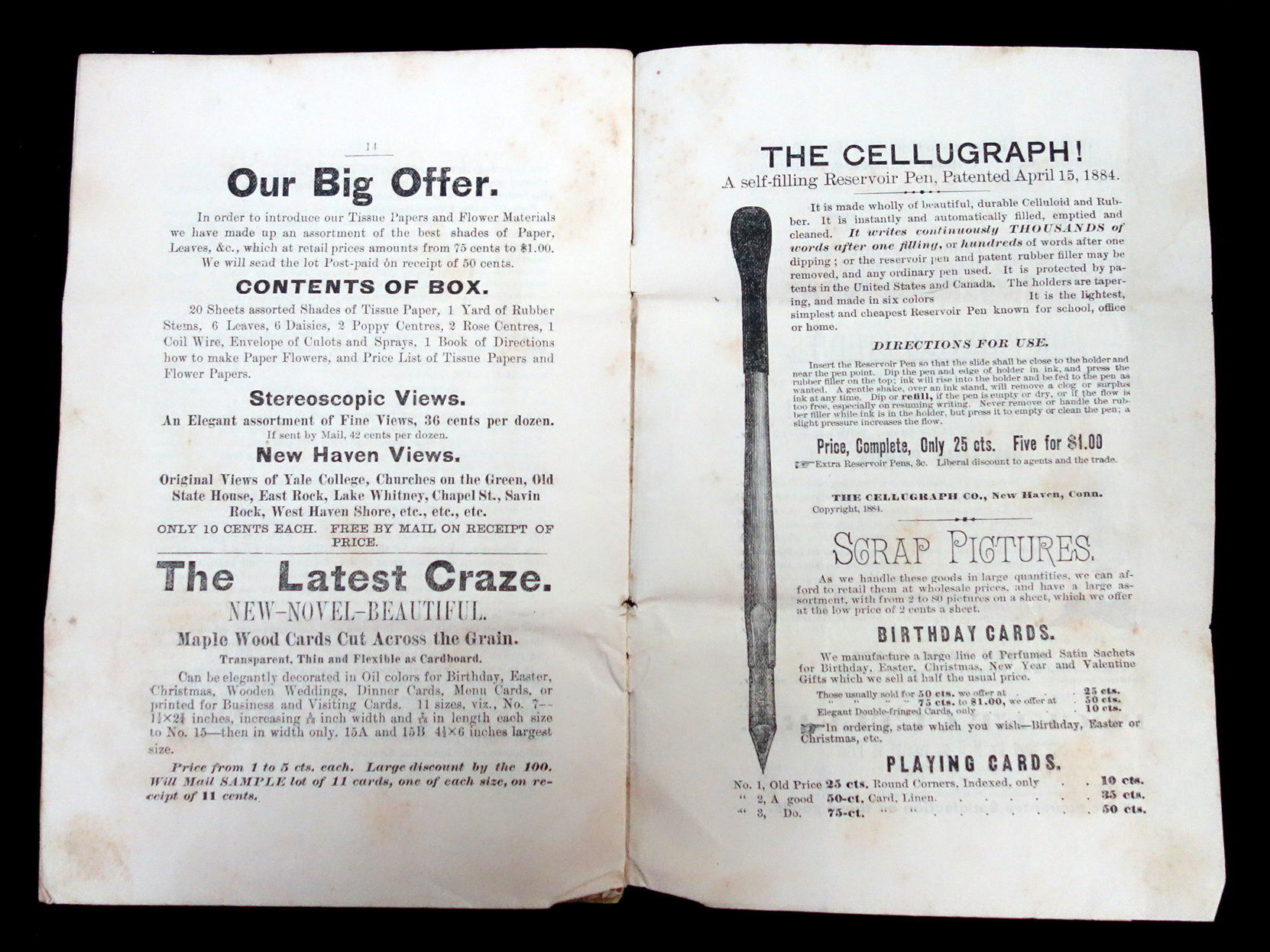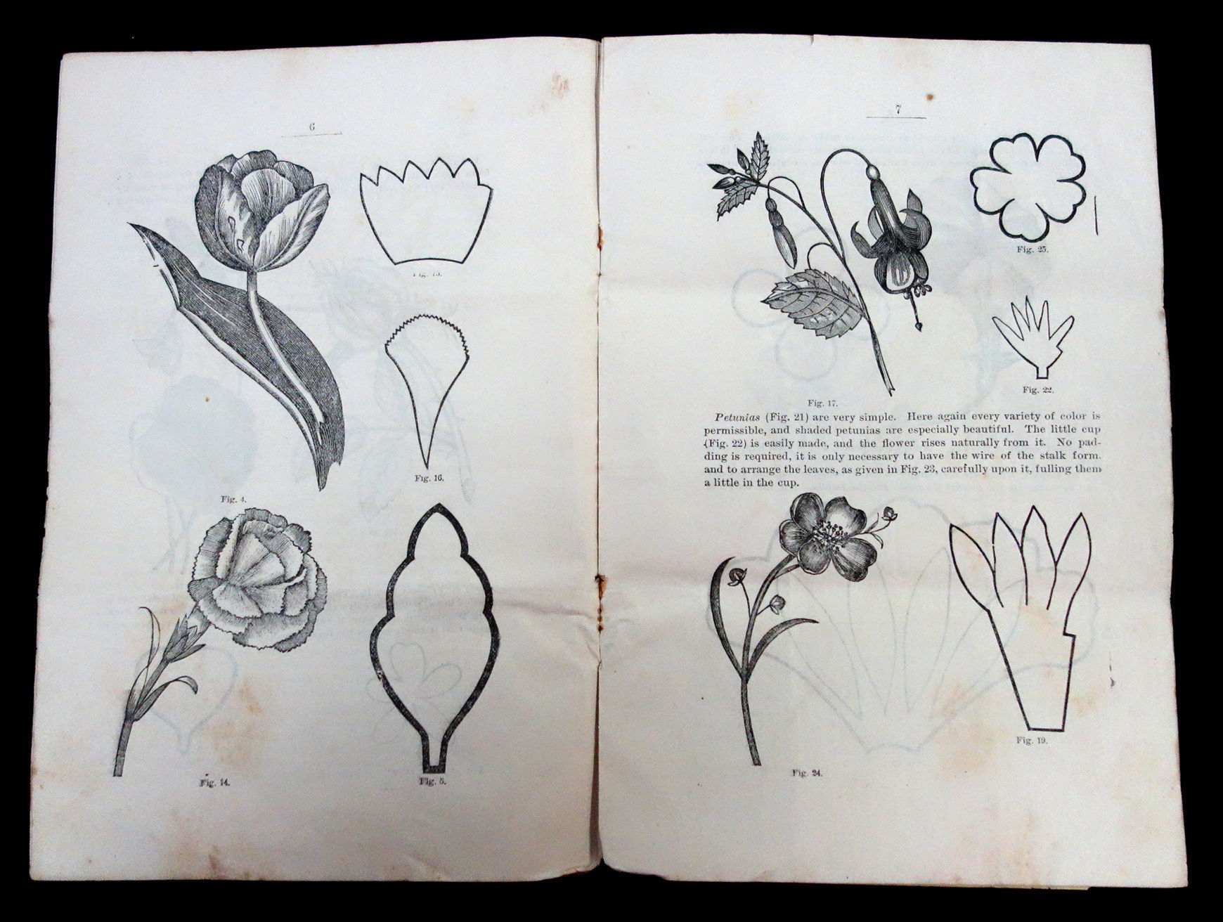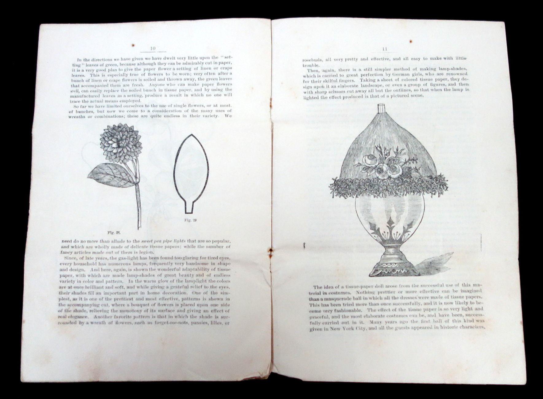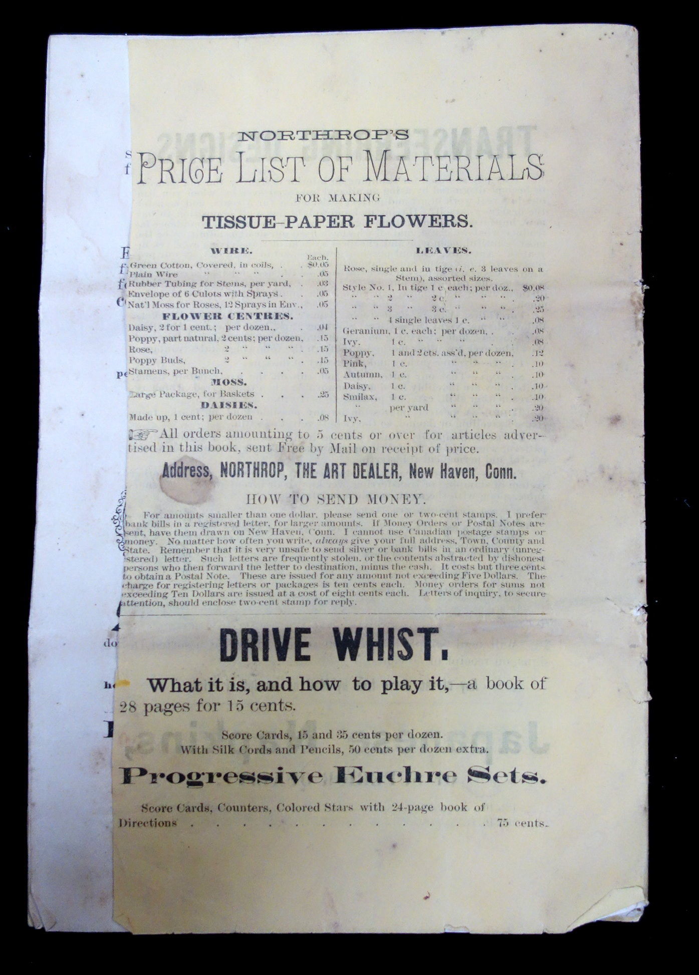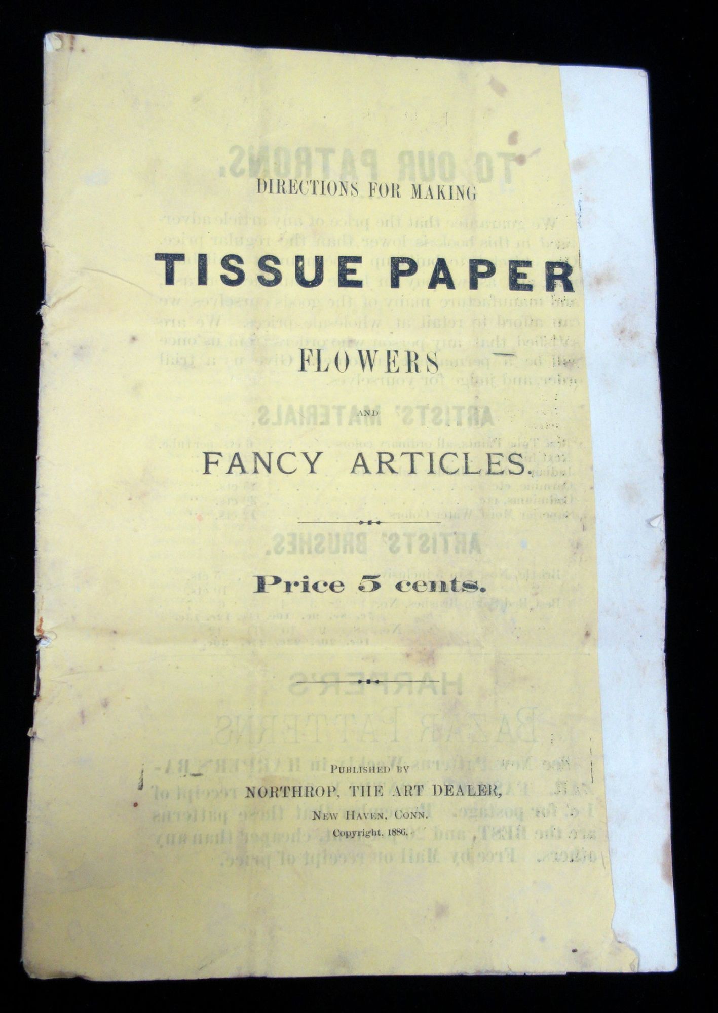 New Haven, CT: Northrop, The Art Dealer, 1886. Yellow wrappers have been trimmed on both the front and back by about 1/2" Letter folds. Moderate wear.. 16 pp. staple booklet. Yellow wraps.. Instructs the reader on how to make various tissue paper flowers or other items such as tissue paper lamp shades. Instructions on making Tulip, White, Jasmine and Fuchsia. The last few pages of the booklet have advertisements, including instructions on how you can order all the tissue paper needed to make the flowers in the book. Other advertisements are for pens, pocket cutlery and "something new" colored transparent visiting cards. Measures 8 1/2" x 5 3/4