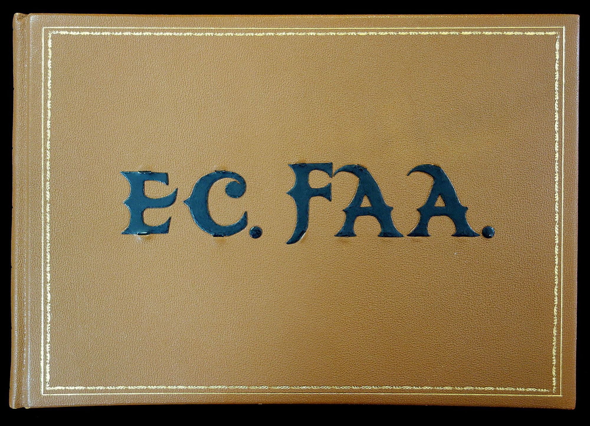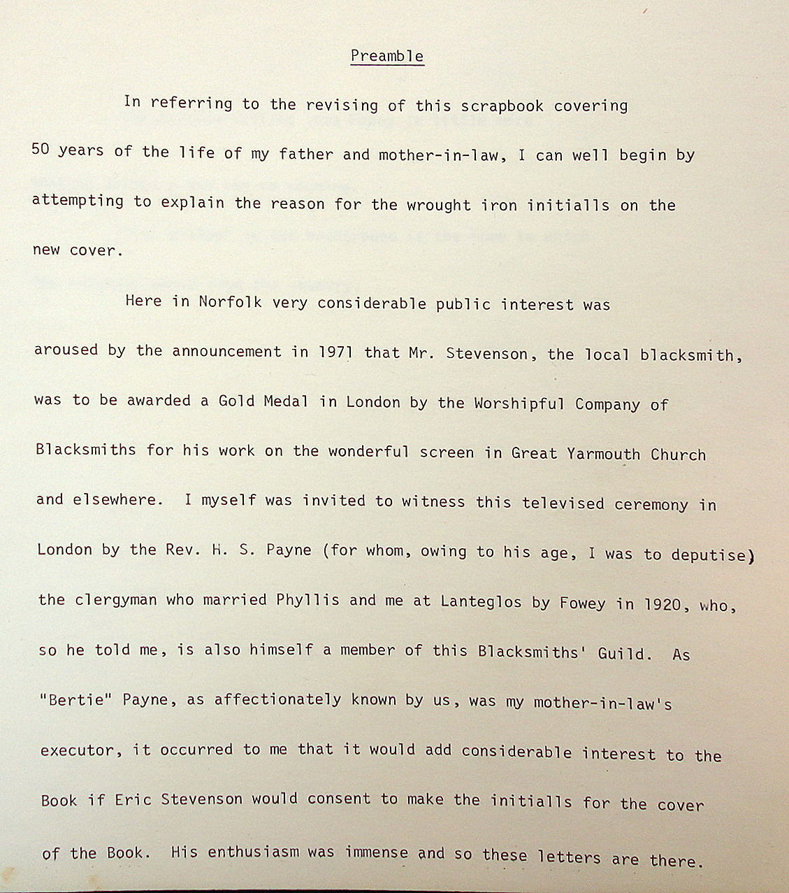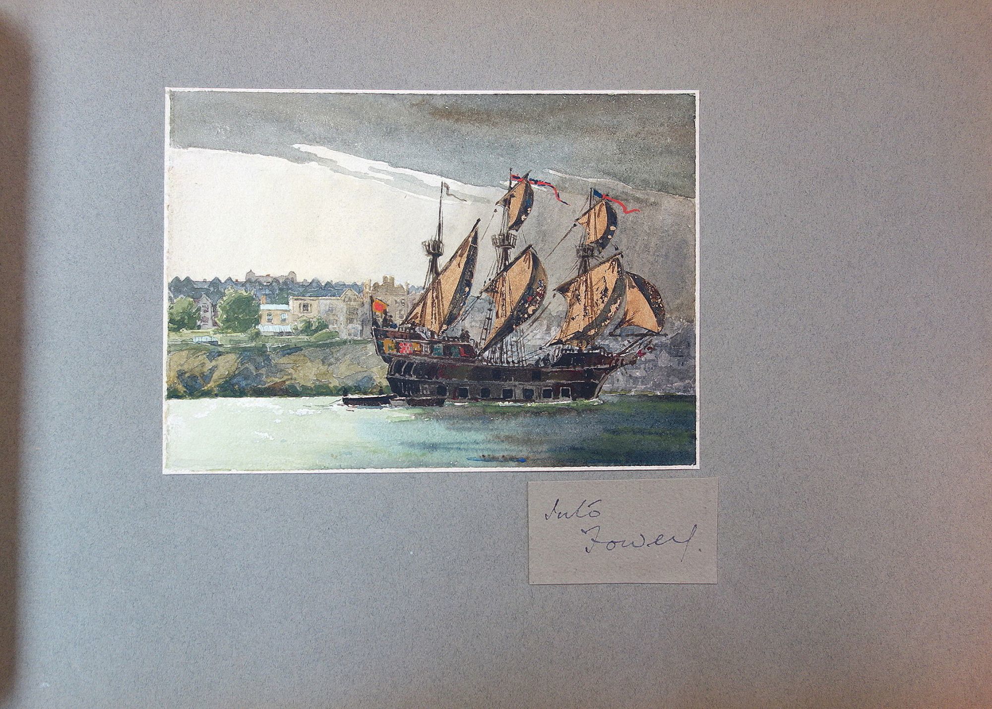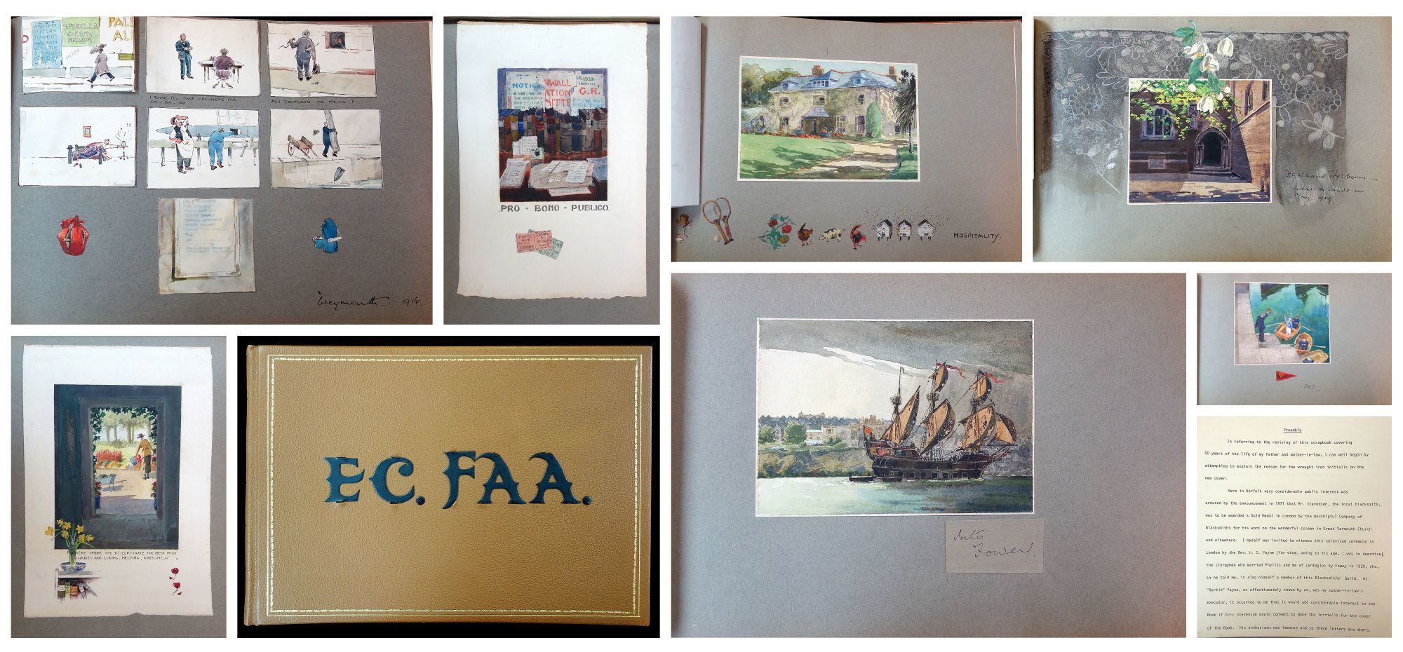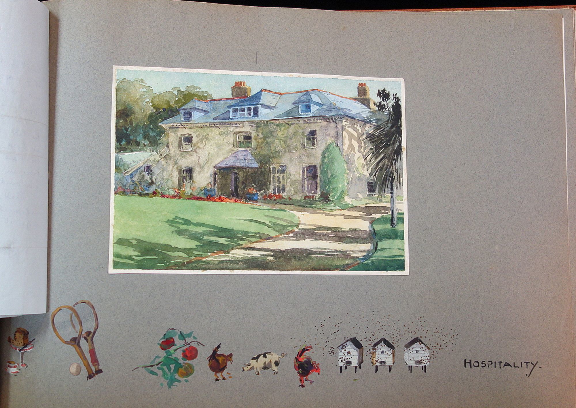Wroxham,Norfolk, England, 1972. A large format album reconstructed album illustrated and narrated by Charles Arthur Hannaford. The majority of the content, excluding the narration was created by his father in law and reflected the life of Frank Albert Allchin and his wife Emily Cooper, between the years 1879 and 1929. The cover of the album has applied steel initials of the couple handwrought by a member of the Blacksmiths' Guild. This fine album contains 16 typescript pages of commentary, preceding each of the 16 watercolor pages. Each page is noteworthy and in most instances includes some original watercolor(s) from the original album. They include a galleon at Fowey with the Allchin's family of ·St. Willow· in the background; St. Albans, 1925