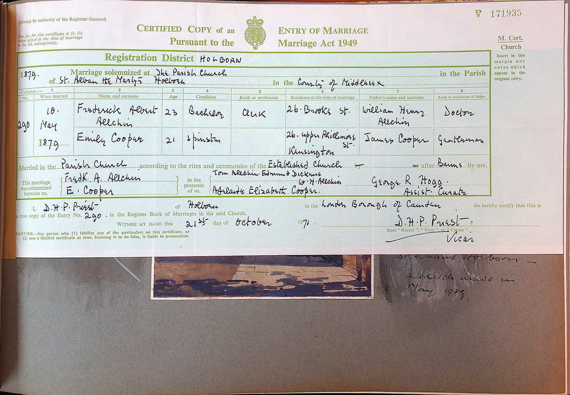 the marriage certificate of Frank (born Frederick) and Emily. Presented in a beautiful leather bound album with initials on the front
