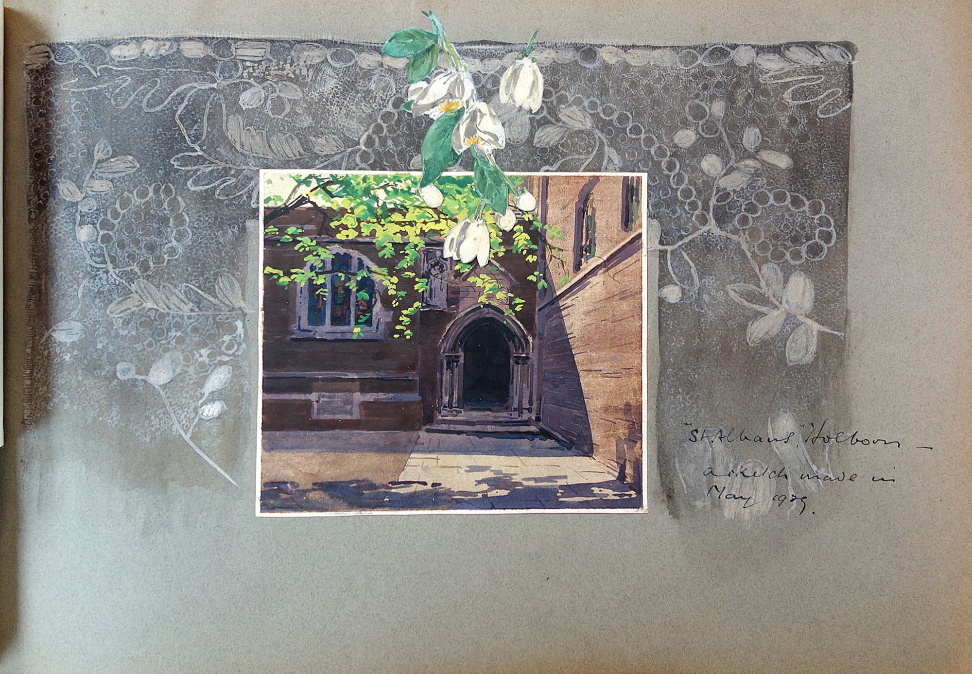 "St. Albans" Holborn - sketch made in 1929 - of particular note as the background created by Hannaford was done after his mother-in-laws wedding veil. The white flowers at top are cut away from the background page and the watercolor is tucked beneath it. A copy of their marriage certificate precedes this page.