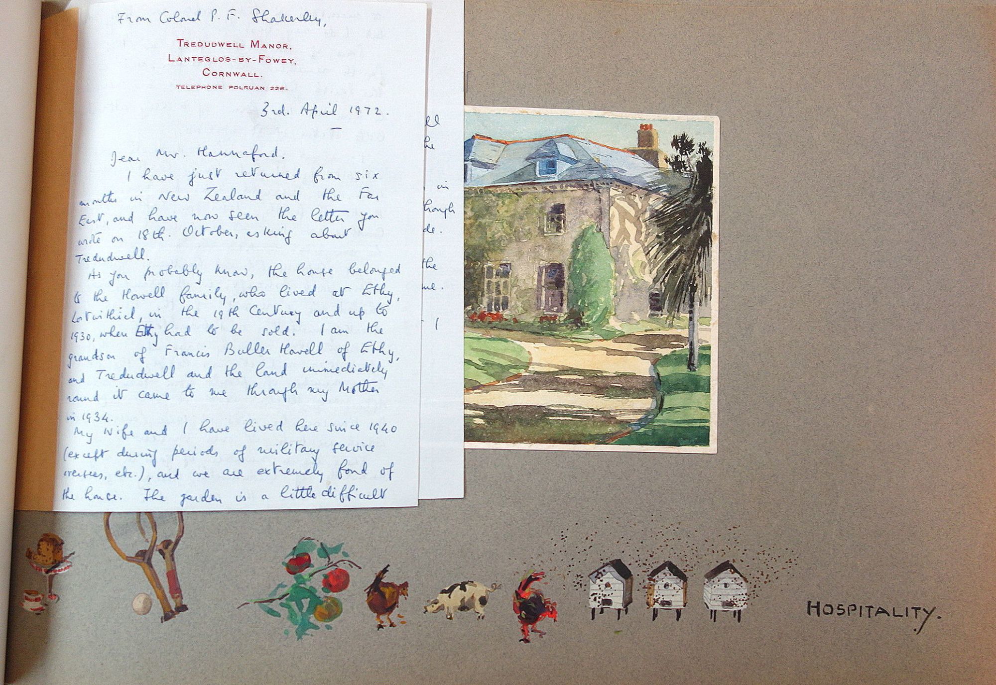 A view of Tredudwell Manor, Cornwall, with accompanying letters (1972) from Colonel Shakenley who lived at the Manor, embellished with farm animals, bees, etc.
