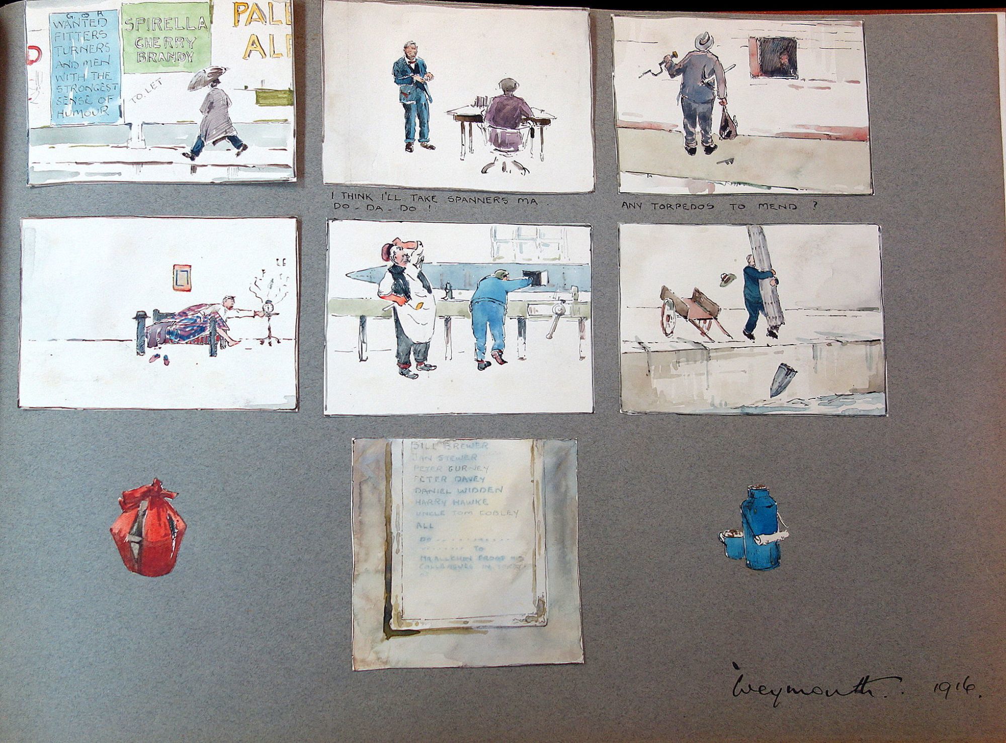 A series of seven (7)small watercolors telling the story of mending the torpedo . Caricatures of Figures in Weymouth, 1916;