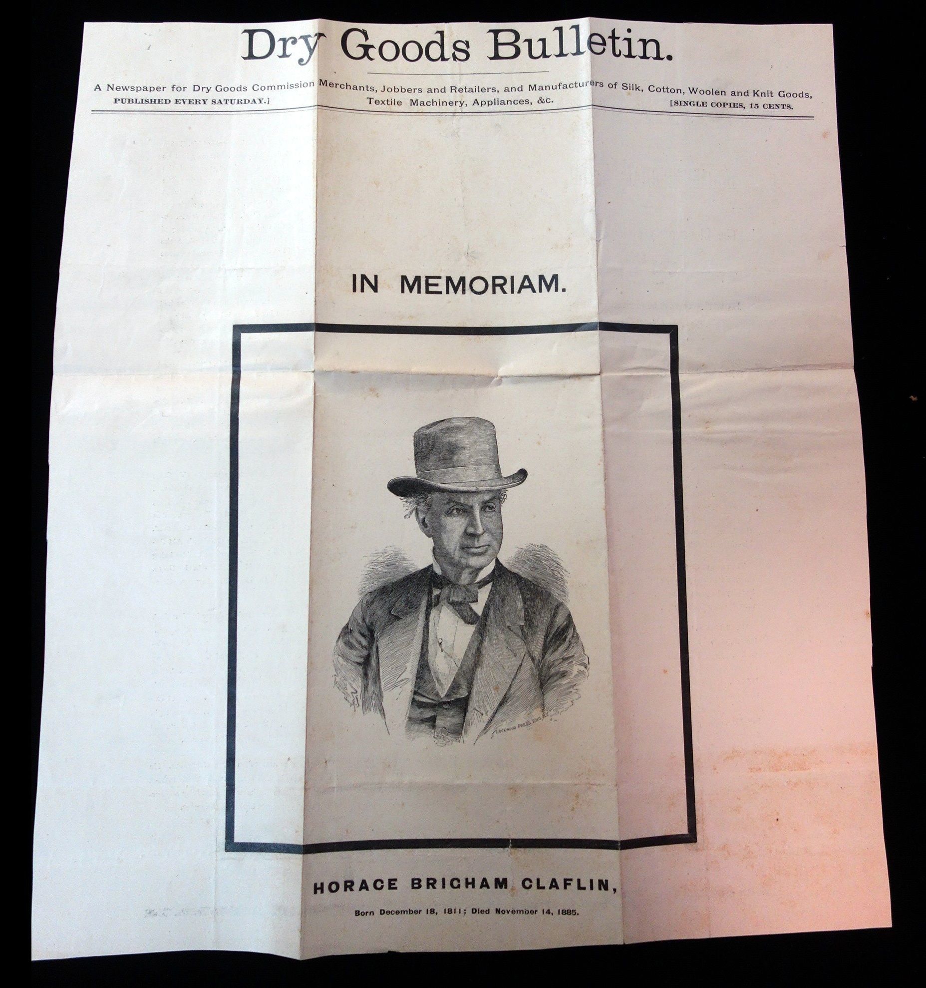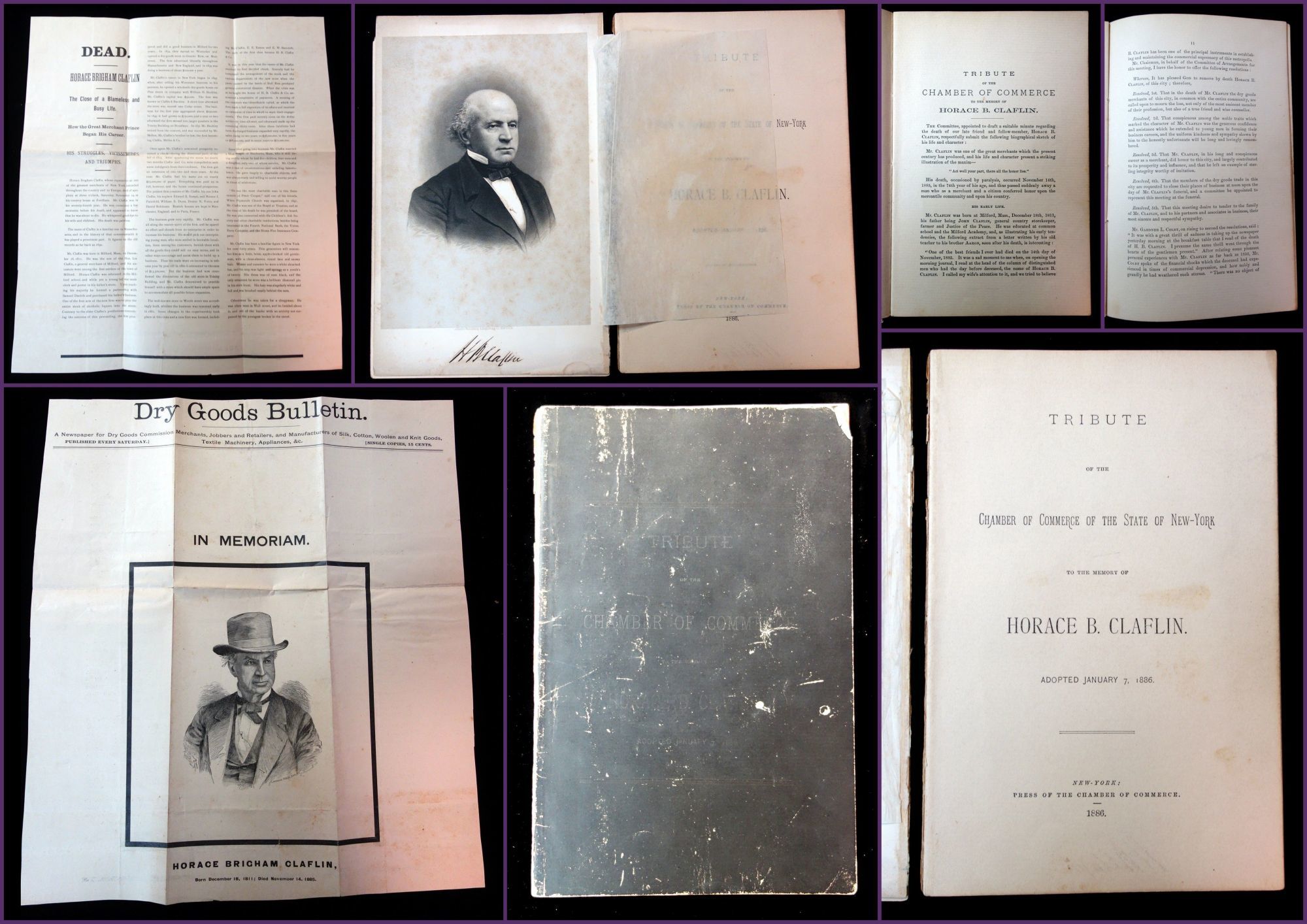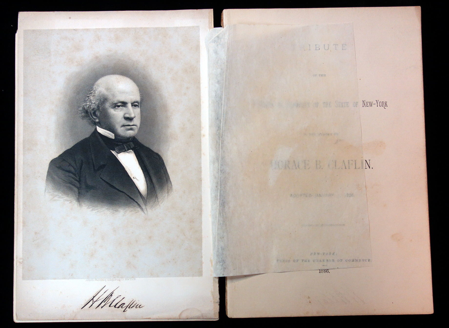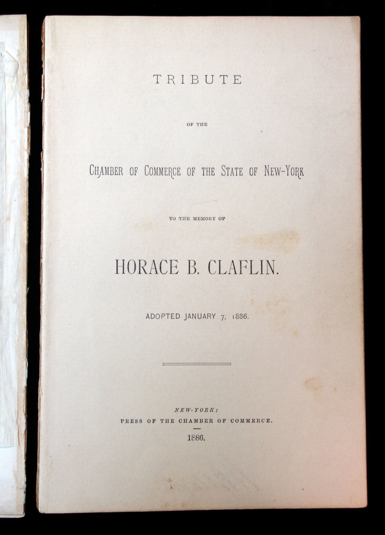New York: Atlantic Publishing & Engraving of New York, 1886. The front cover and first page of the booklet are detached. The title on the front cover is faded and hard to read. General soiling and toning due to age. The bulletin has been folded. The large format memoriam is trimmed on the edges.. Two items advertising the memorial of Horace Brigham Claflin who was an American merchant who founded the Bulkley & Claflin Company (later after Claflin's death it became known as H. B. Claflin Company). Over the years this bank was acquired many times, and is still in existence today under JP Morgan Chase. The first item is apparently from the Dry Goods Bulletin which serves as an memoriam/obituary for Claflin. The front side has an engraving of Claflin as well as his birth and death dates (December 18 ,1811 - November 14, 1885). The back side has a description of his life. Measures 14 1/4" x 12 3/4". The second item is a 16 pg booklet done by the New York Chamber of Commerce, that is the minutes of the meeting following Claflin's death as well as a biographical sketch of the man. The booklet states that "Mr. Claflin was one of the great merchants which the present century has produced, and his life and character present a striking illustration of the maxim, 'Act well your part, there all the honor lies.' " (pg. 3) The meeting end with several resolutions, one of which was "the entire community [of dry good merchants] are called upon to mourn the loss, not only of the most eminent member of their profession, but also of a true friend." (pg. 11, #1) This was accomplished when on the day of his funeral "the wholesale stores and commission houses throughout the dry goods district in New York City closed at noon, and business was suspended. That portion of the City usually so active and busy was silent and deserted." (pg. 15) The booklet also includes a portrait engraving of Claflin. Black covers. Measures 9 1/4" x 6" This was a dry good business that acted as middlemen between the manufacturers and retailers of dry goods. Additionally, he founded the Continental Bank of New York in 1870 along with Jacob H. Schiff, Marcellus Hartley, Robert L. Cutting and Joseph Seligman.
