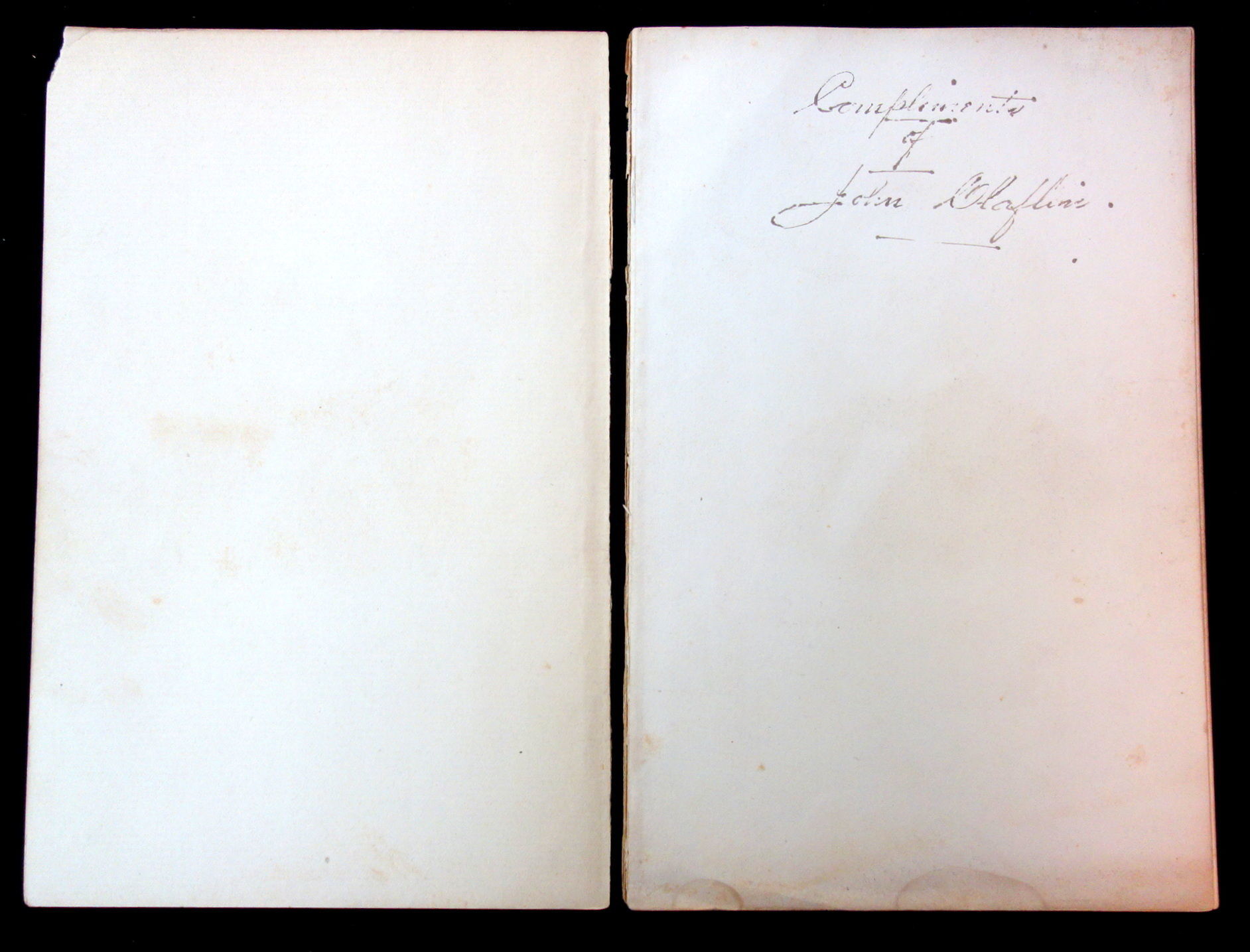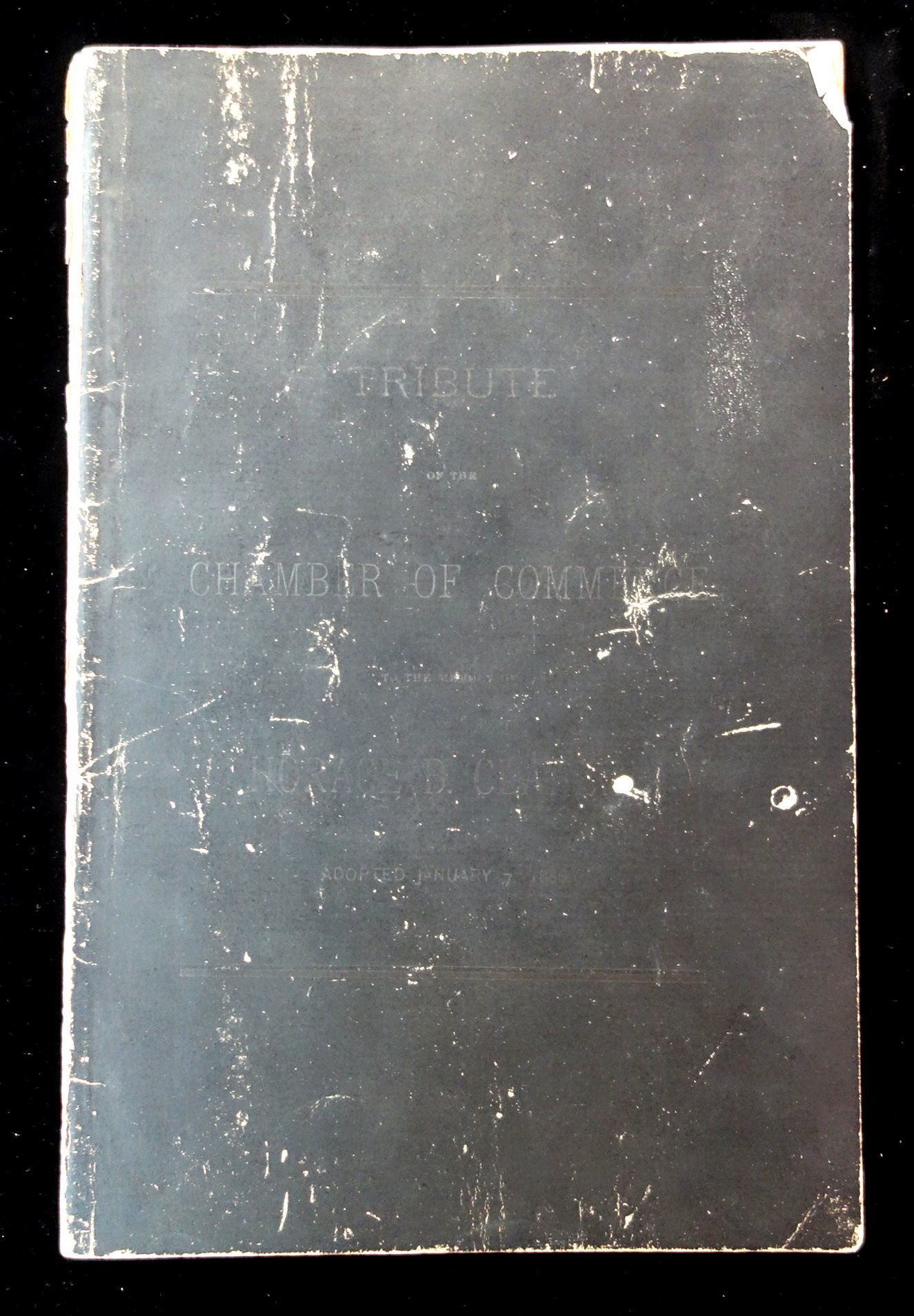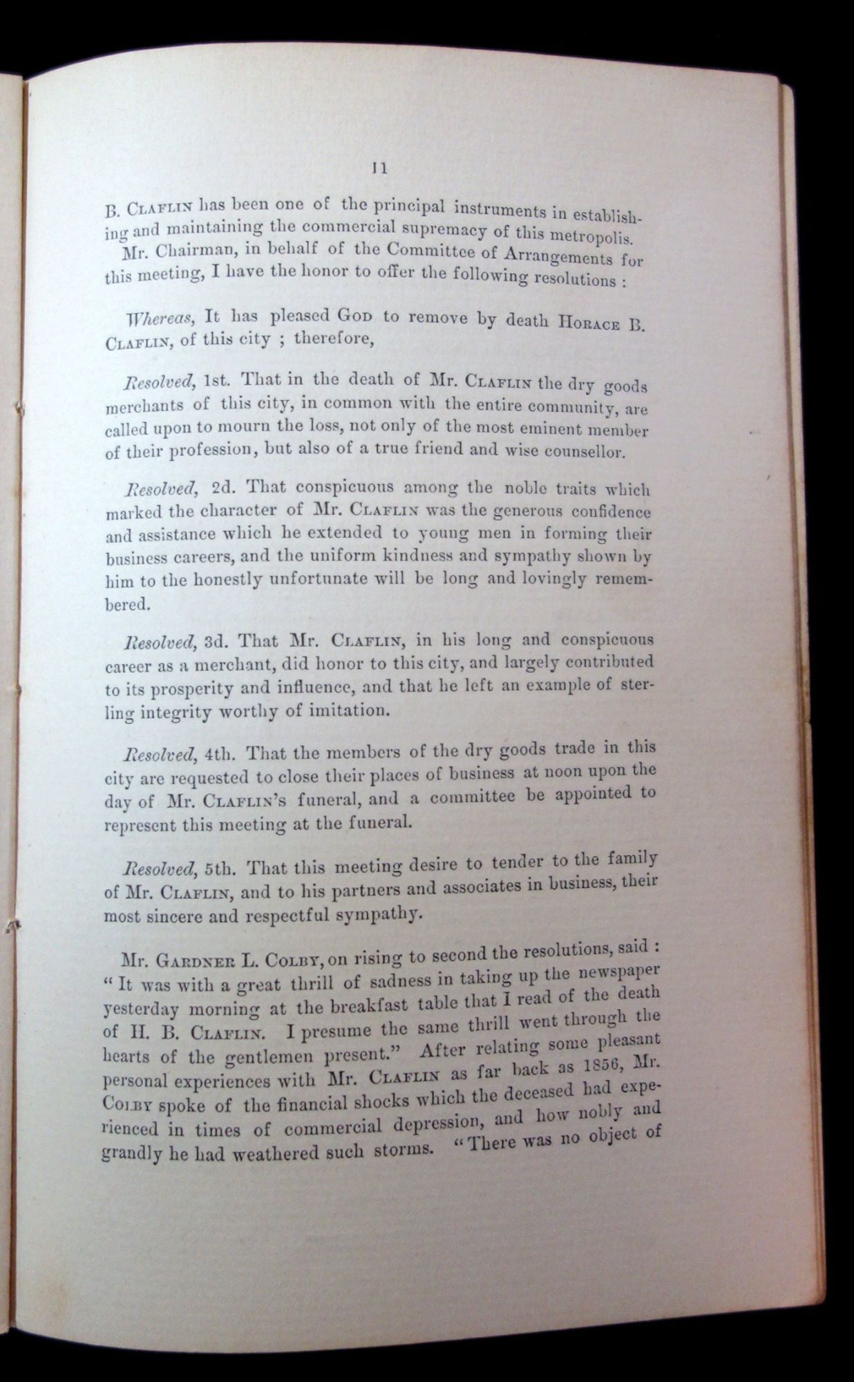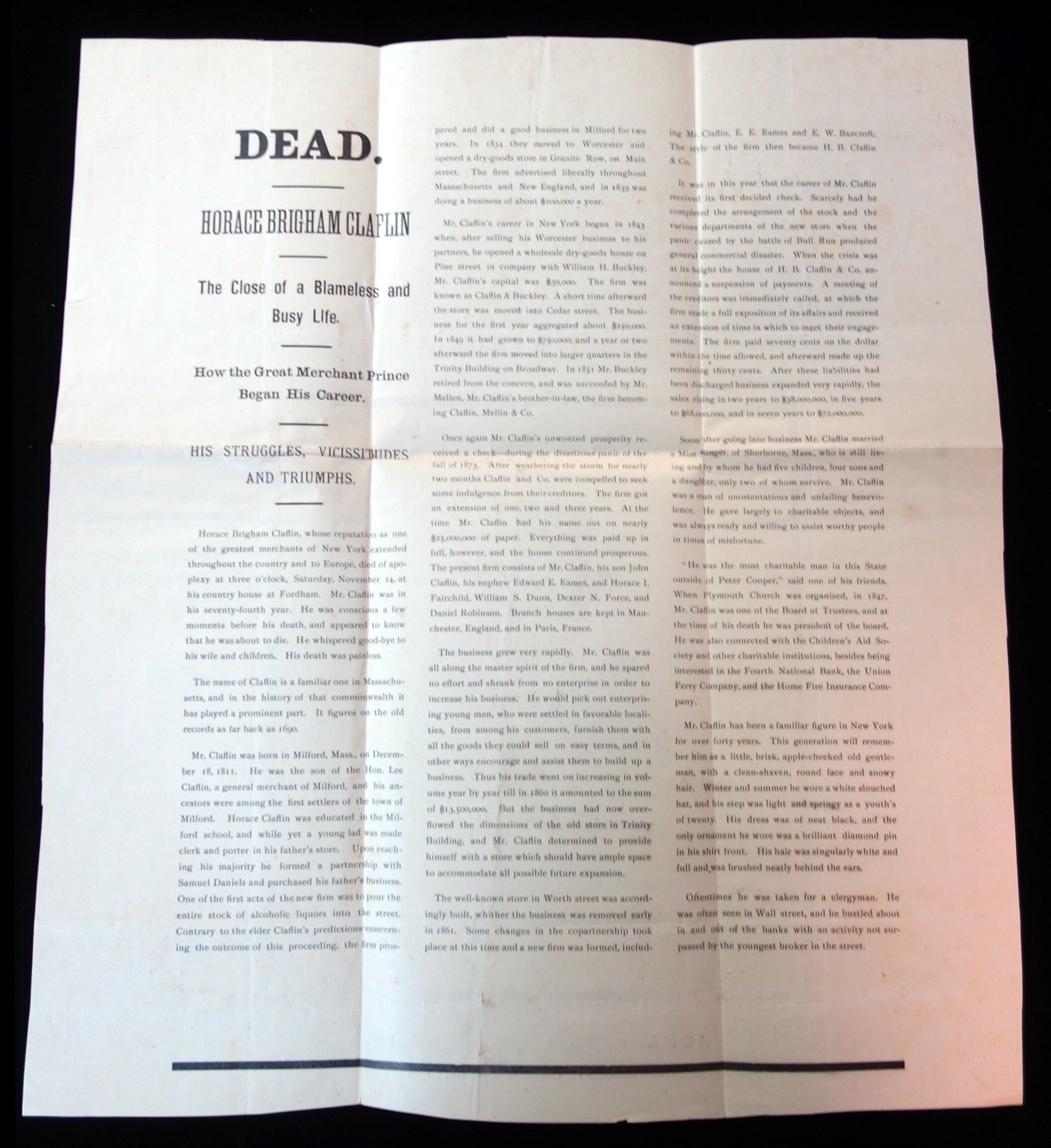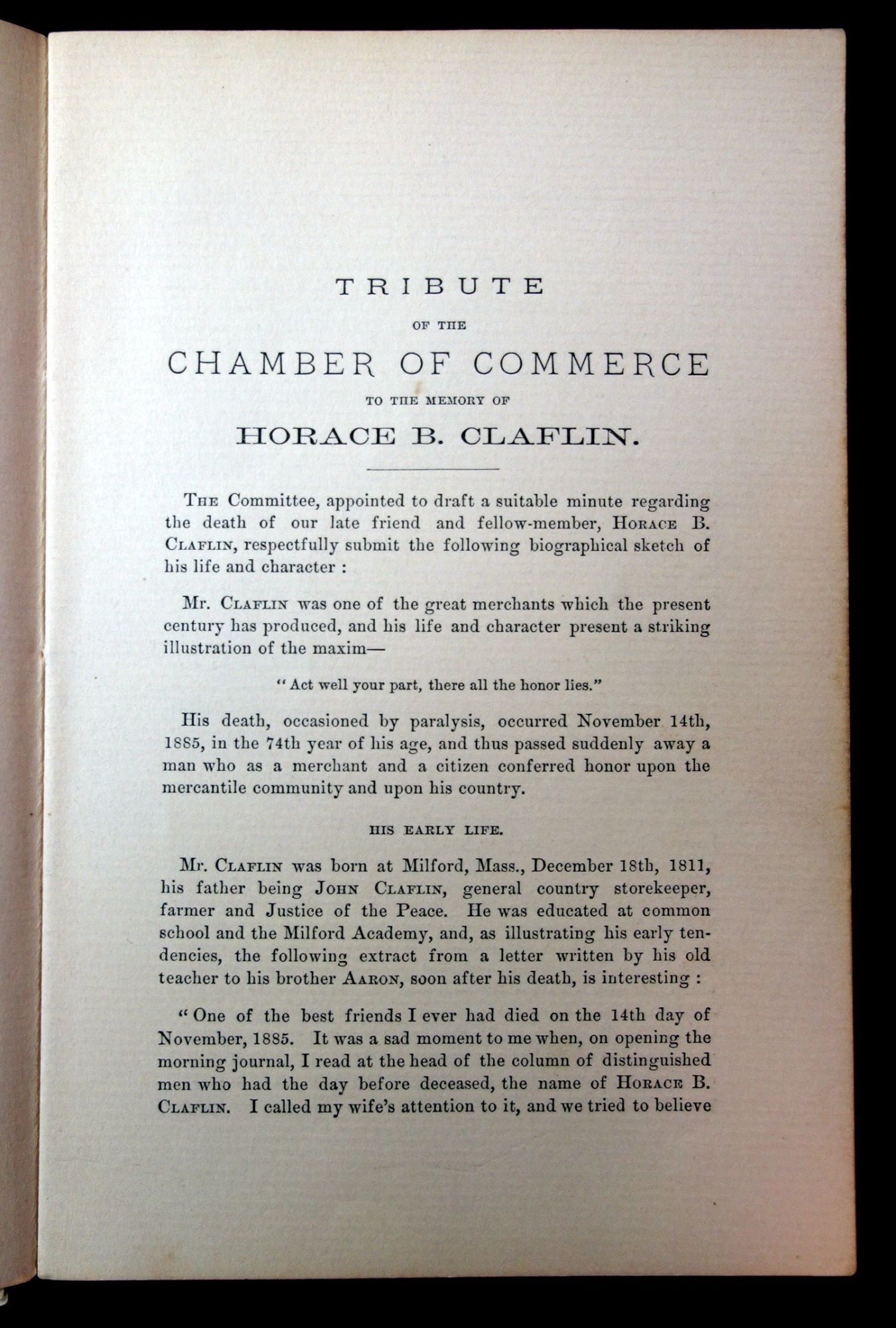 New York: Atlantic Publishing & Engraving of New York, 1886. The front cover and first page of the booklet are detached. The title on the front cover is faded and hard to read. General soiling and toning due to age. The bulletin has been folded. The large format memoriam is trimmed on the edges.. Two items advertising the memorial of Horace Brigham Claflin who was an American merchant who founded the Bulkley & Claflin Company (later after Claflin's death it became known as H. B. Claflin Company). Over the years this bank was acquired many times, and is still in existence today under JP Morgan Chase. The first item is apparently from the Dry Goods Bulletin which serves as an memoriam/obituary for Claflin. The front side has an engraving of Claflin as well as his birth and death dates (December 18 ,1811 - November 14, 1885). The back side has a description of his life. Measures 14 1/4" x 12 3/4". The second item is a 16 pg booklet done by the New York Chamber of Commerce, that is the minutes of the meeting following Claflin's death as well as a biographical sketch of the man. The booklet states that "Mr. Claflin was one of the great merchants which the present century has produced, and his life and character present a striking illustration of the maxim, 'Act well your part, there all the honor lies.' " (pg. 3) The meeting end with several resolutions, one of which was "the entire community [of dry good merchants] are called upon to mourn the loss, not only of the most eminent member of their profession, but also of a true friend." (pg. 11, #1) This was accomplished when on the day of his funeral "the wholesale stores and commission houses throughout the dry goods district in New York City closed at noon, and business was suspended. That portion of the City usually so active and busy was silent and deserted." (pg. 15) The booklet also includes a portrait engraving of Claflin. Black covers. Measures 9 1/4" x 6" This was a dry good business that acted as middlemen between the manufacturers and retailers of dry goods. Additionally, he founded the Continental Bank of New York in 1870 along with Jacob H. Schiff, Marcellus Hartley, Robert L. Cutting and Joseph Seligman.