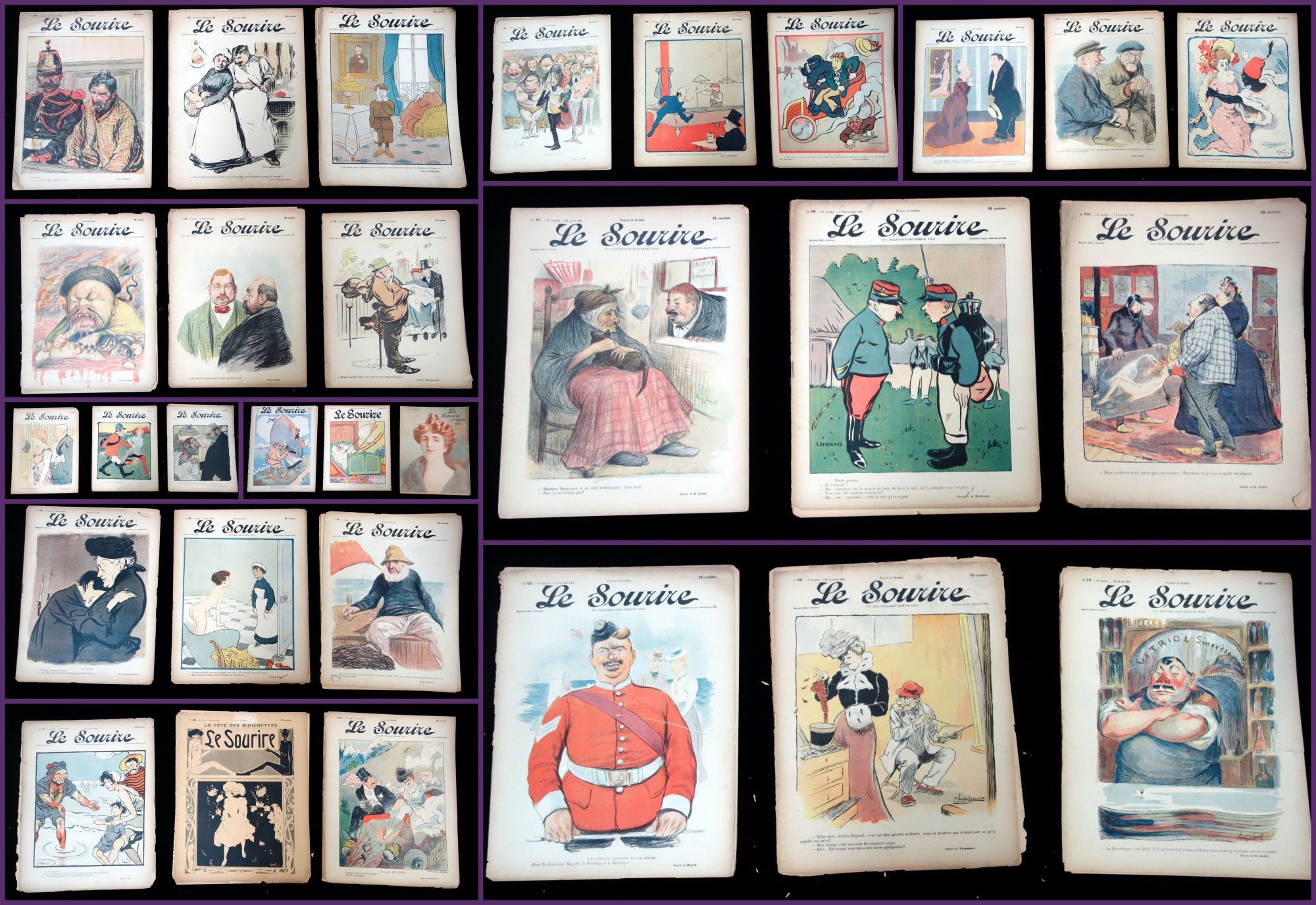 Paris, France, 1913.  The journal's pages are fragile and brittle, as well as toned and soiled due to age. The edges of the pages are sometimes torn. Two editions have tears on the cover. The journals have staple binding, the majority of which is damaged, and therefore pages are loose or detached on most of the editions. With the exception of one edition (#304), all them appear to be complete. #304, id missing at least the back cover, but as the pages are unnumbered, it might be missing more..  A collection of thirty (30) issues of "Le Sourire", a French illustrated humorist serial publication under the direction of Maurice Mery and Alphonse Allais. It was a weekly publication, normally issued on Saturdays. Le Sourire, meaning the Smile, was launched in 1889 and ran continuously till 1939, with the exception a few brief years where publication ceased due to World War I. The serial was intended to compete with a similar journal known as Le Rire (The Laugh). Each issue features a color illustration on the front and back cover, while several black and white illustrations, ranging in size from small vignettes to full page works. Additionally there are short stories, articles, and advertisements (all in French). The magazines provided a great resource for both artistic and political Parisian culture at the time. The bulk of collection (22 issues) are from 1900-1901, however there are issues as late as 1913. The numbering of each issue was originally numbered consecutively, even as years past. At some point, they switched over to restarting the numbering at the beginning of each year, while including the year in publication. The issues within the collection are as follows: