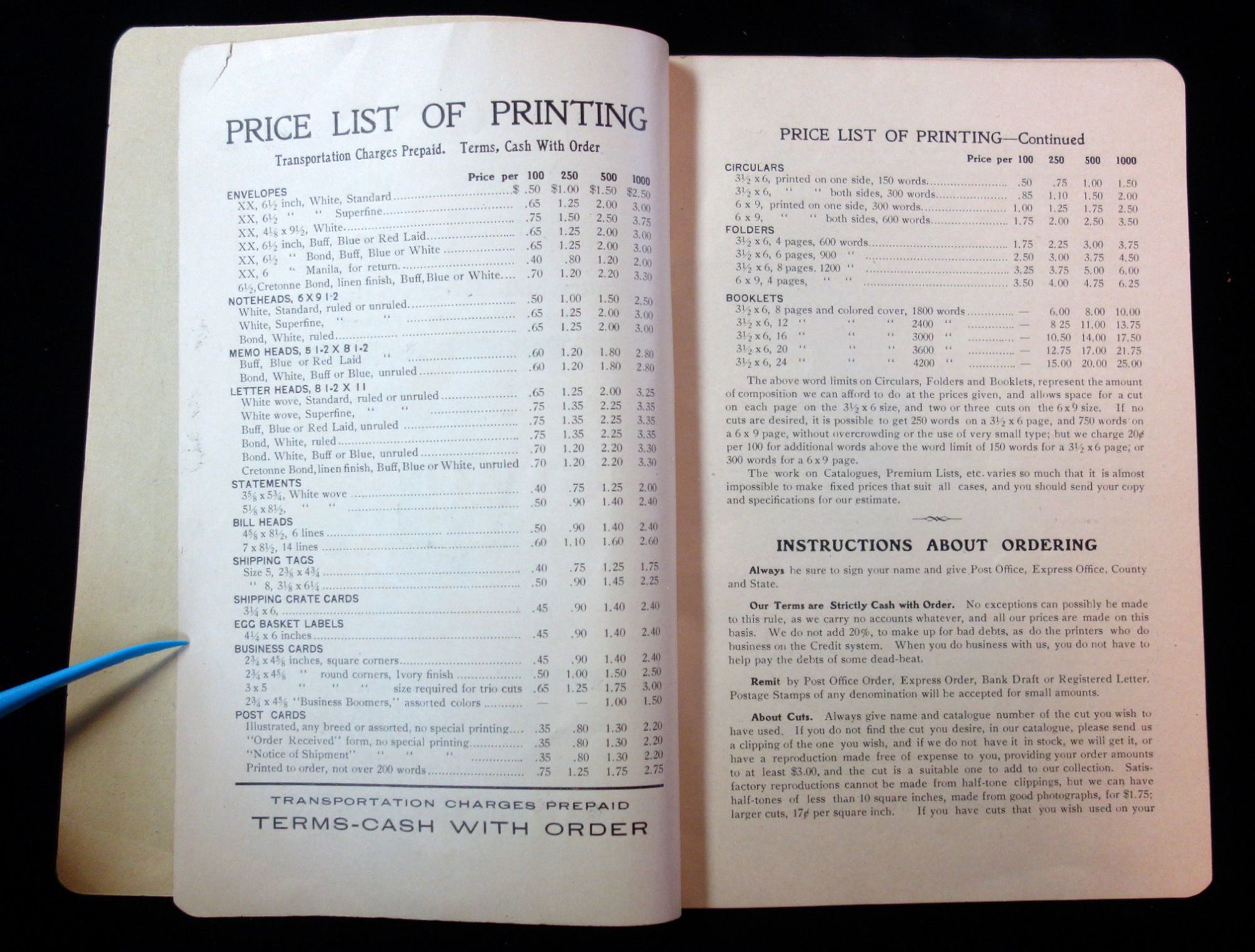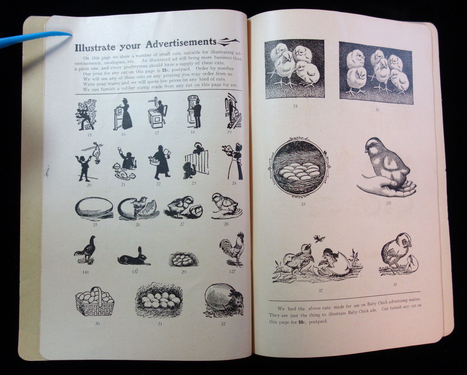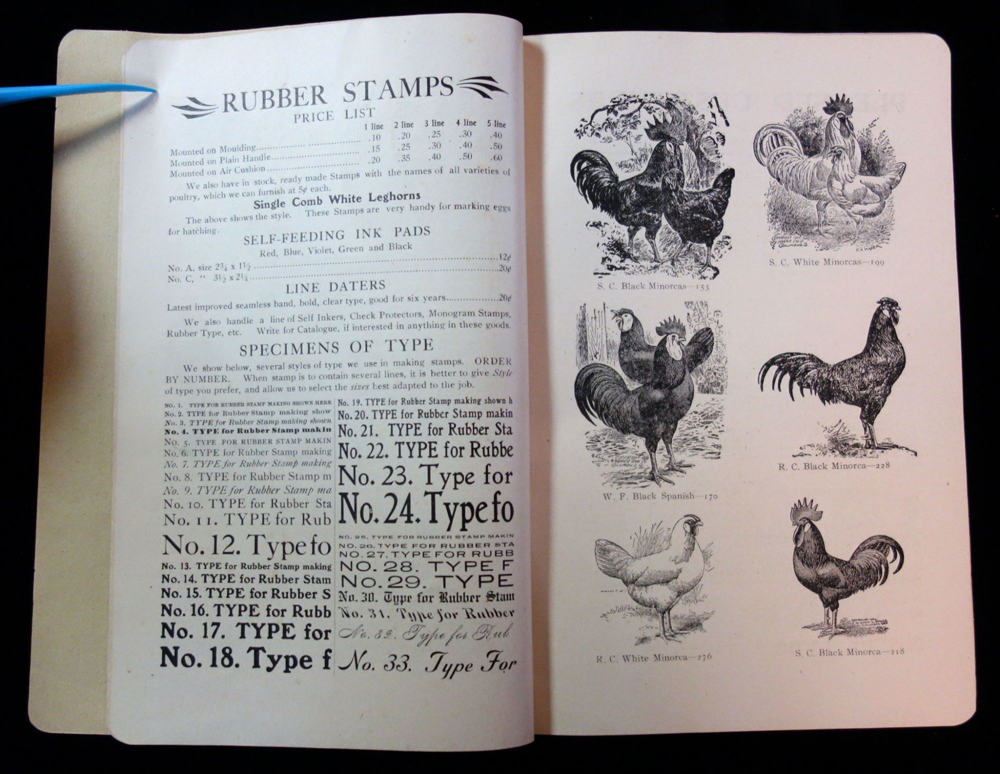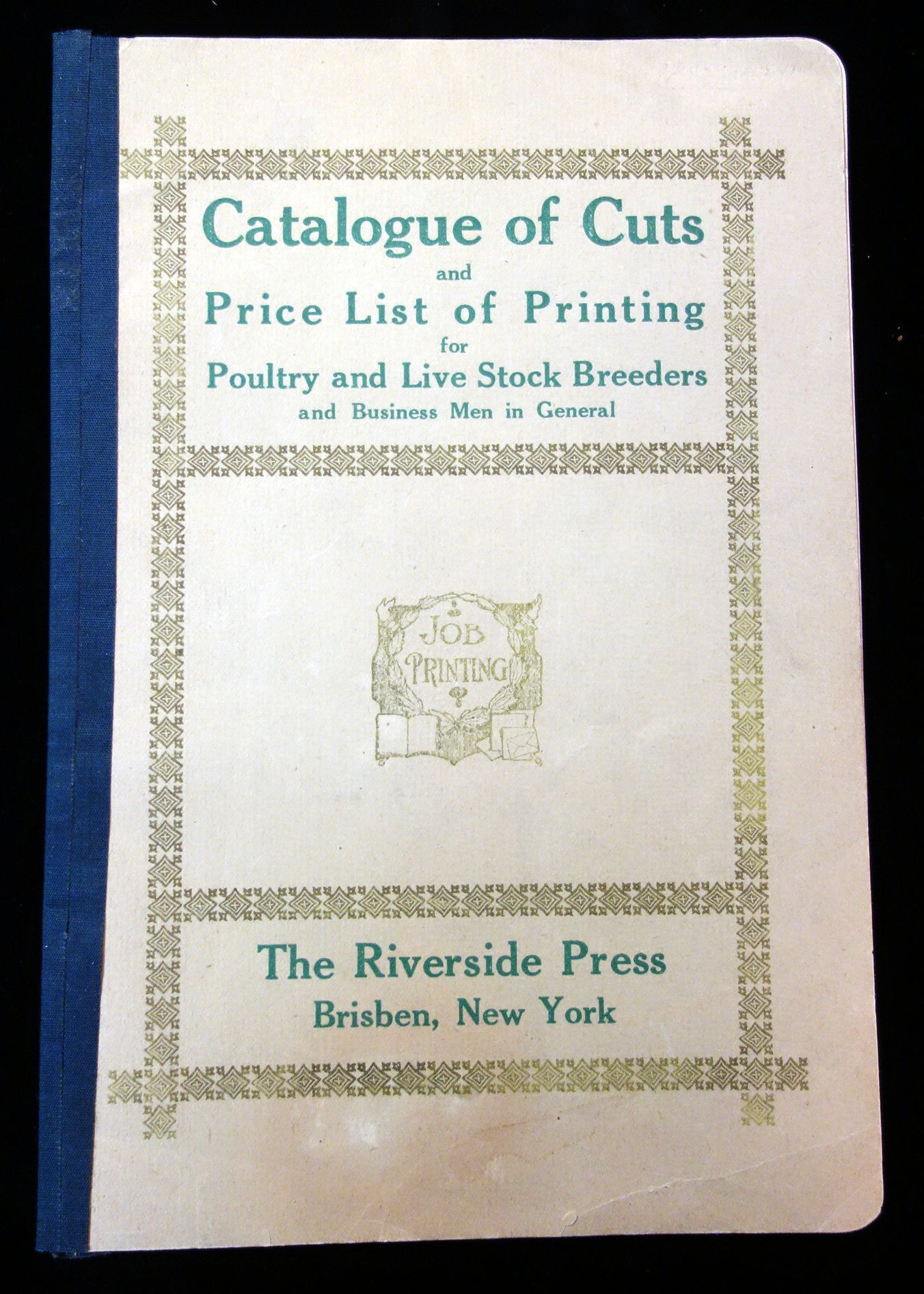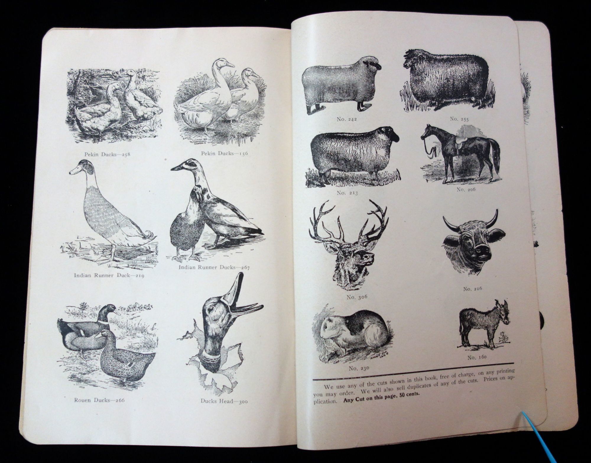 New York: Riverside Press. Tape repair on binding. Minor toning an soiling due to age.. A catalogue that list and provides examples of illustrations that Poultry and Live Stock Breeders can use while advertising their products. At the beginning there is a price list for different sizes of envelopes, note head, memo head, letter heads, statements, shipping tags, post cards, circulars, folders and booklets. There are approximately 165 different images of live stock that farmers could choose from to help advertise their goods. While the majority of the images are of chickens (different kinds of chicks, hens, and roosters) there are also images of ducks, pigs, rabbits, dogs, turkeys, sheep, and goats. Additionally there are several fonts one can use from. 40 pg (including covers). Staple booklet. Measures 9" x 6