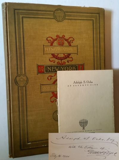 New York: Moses King, 1903. Cloth. Very Good. A very important Association copy -- and a significant piece of turn-of-the-century New York history. INSCRIBED BY MOSES KING (in February 1904) TO ADOLPH S. OCHS, THE PUBLISHER AND OWNER OF THE NEW YORK TIMES (1896-1935) AND A MAJOR FORCE IN THE GROWTH OF NEW YORK AS A WORLD-CLASS CITY. A solid, very presentable copy to boot of the 1903 installation of this photographic tribute to New York, both overseen and published by the powerful Moses King, himself a formidable figure in the world of New York movers and shakers. This copy is solid and VG to VG+ in its tan cloth, with bright gilt-titling to the front panel. Light wear at the spine ends and the tips, mild rubbing along the front panel's bottom-edge and very light soiling to the rear panel. Folio, hundreds of crisp black-and-white plates glorifying the city's architectural acheivements. Laid-into this copy is a hand-sewn, uncommon 1933 booklet called "Adolph S. Ochs at Seventy-Five", which pays tribute to the publisher's accomplishments from the perspective of Jewish theology and ideals.