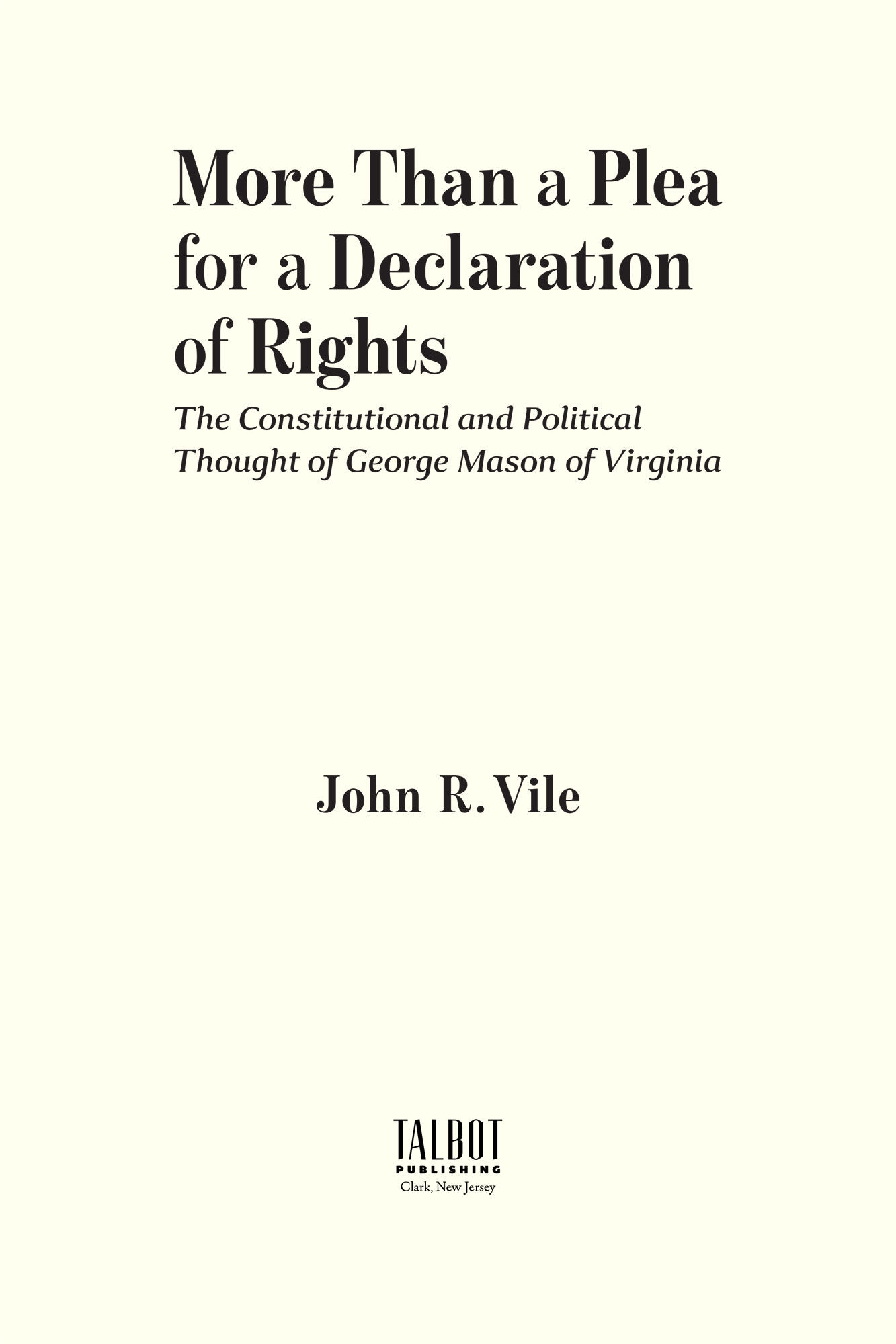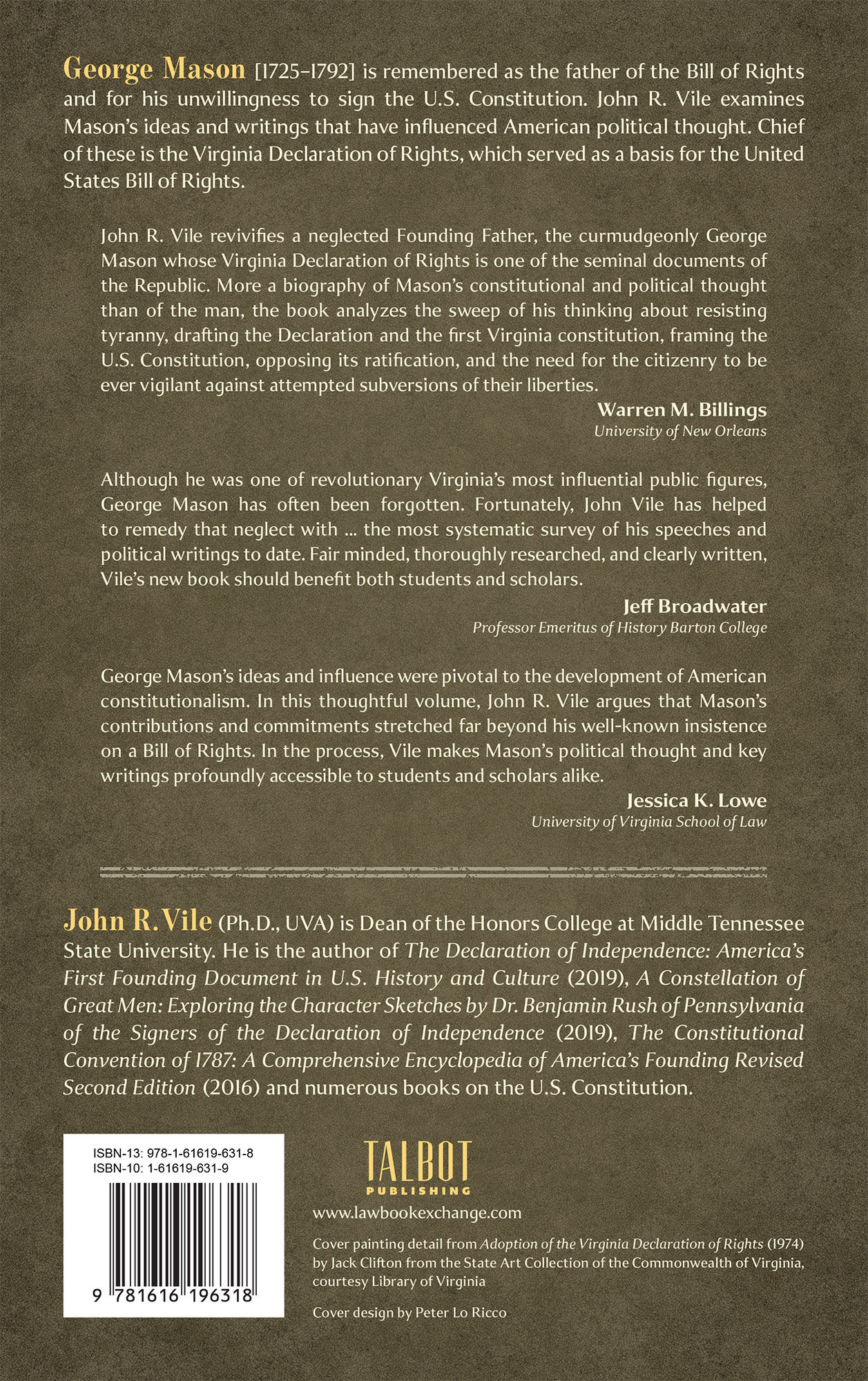 2019. ISBN-13: 9781616196318. ISBN-10: 1616196319. Vile, John R. More Than a Plea for a Declaration of Rights: The Constitutional and Political Thought of George Mason of Virginia. xxi, 271 pp. Clark, New Jersey: Talbot Publishing (an imprint of The Lawbook Exchange, Ltd.), 2019. ISBN-13: 9781616196318. ISBN-10: 1616196319. Hardcover. New. $75. * George Mason [1925-1792] is remembered as the father of the Bill of Rights and for his unwillingness to sign the U.S. Constitution. Here John R. Vile examines Mason's political philosophy and writings that have influenced American political thought. Chief of these is the Virginia Declaration of Rights which served as a basis for the United States Bill of Rights. "John R. Vile revivifies a neglected Founding Father, the curmudgeonly George Mason whose Virginia Declaration of Rights is one of the seminal documents of the Republic. More a biography of Mason's constitutional and political thought than of the man, the book analyzes the sweep of his thinking about resisting tyranny, drafting the Declaration and the first Virginia constitution, framing the U.S. Constitution, opposing its ratification, and the need for the citizenry to be ever vigilant against attempted subversions of their liberties." -- Warren M. Billings, University of New Orleans "Although he was one of revolutionary Virginia's most influential public figures, George Mason has often been forgotten. Fortunately, John Vile has helped to remedy that neglect with . the most systematic survey of his speeches and political writings to date. Fair minded, thoroughly researched, and clearly written, Vile's new book should benefit both students and scholars." -- Jeff Broadwater, Professor Emeritus of History, Barton College "George Mason's ideas and influence were pivotal to the development of American constitutionalism. In this thoughtful volume, John R. Vile argues that Mason's contributions and commitments stretched far beyond his well-known insistence on a Bill of Rights. In the process, Vile makes Mason's political thought and key writings profoundly accessible to students and scholars alike." -- Jessica K. Lowe, University of Virginia School of Law John R. Vile (Ph.D., UVA) is Dean of the Honors College at Middle Tennessee State University. He is the author of The Declaration of Independence: America's First Founding Document in U.S. History and Culture (2019), A.