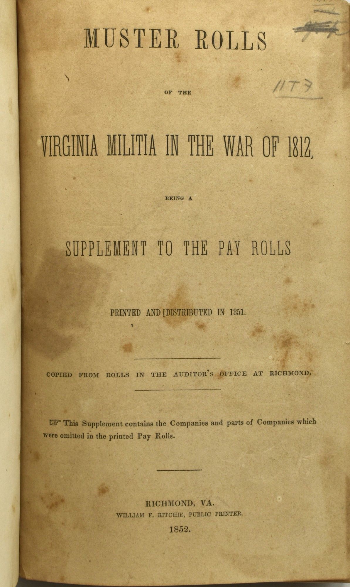 Richmond, Va: William F. Ritchie, 1852. This Supplement contains the Companies and parts of Companies which were omitted in the printed Pay Rolls". 858 pp. In contemporary marbled boards; rebacked, with a new spine and new leather label. Uncommon.