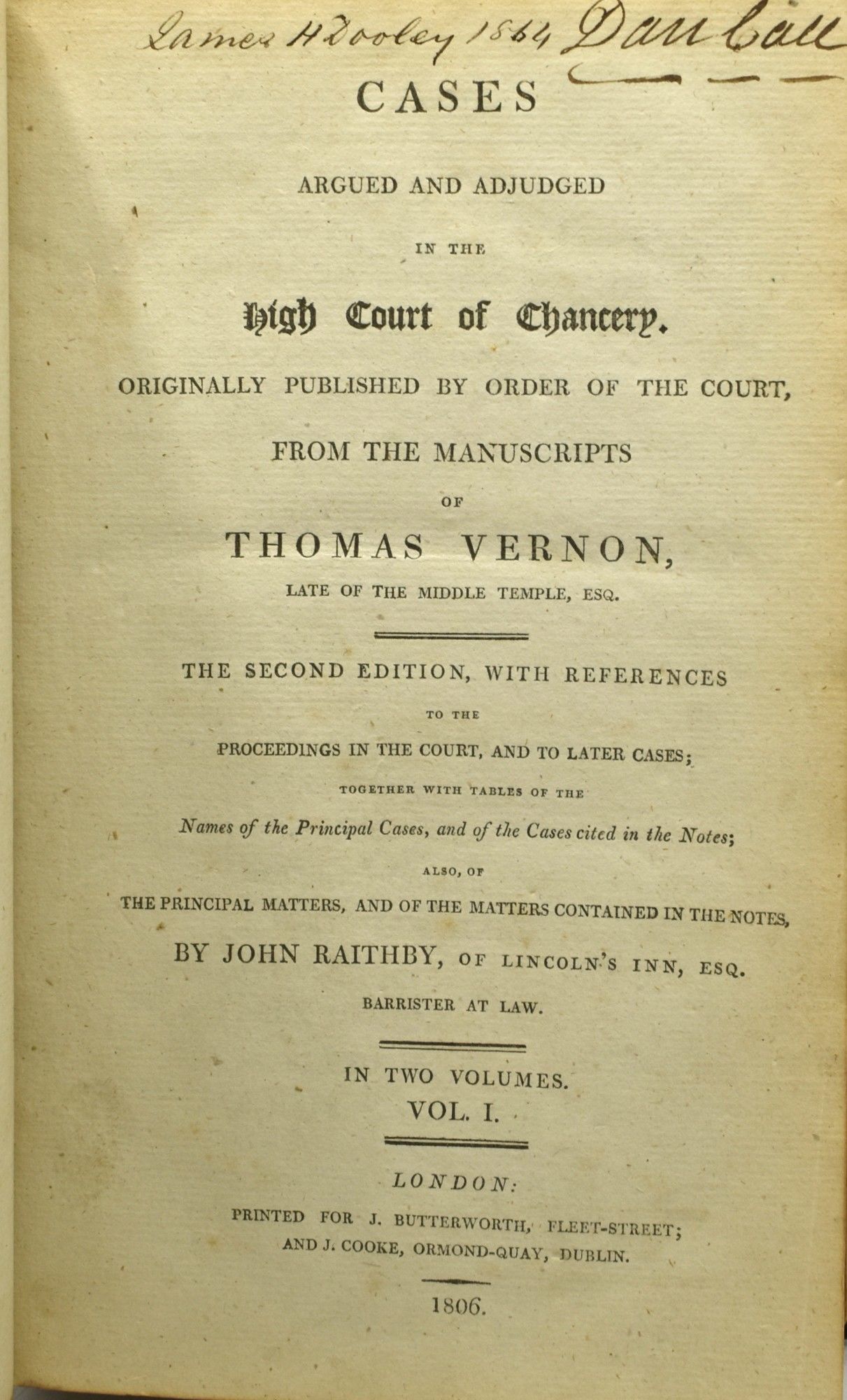 CASES ARGUED AND ADJUDGED IN THE HIGH COURT OF CHANCERY. ORIGINALLY PUBLISHED BY ORDER OF THE COURT, FROM THE MANUSCRIPTS OF THOMAS VERNON, LATE OF THE MIDDLE TEMPLE, ESQ. THE SECOND EDITION, WITH REFERENCES TO THE PROCEEDINGS IN THE COURT, AND TO LATER CASES; TOGETHER WITH TABLES OF THE NAMES OF THE PRINCIPAL CASES, AND OF THE CASES CITED IN THE NOTES; ALSO, OF THE PRINCIPAL MATTERS, AND OF THE MATTERS CONTAINED IN THE NOTES, BY JOHN RAITHBY, OF LINCOLN'S INN, ESQ. BARRISTER AT LAW. IN TWO VOLUMES. VOL. I. (ONE VOLUME ONLY)