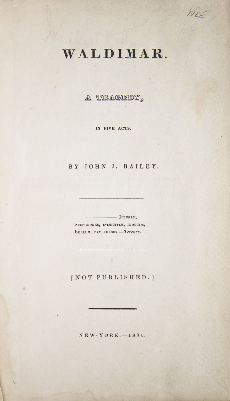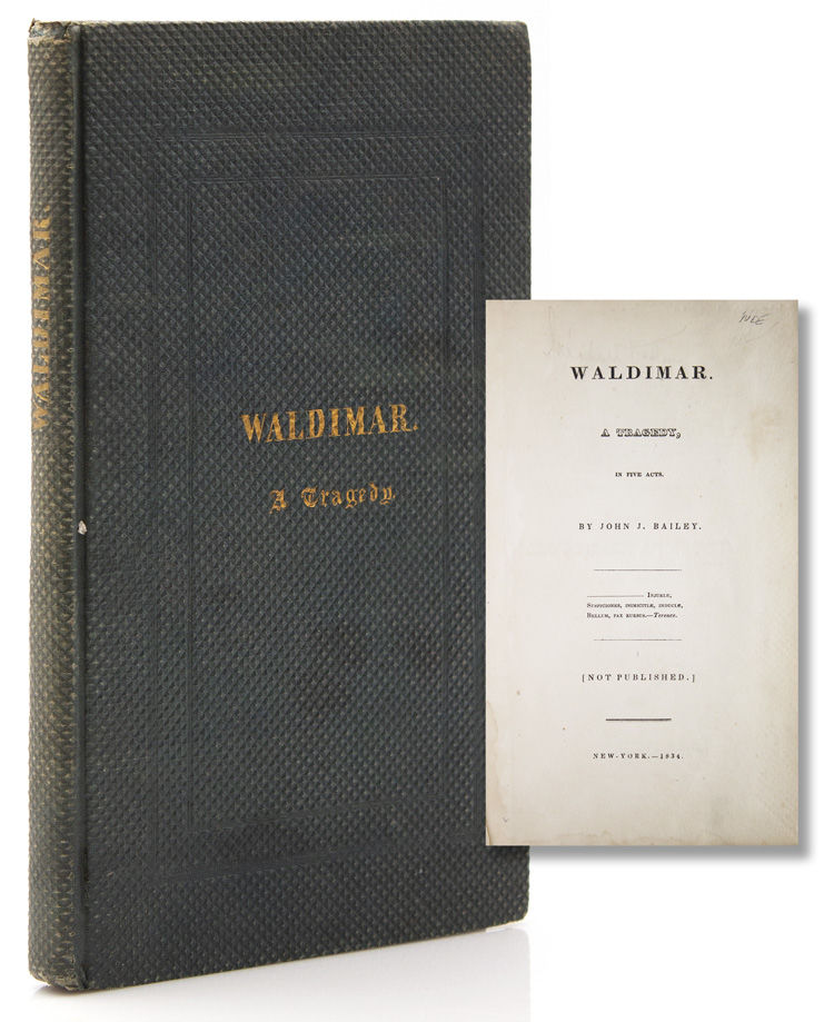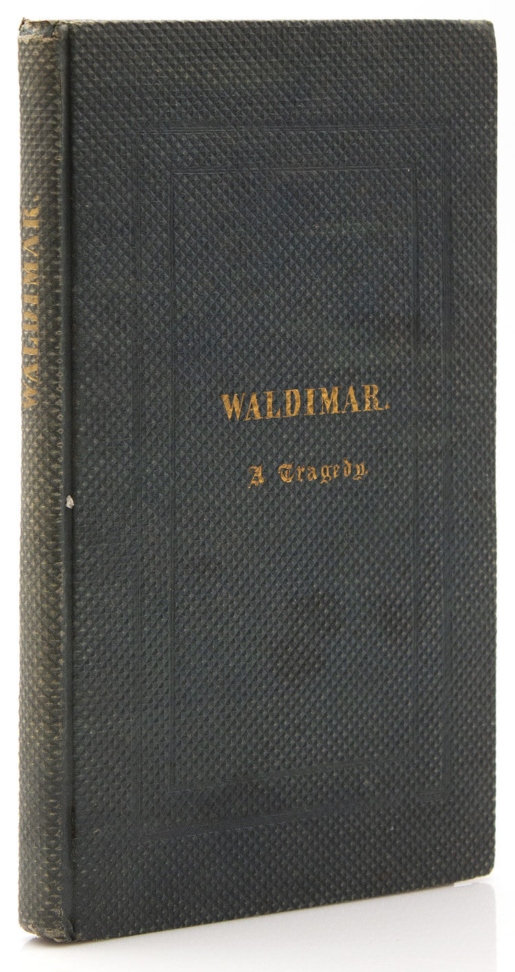 New York: privately printed, 1834. 124, [2], 6 pp. 1 vols. 8vo. Original forest green diapered cloth lettered in gilt on upper cover and spine. Minor staining to six or seven leaves, a little wear at head of spine, f.f.e.p. removed, otherwise very good. 124, [2], 6 pp. 1 vols. 8vo. A copy in the original cloth of this "not published" American verse tragedy, with the title role written for Charles Kean. "It was first produced at the Park Theatre, November 1, 1831, and Ireland remarks that 'having many passages of rare merit,' it deserved more than the four nights' representation. Kean brought it to Philadelphia, however, and it was simply another instance of a fine play being absorbed by a star whose main interest lay elsewhere. Waldimar is laid in Thessalonica at the close of the fourth century during the reign of Theodosius the Great. The massacre is a historical fact, used before by Brockden Brown, but the characters and the plot are entirely fictitious. It is quite a distinguished play…" (Quinn, A History of the American Drama (1923), p 254). Sabin 2736