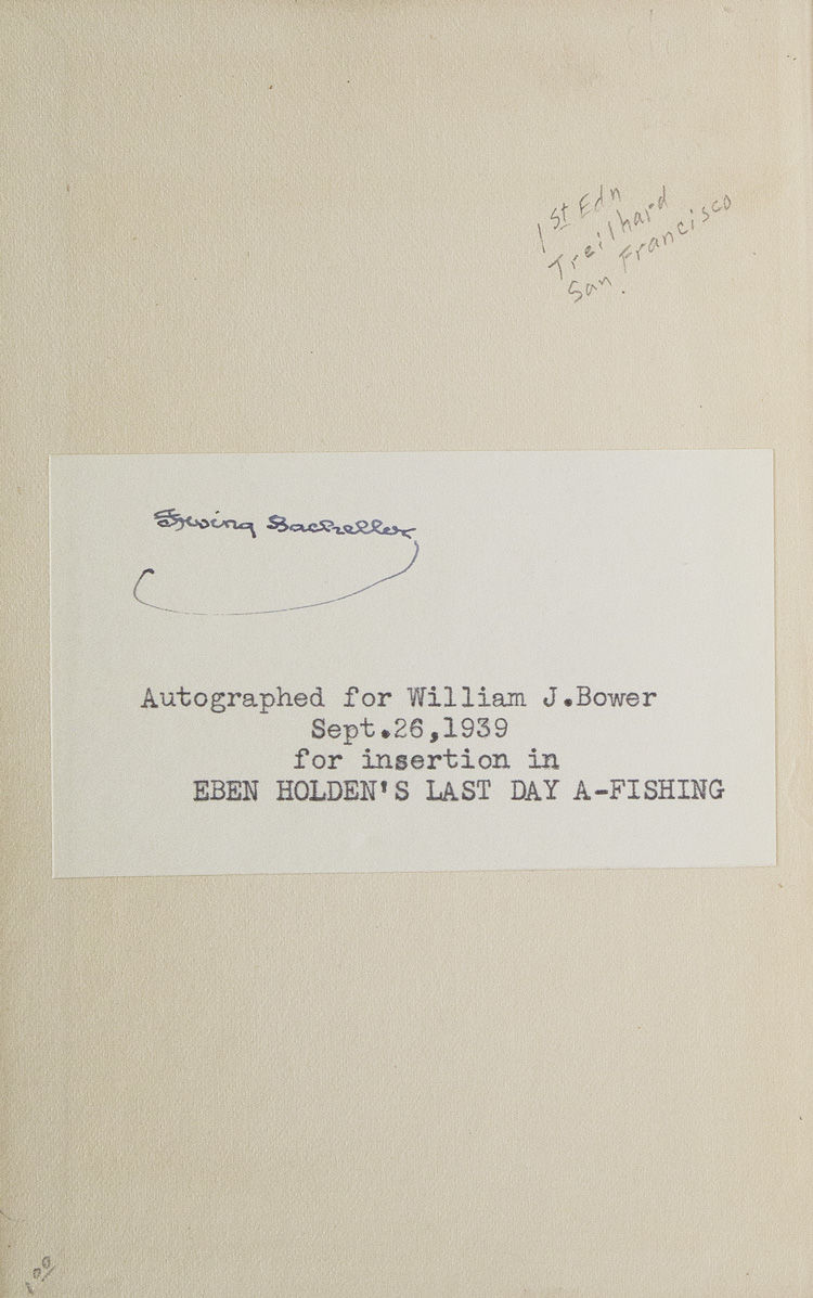 Signed in his fine hand on a typed slip reading: “Signed for William J. Bower Sept 26th, 1939, for insertion in Eben Holden’s Last Day A-Fishing”.